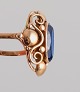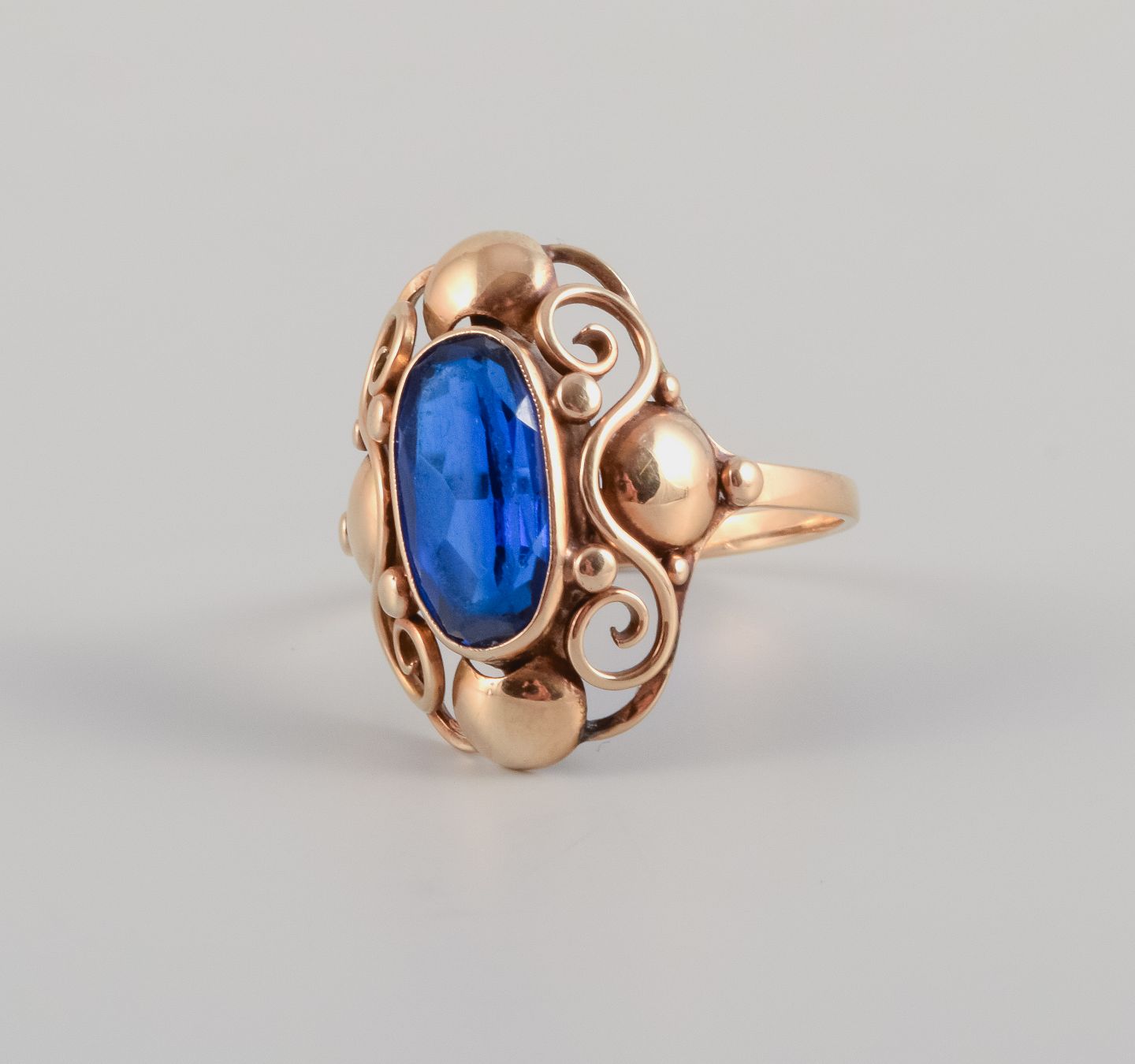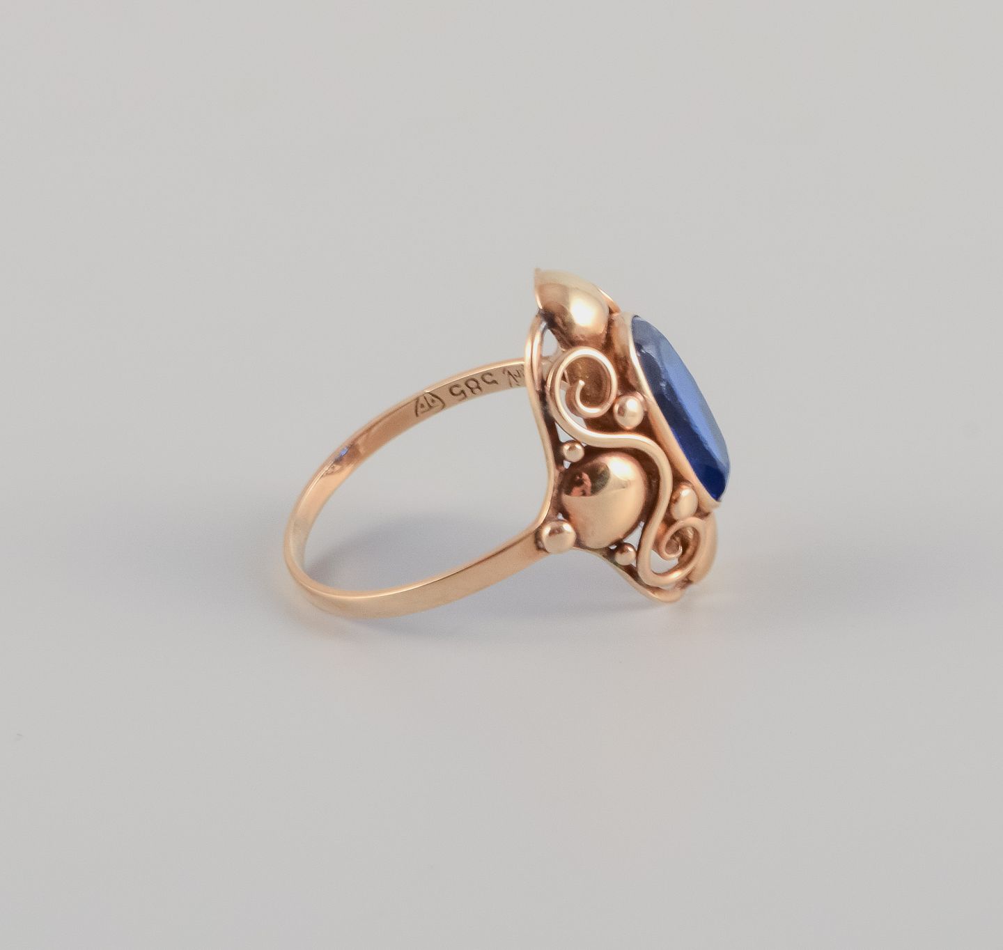 14 karat guldring prydet med blå halvædelsten, dansk guldsmed, ca. 1950erne.