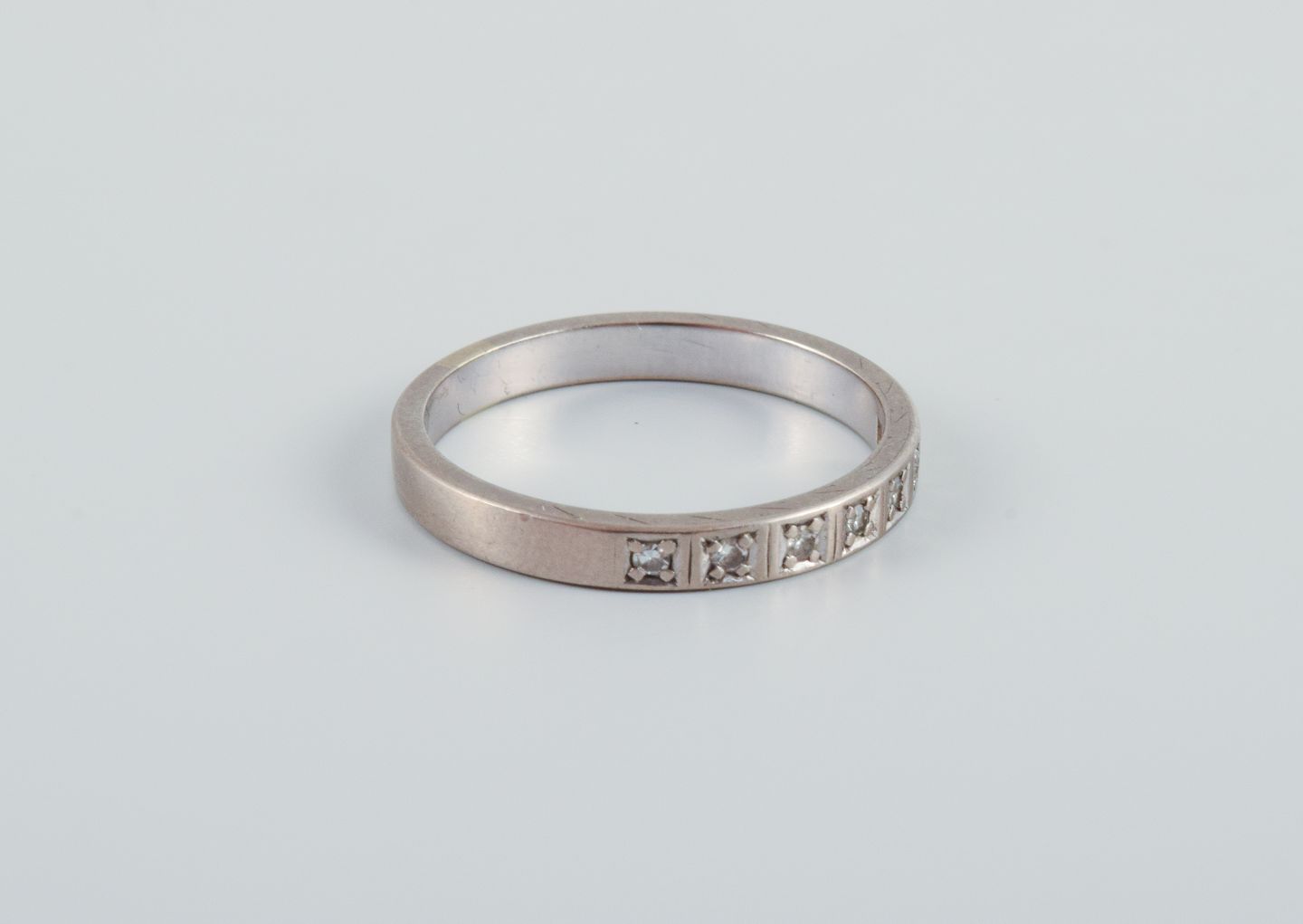 Scandinavian goldsmith. Classic engagement ring in white gold adorned with seven diamonds. Unmarked. Measured to 18 carat. Ring size 18mm. US size: 8.00