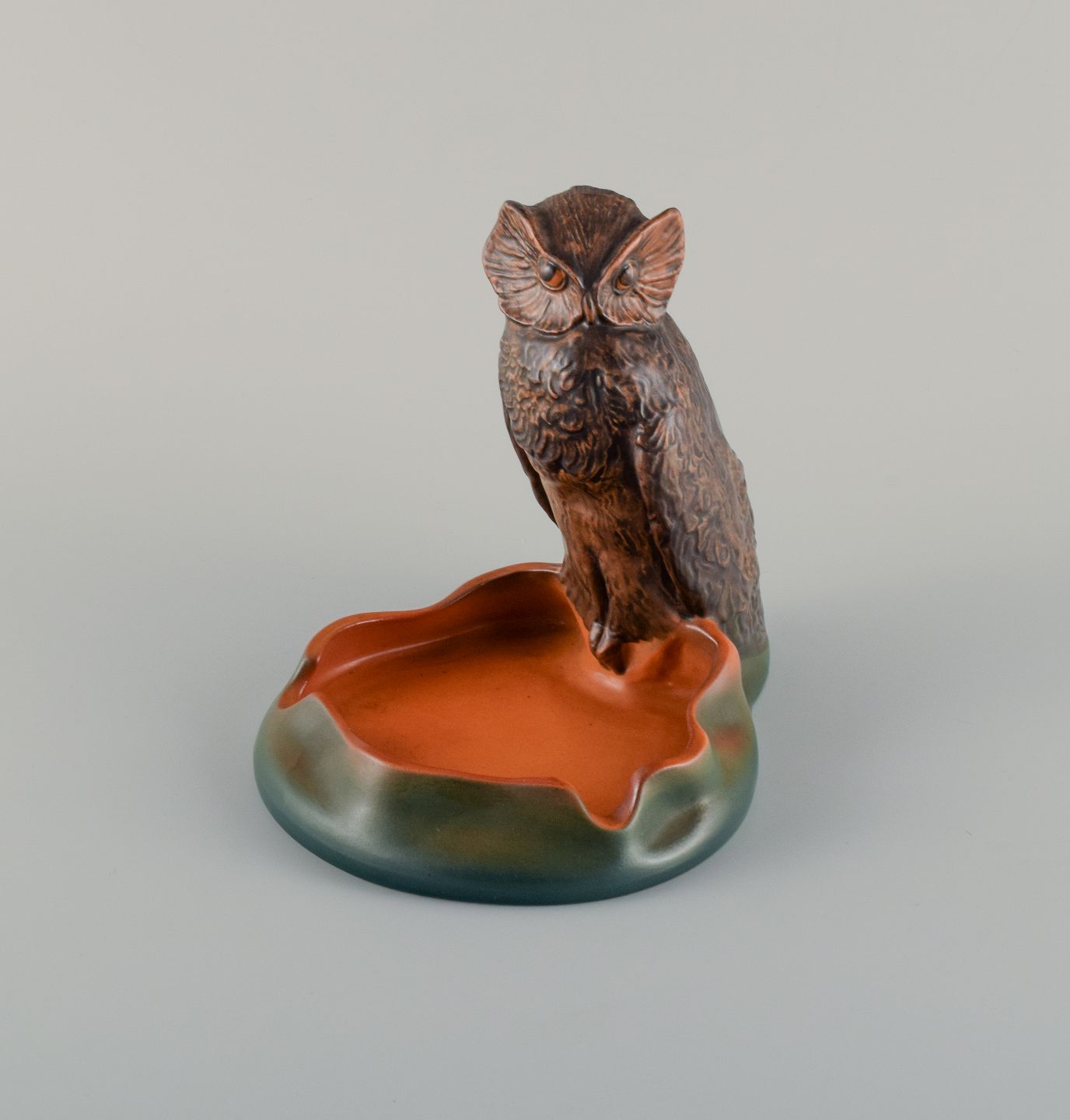 Ipsens enke, Danmark. Skål i håndmalet keramik modelleret med ugle. 1920/30'erne. Modelnummer 142. Måler: 17,0 x 16,0 cm. I flot stand. Stemplet.
