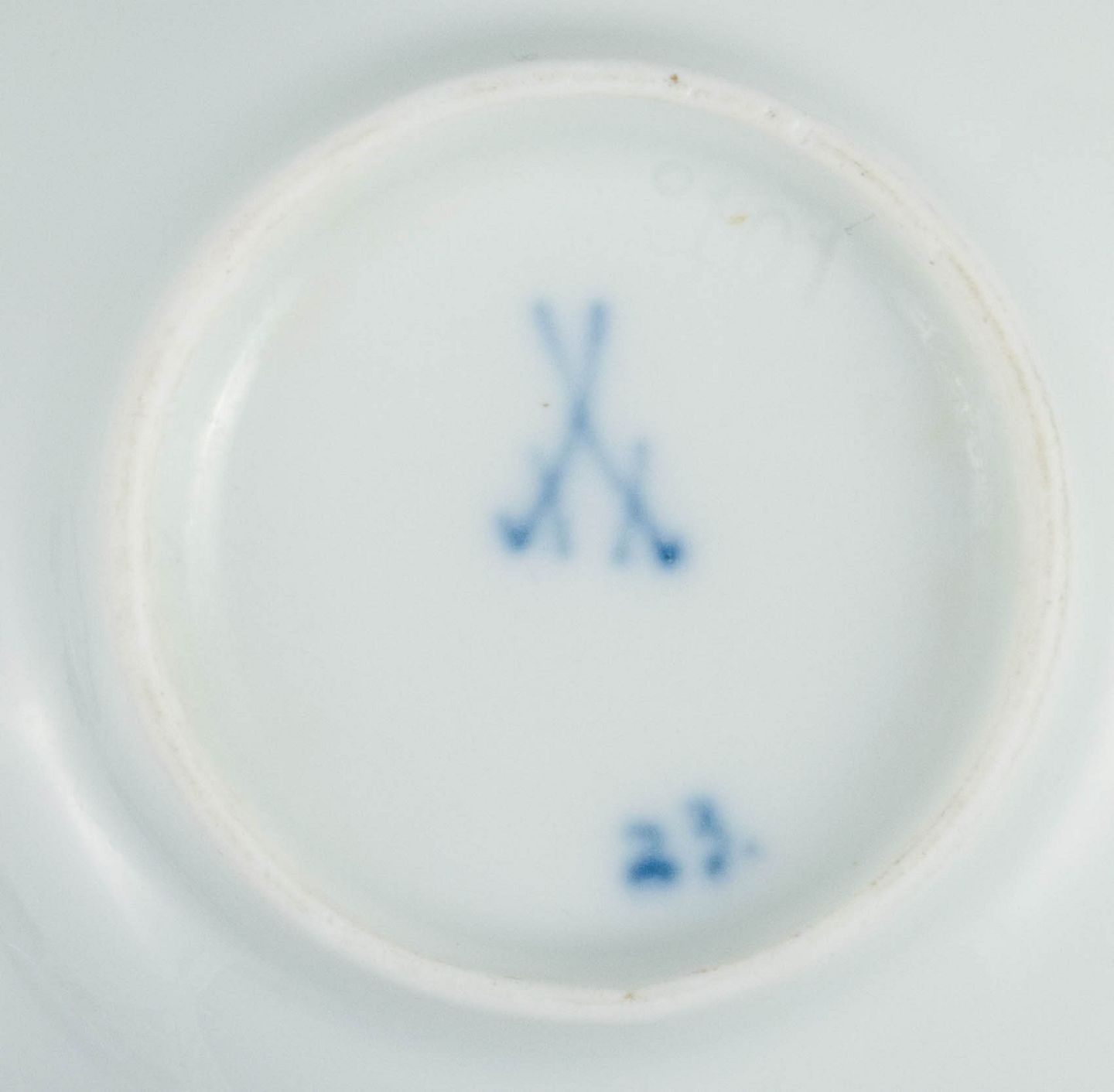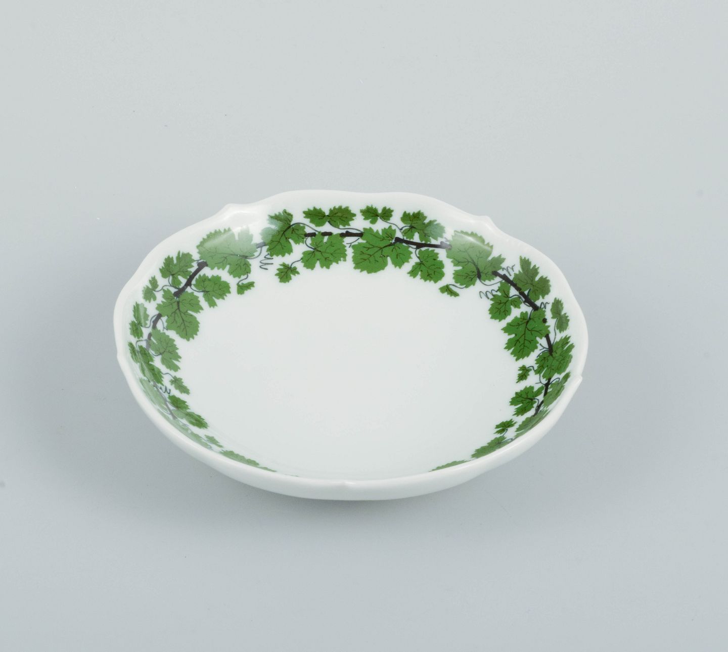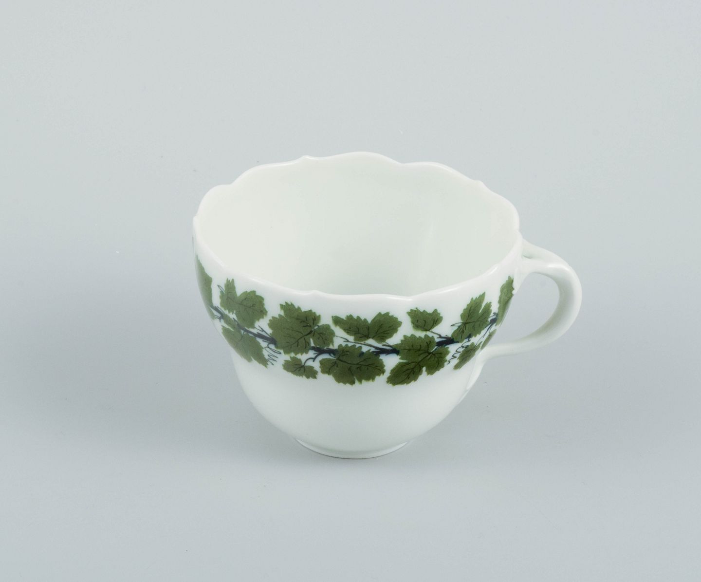 Seks Meissen Green Ivy Vine Leaf kaffekopper med underkopper i håndmalet porcelæn.