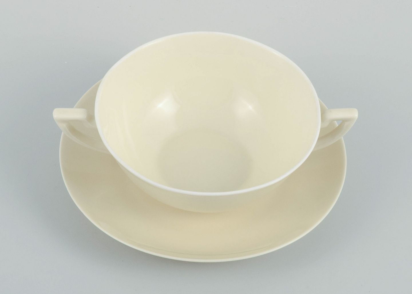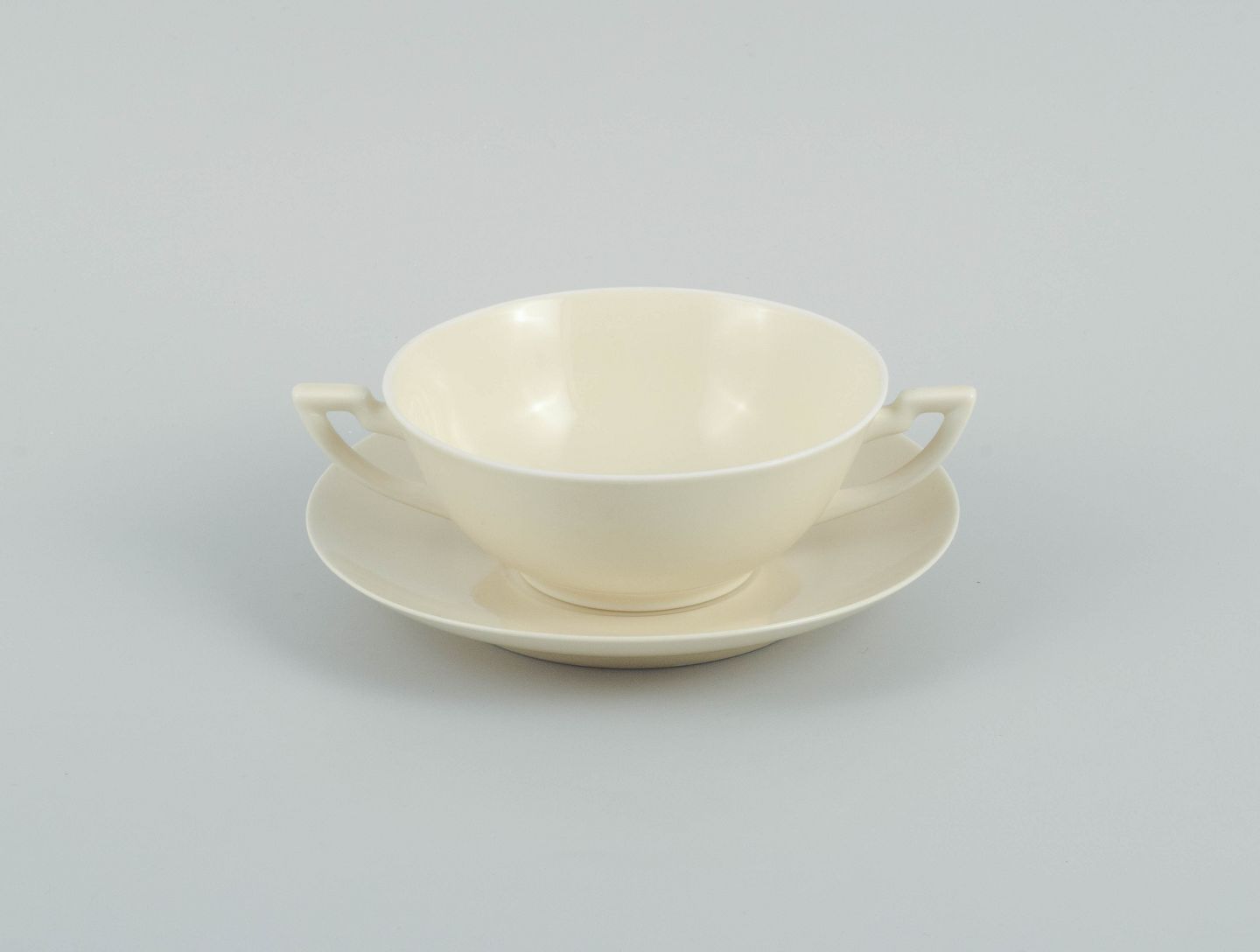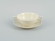 Ni par Royal Copenhagen cremefarvede bouillon-kopper med tilhørende underkopper. Dateret 1953. I flot stand. 3. sortering Stemplet. Kop: H 5,5 x D 13,0 uden hank. Underkop: D 17 cm.