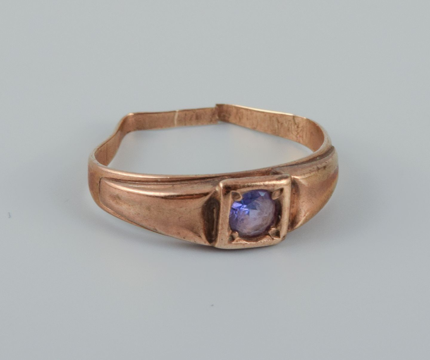 Dansk guldsmed. Guldring med lilla halvædelsten i art deco design. 1930/40’erne. Målt til 14 karat. Stemplet ”SH” 19 mm. Ringen er klippet op og dermed justerbar.