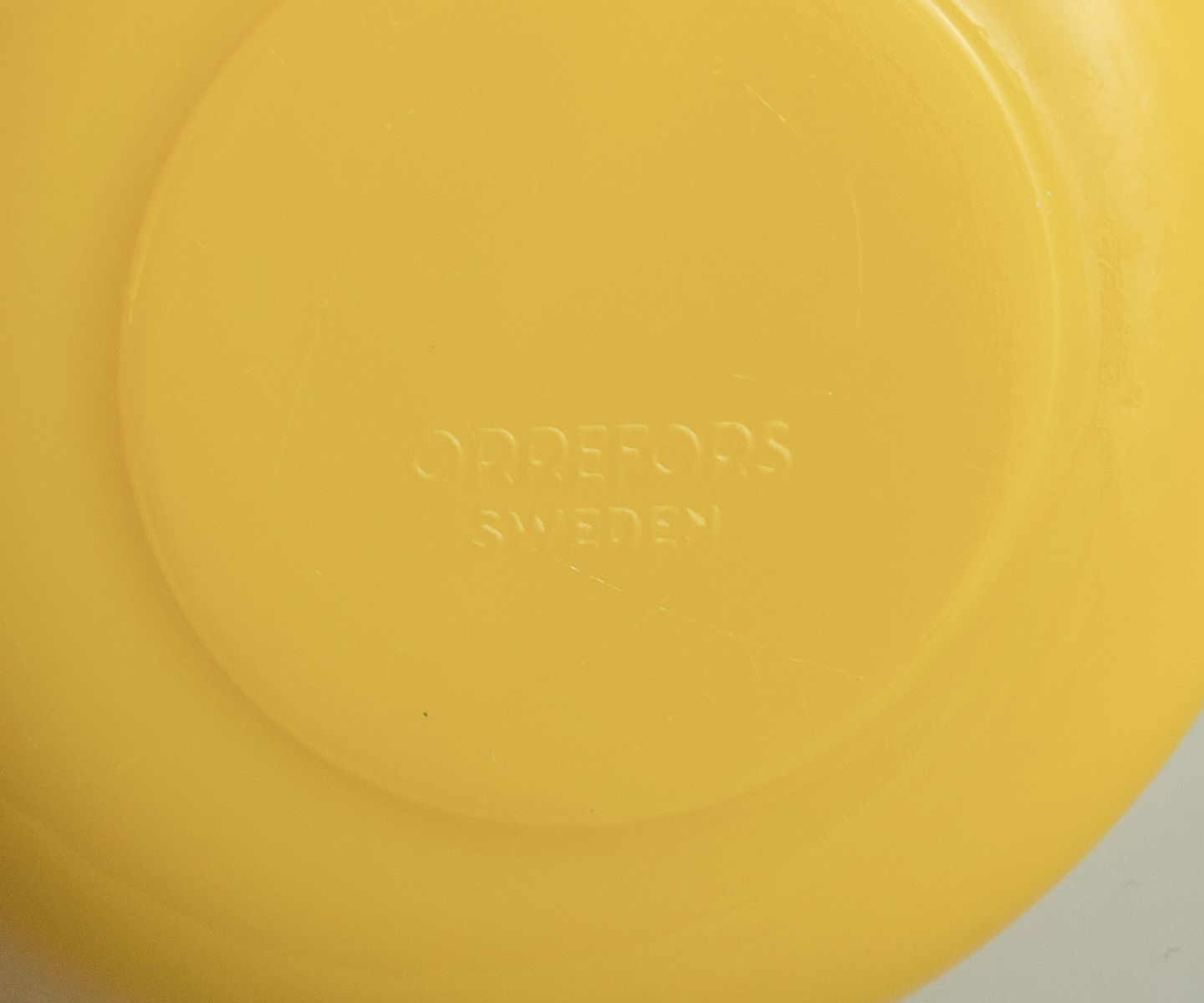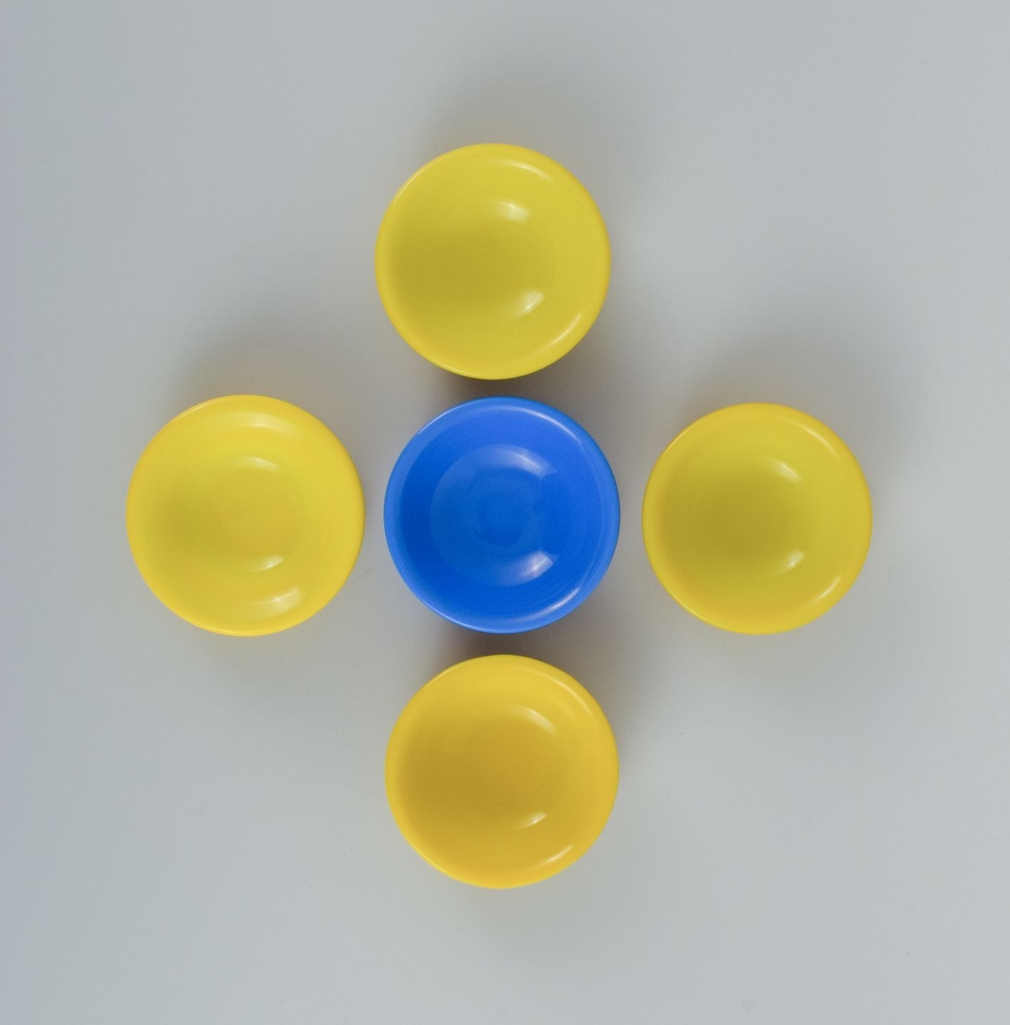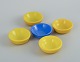 Orrefors, Sverige, et sæt på fem ”Colora” små skåle i gult og blåt kunstglas. Stemplet. I perfekt stand. Ca. 1960’erne. Måler: D 9,0 cm. x H 3,0 cm.