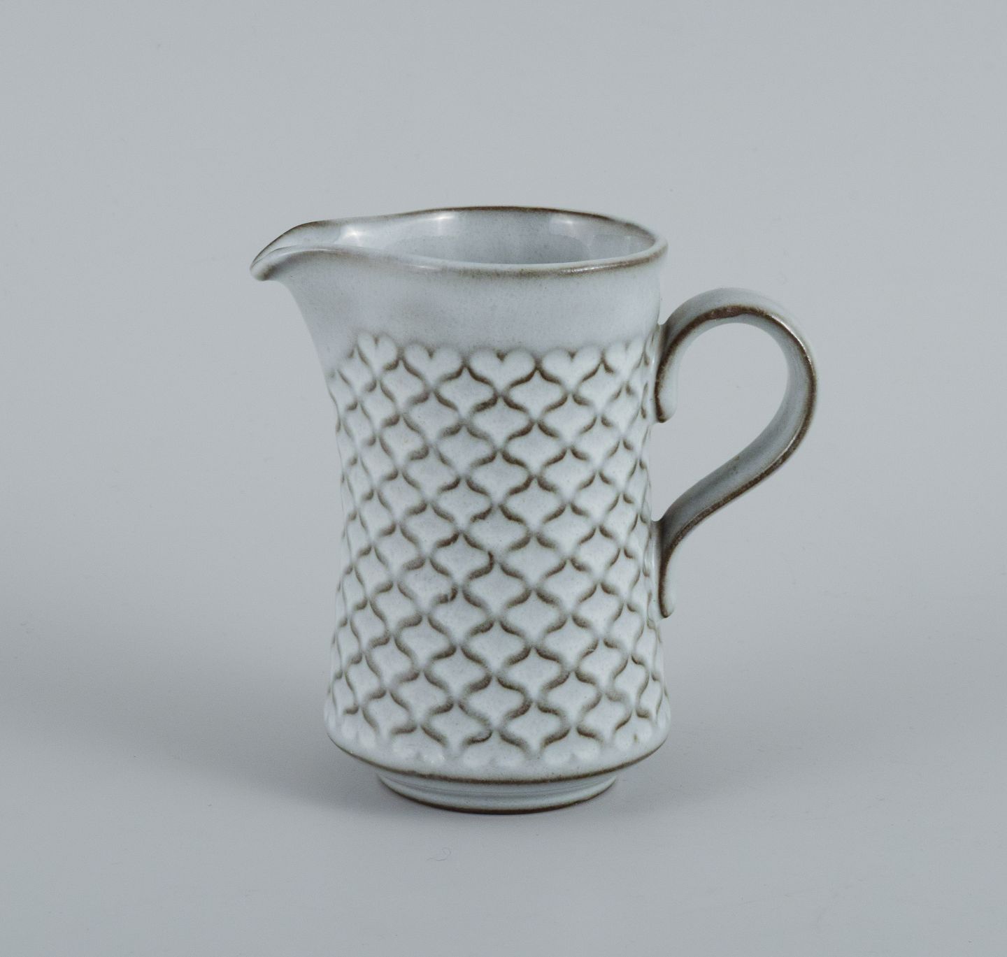 Jens H. Quistgaard (1919-2008) for Bing & Grøndahl / Nissen Kronjyden. Teservice i grå ”Cordial” bestående af tekande, flødekande og en sukkerskål.