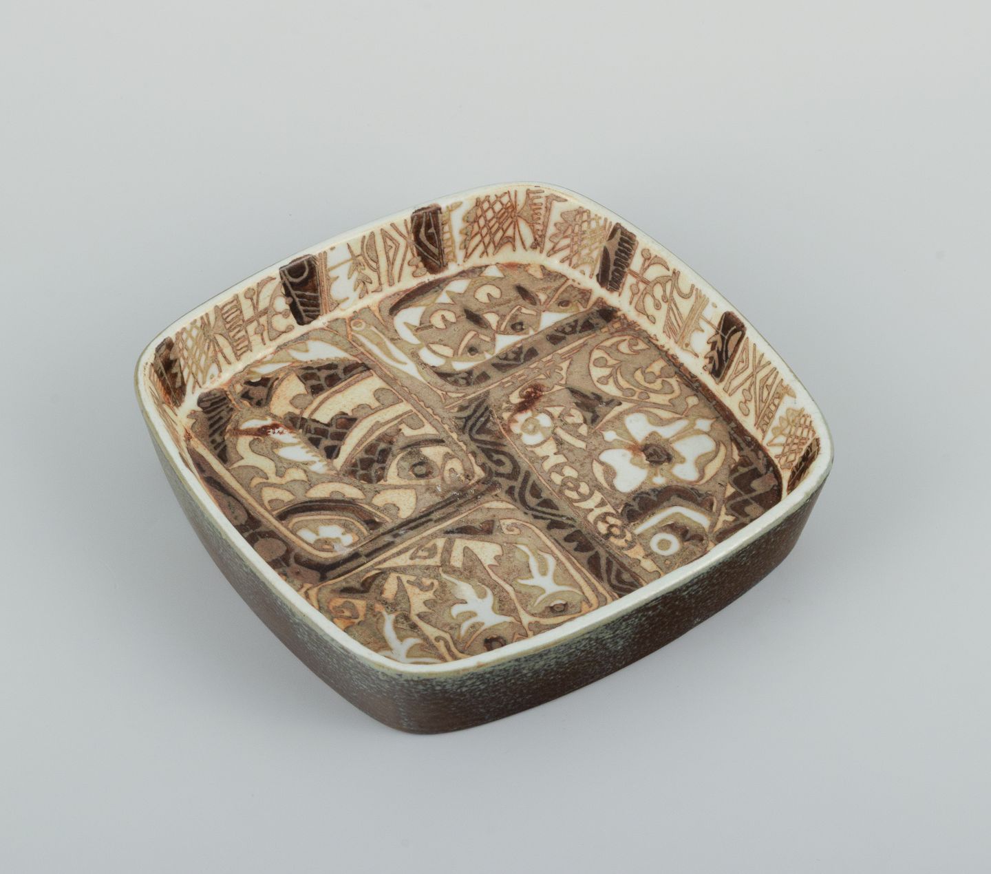 En "Baca" vase og fad dekoreret med fugle og fisk, mønstret glasur i sand og lyse brune nuancer.