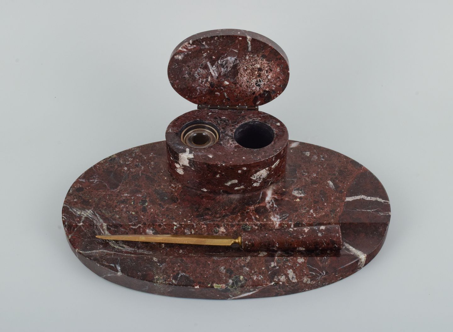Tysk designer, komplet skrivetøj med blækhus, blæksluger, brevholder, laksegl og en brevkniv.