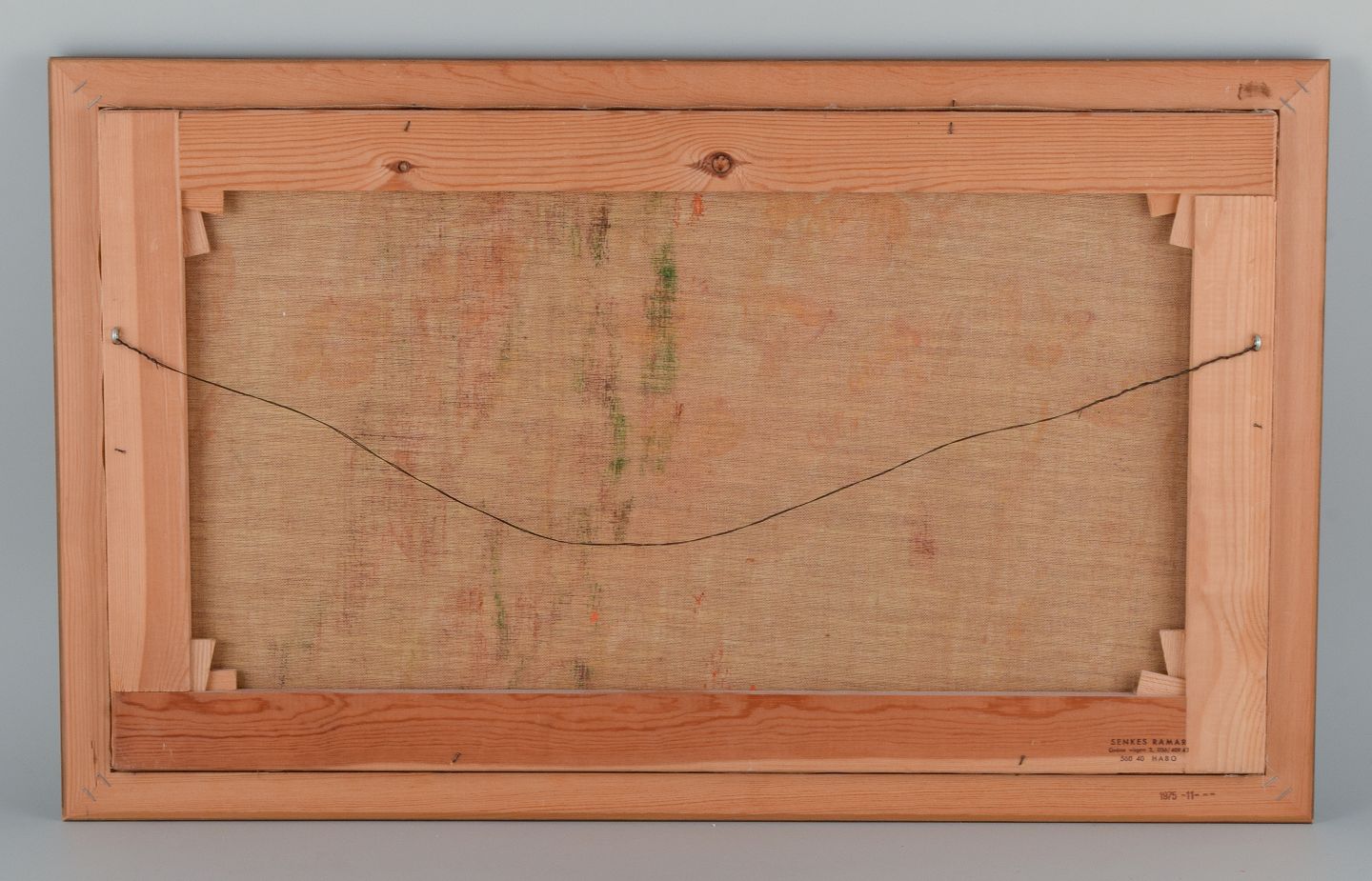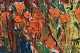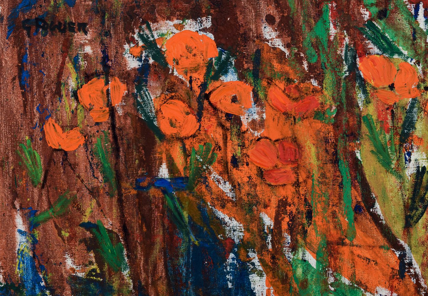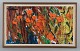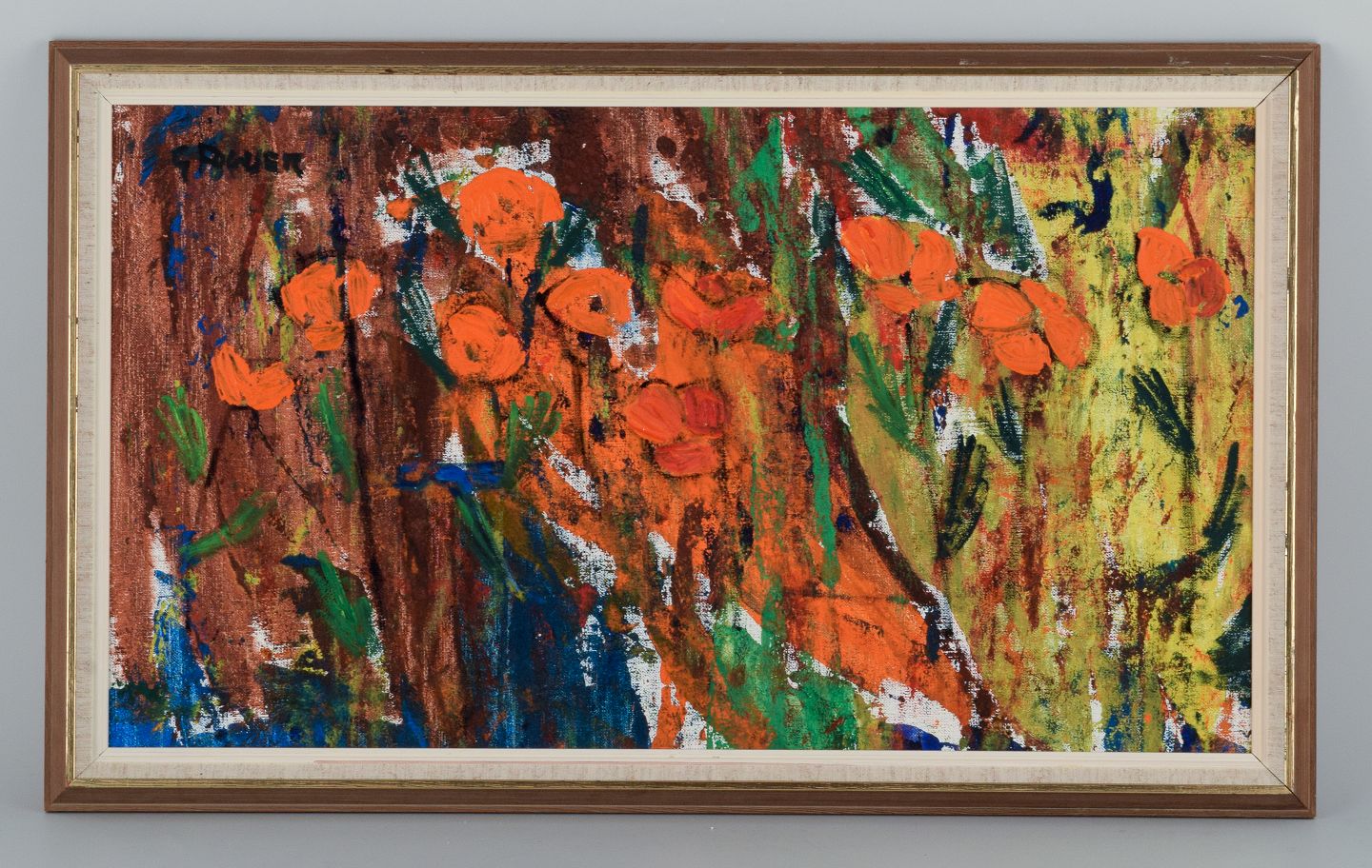 Svensk kunstner. Modernistisk opstilling med orange blomster. Olie på lærred. Utydeligt signeret. 1970erne. I perfekt stand. Mål: 63,5 x 36,0 / 71,5 x 43,5 cm.