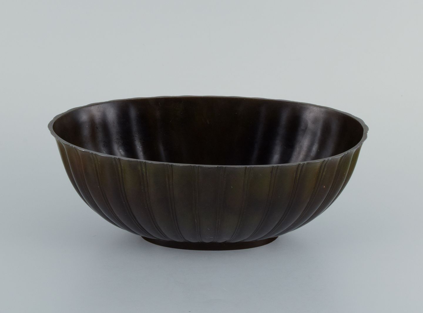 Just Andersen. Jardiniere af patineret diskometal med rillet korpus. Stemplet Just Danmark, dessin 1752 Ca. 1940. I flot stand. Måler : L 31,0 x B 19,0 x H 11,0 cm.