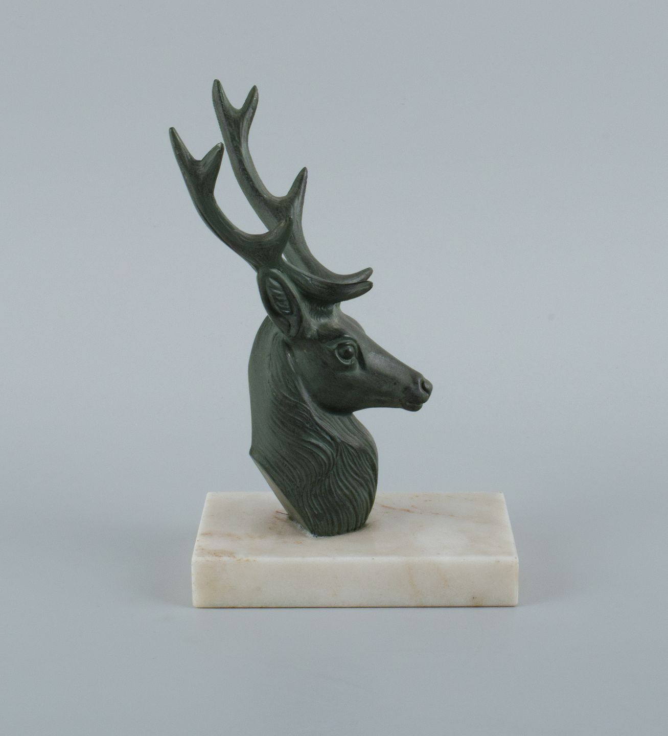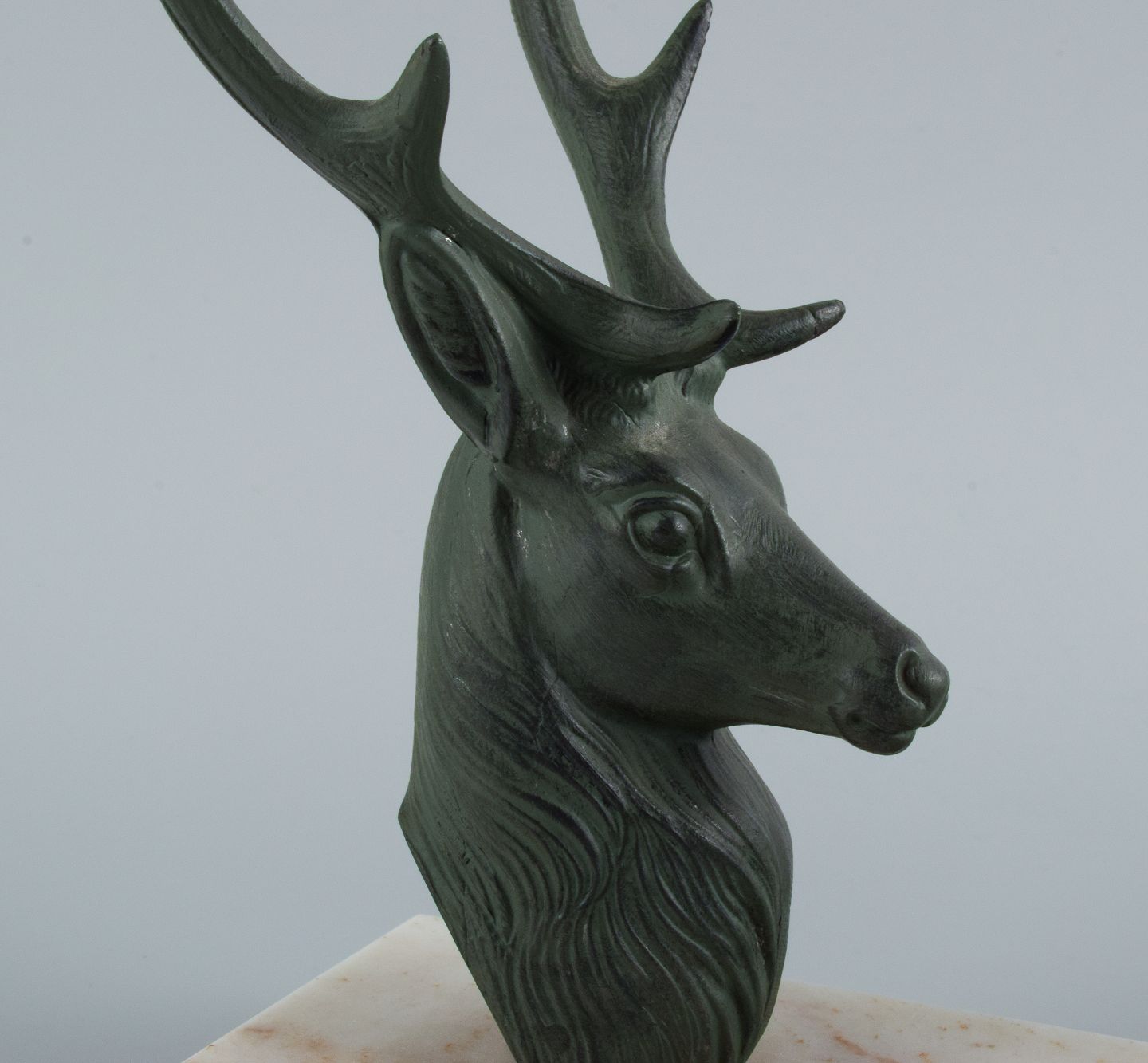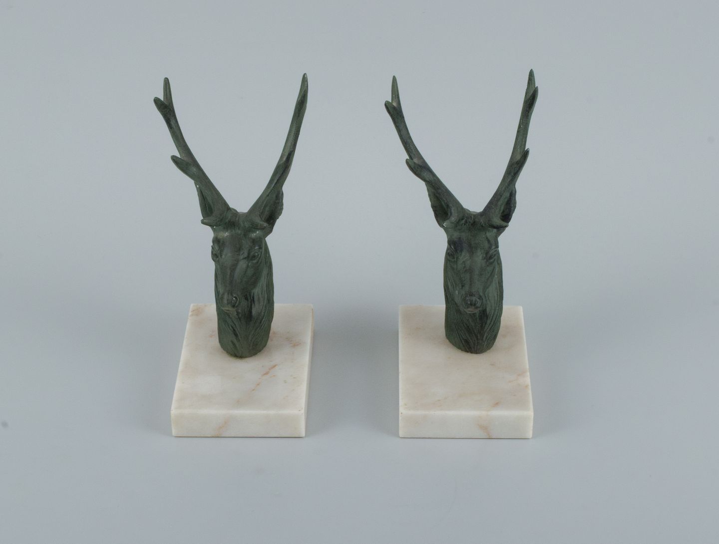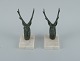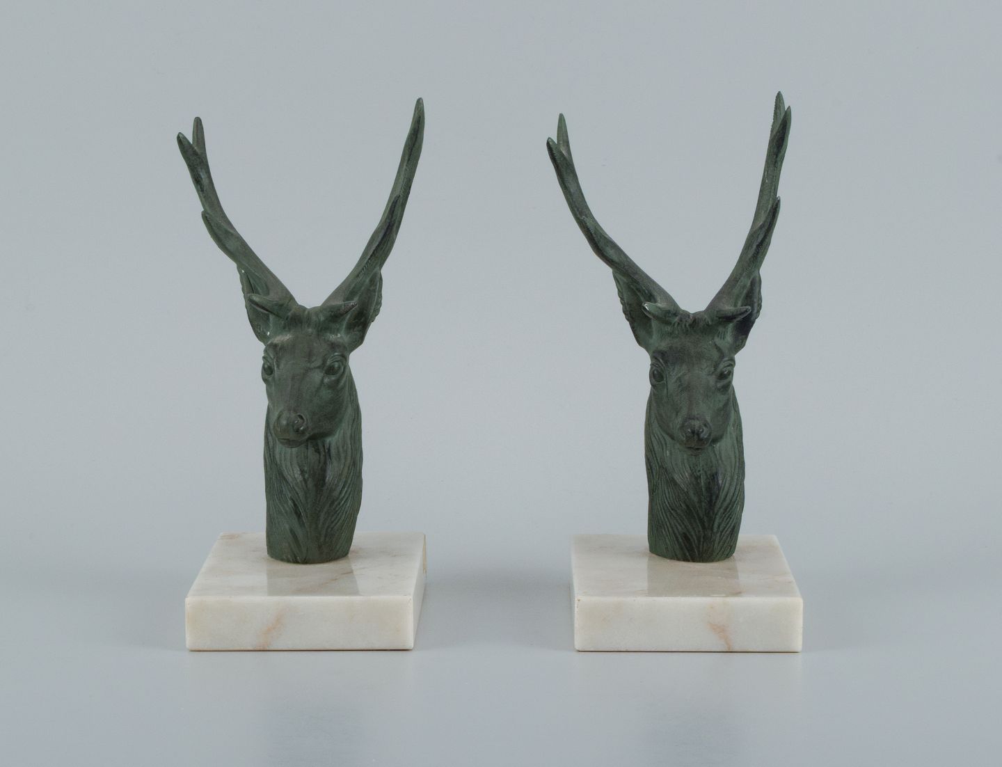 Et par franske art deco bogstøtter. Kronhjorte i patineret metal på marmor base. Ca. 1940'erne. I perfekt stand. Mål: H 18,0 x Dybde 12,0 x B 8,0 cm.