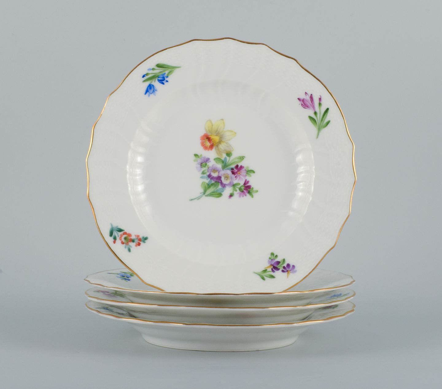 Royal Copenhagen Saksisk Blomst. Fire middagstallerkener i håndmalet porcelæn med blomster og gulddekoration.