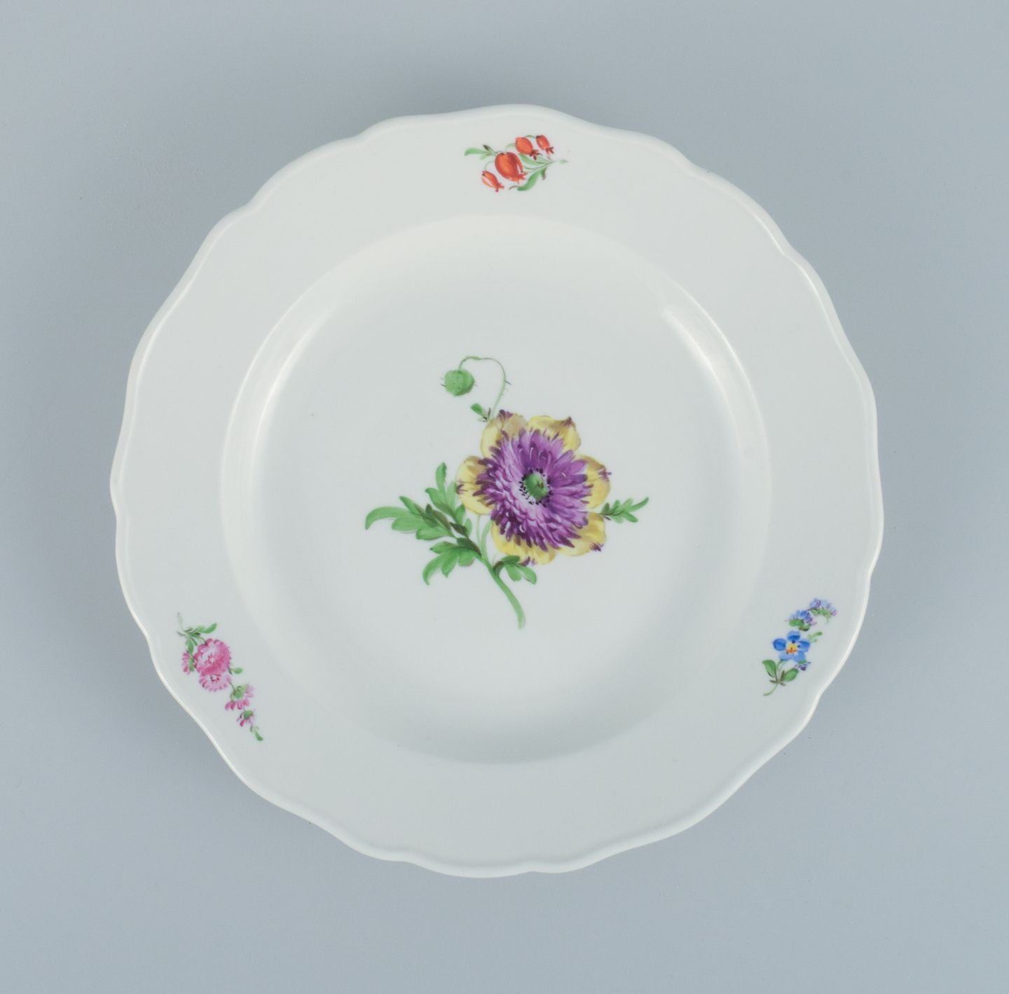 Fem middagstallerkner af porcelæn dekoreret med blomster.