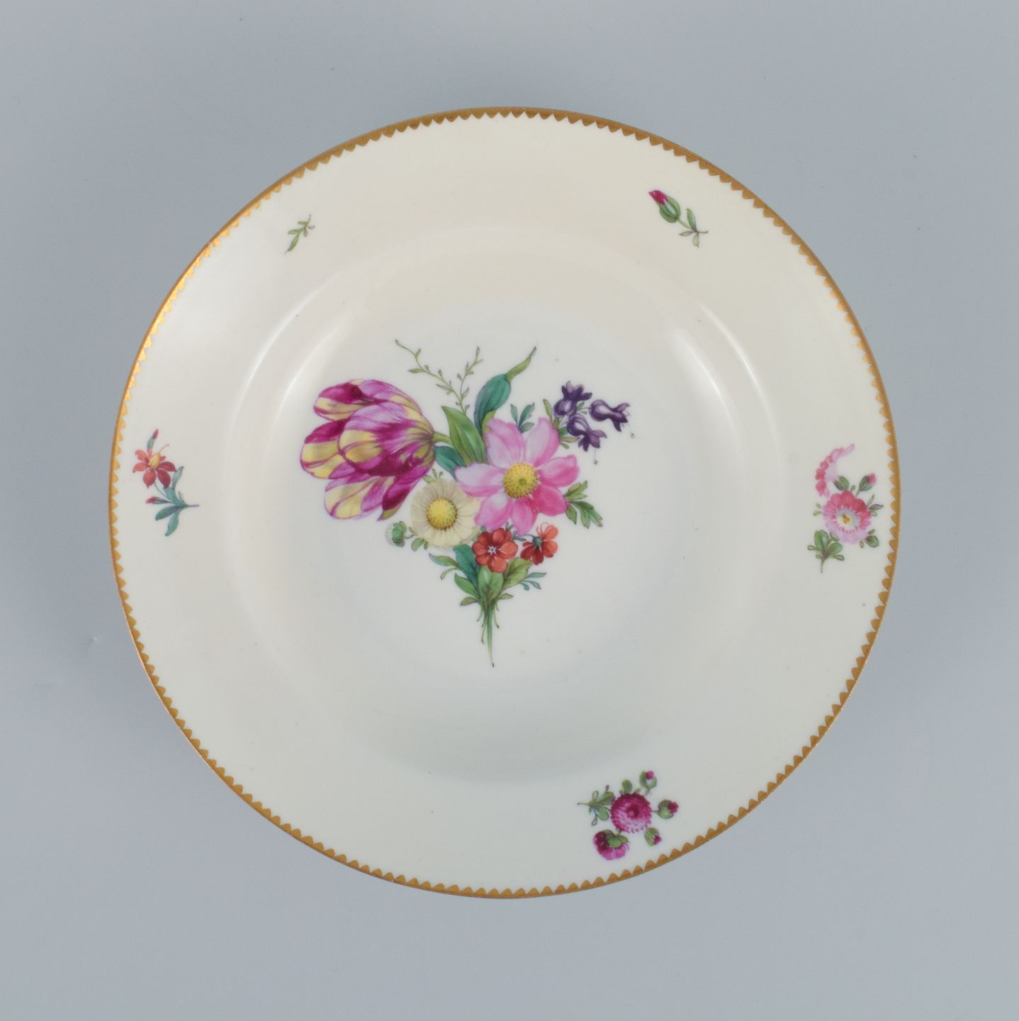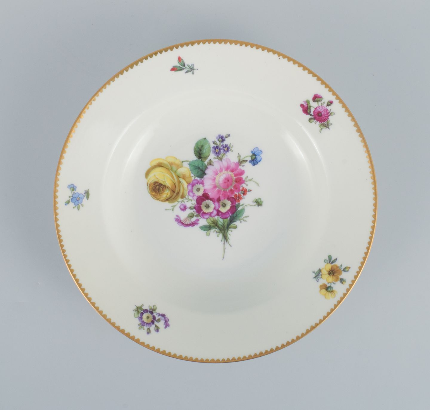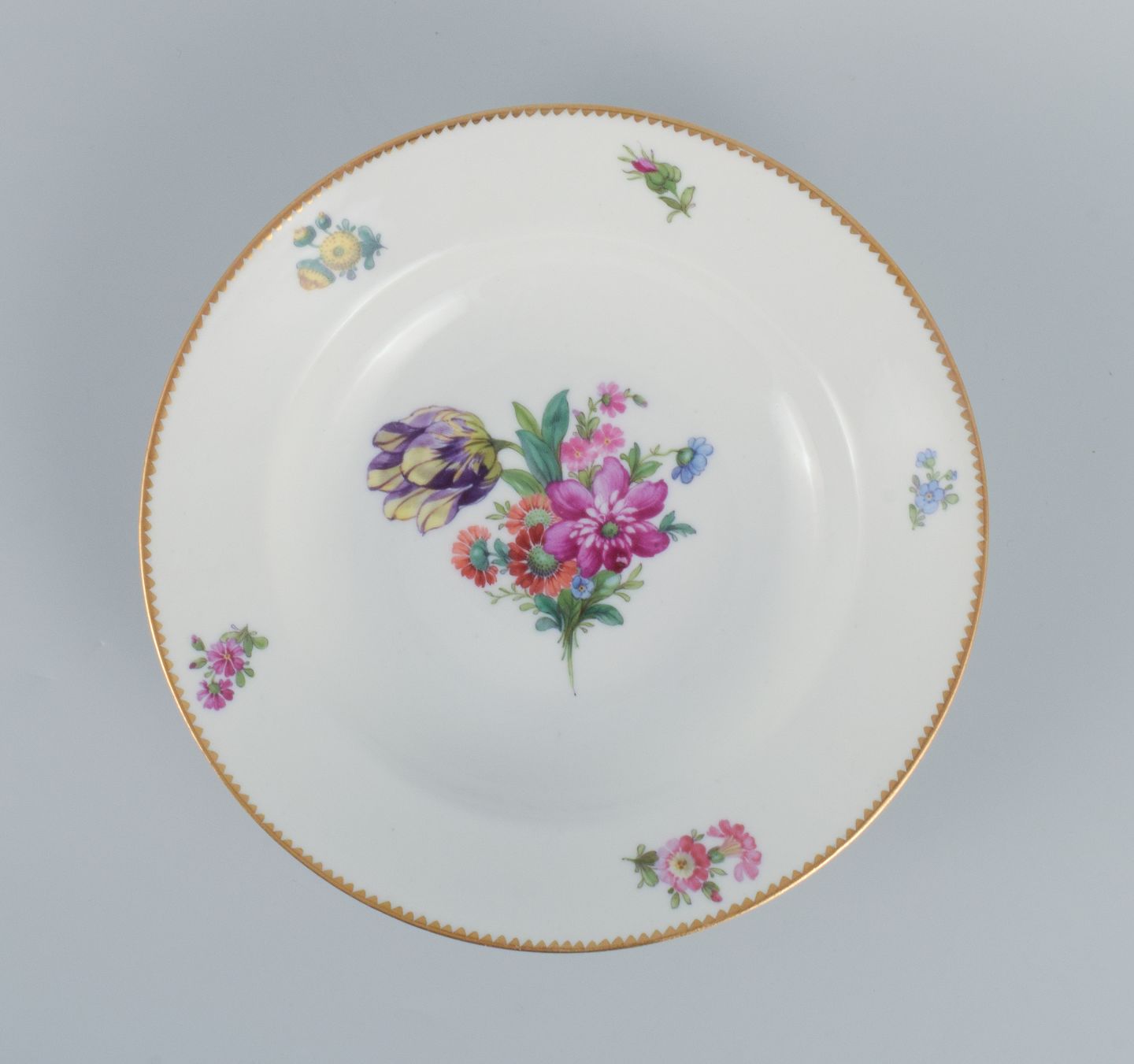 B&G, Bing & Grøndahl saksisk blomst. Tre dybe tallerkner dekoreret med blomster og guldkant. Ca. 1920'erne. I perfekt stand. Stemplet. Første sortering. Mål: D 24,0 x H 4,5 cm.