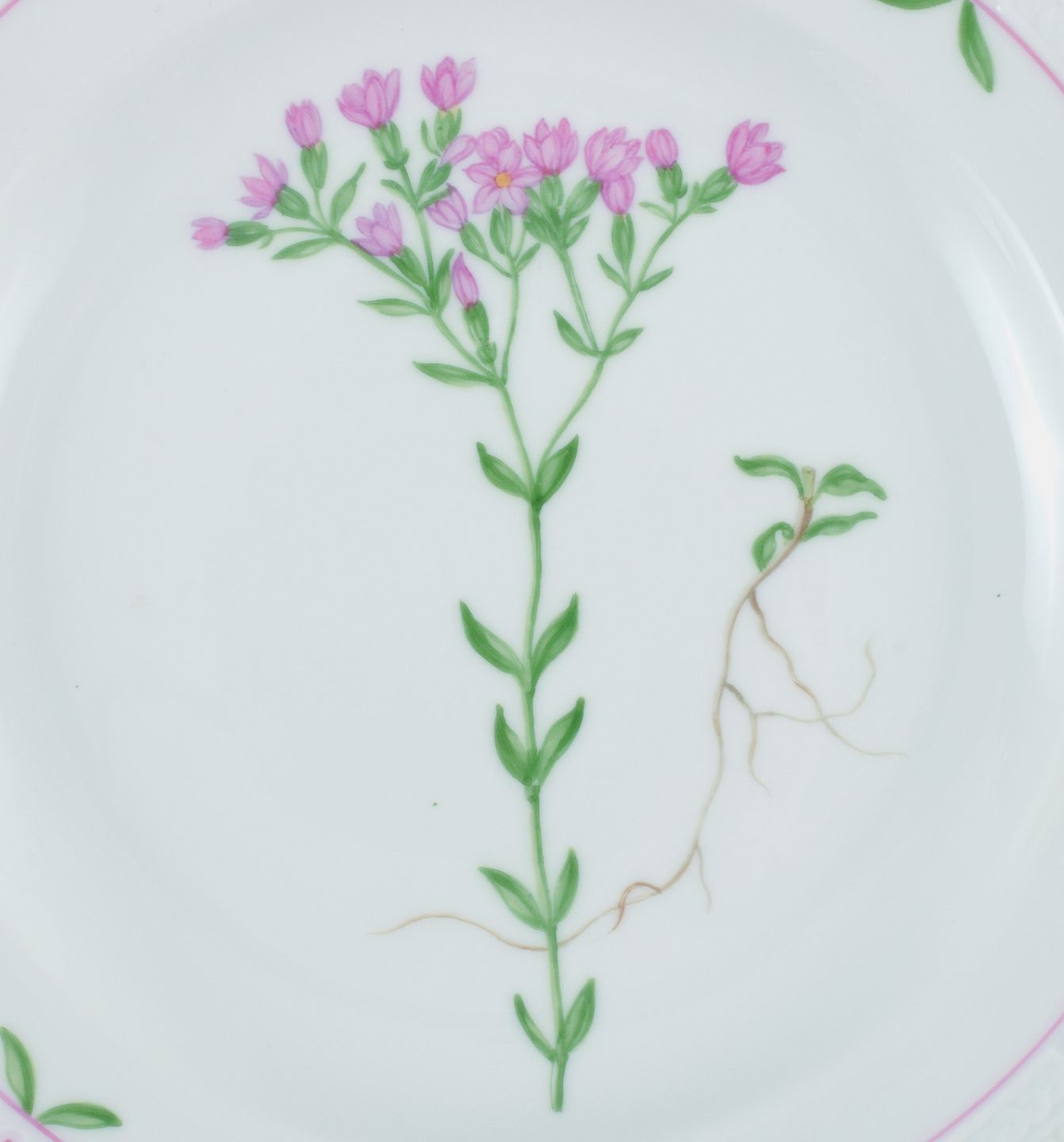 Royal Copenhagen, Flora Danica stil. Middagstallerken håndmalet med blomstermotiv og gulddekoration.