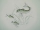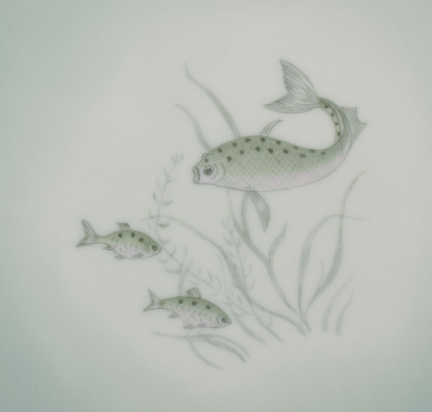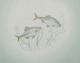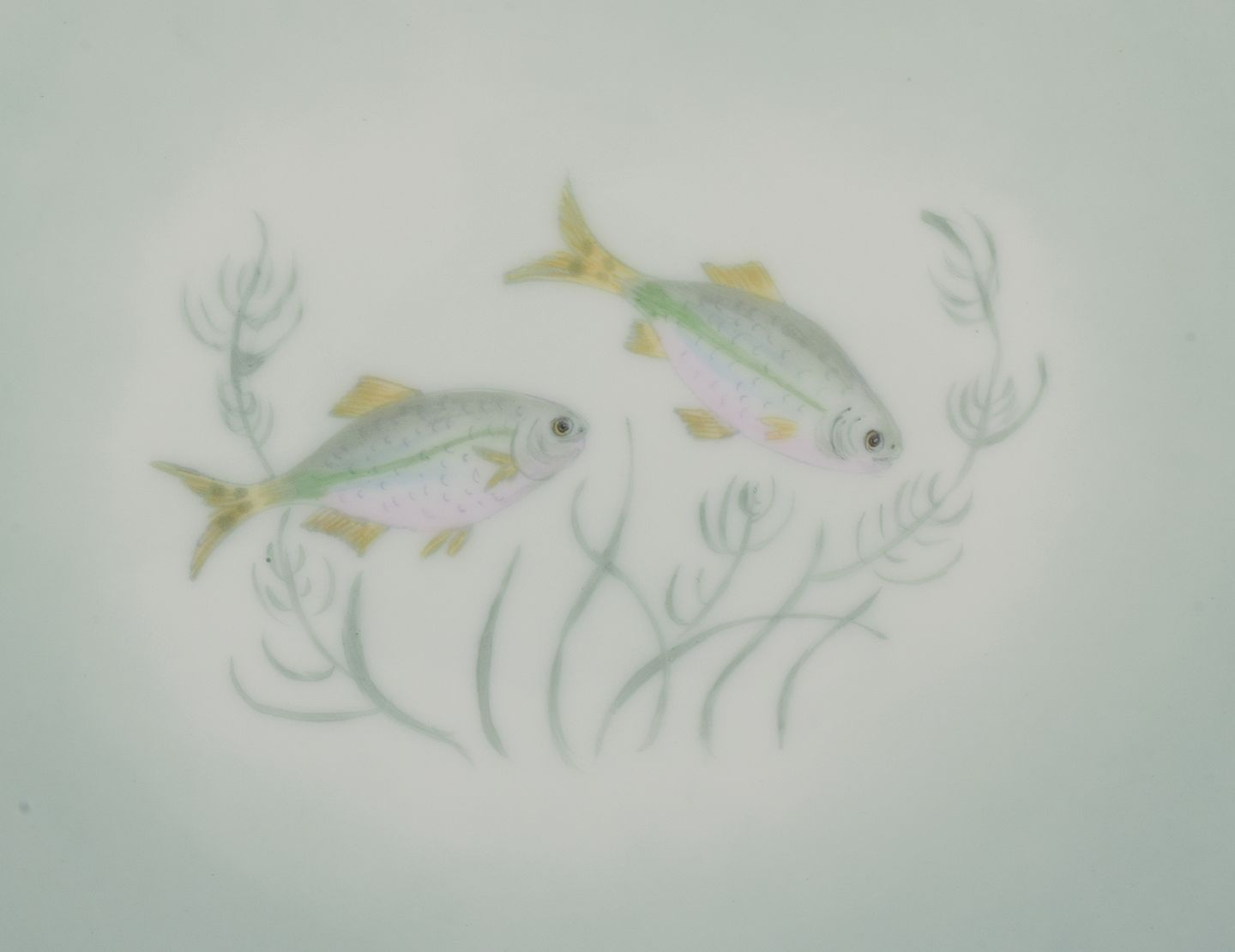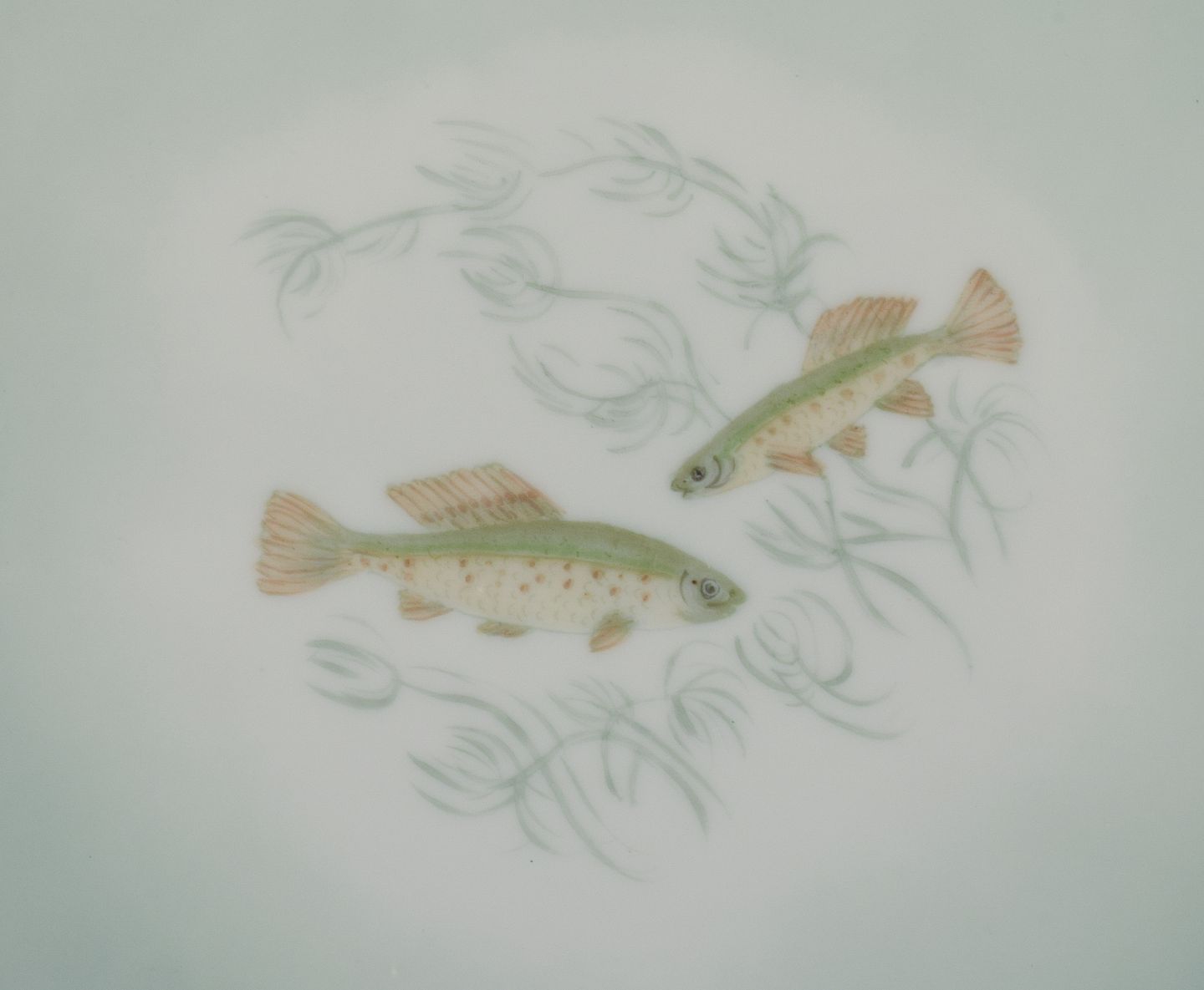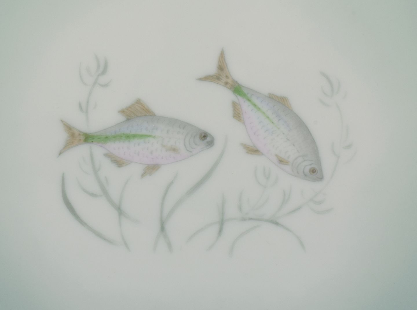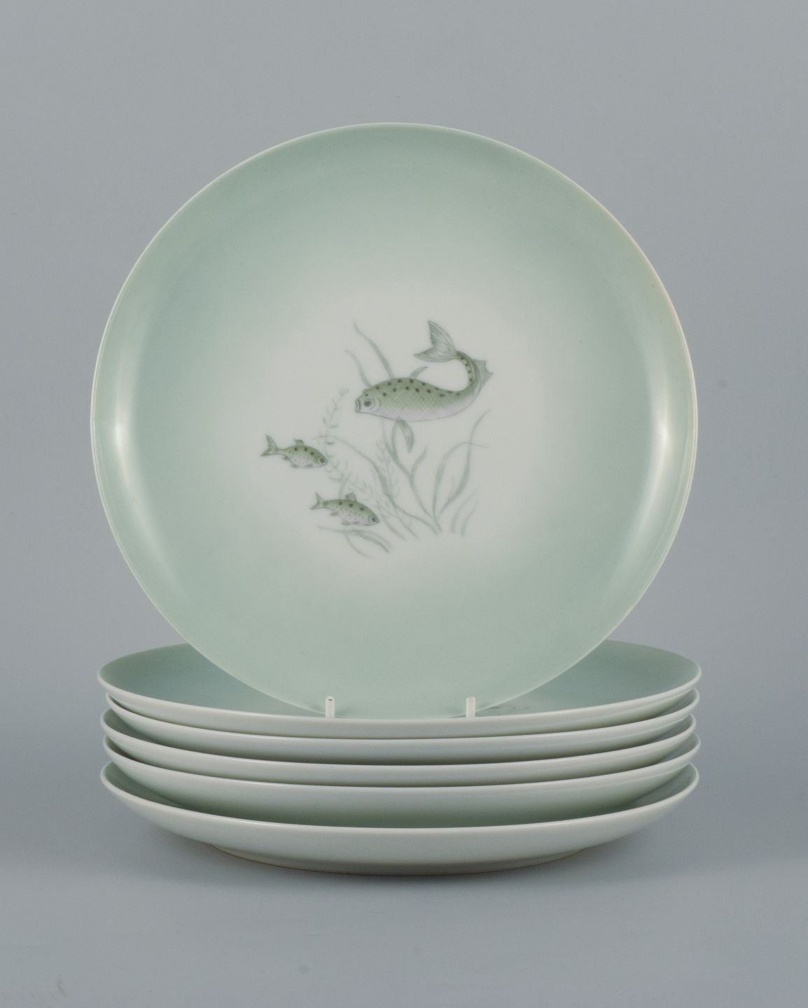 Th. Karlinder for Bing & Grøndahl. Seks håndmalet middagstallerkner med fiskemotiver. 1956. I flot stand. Første sortering. Stemplet. Mål: 23,5 cm.