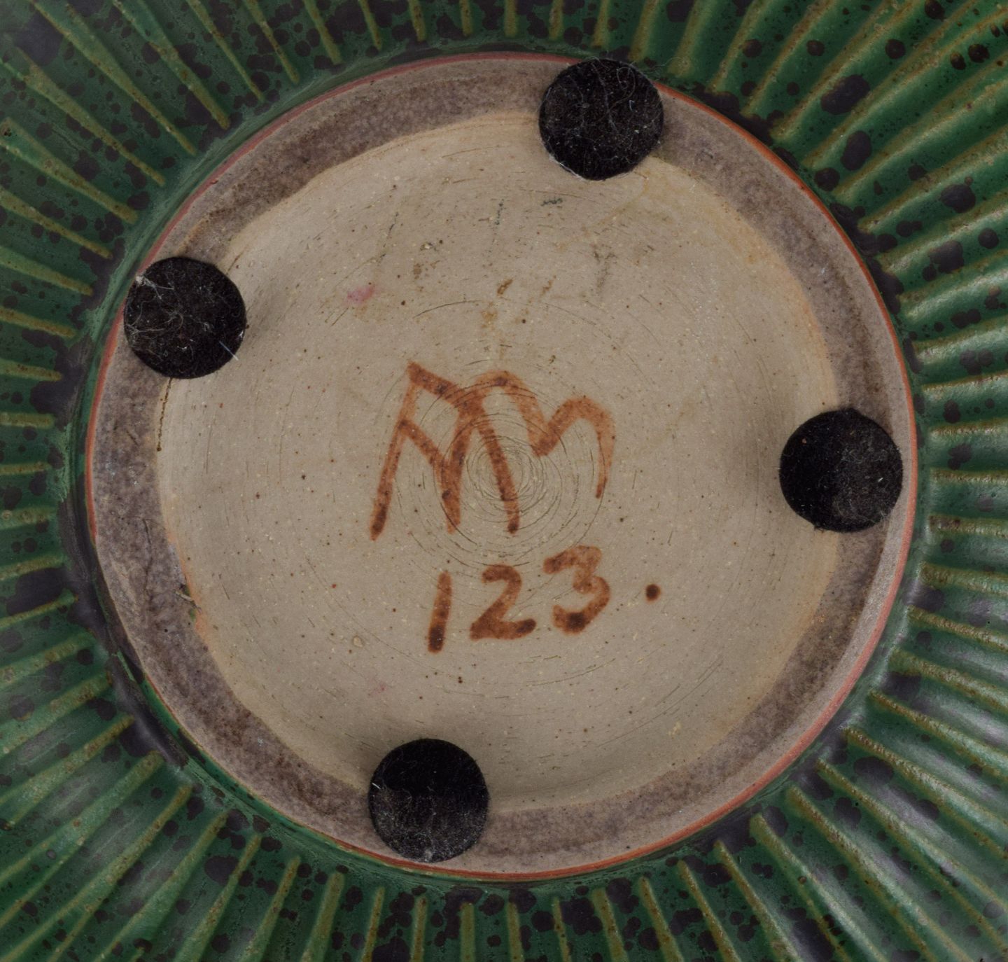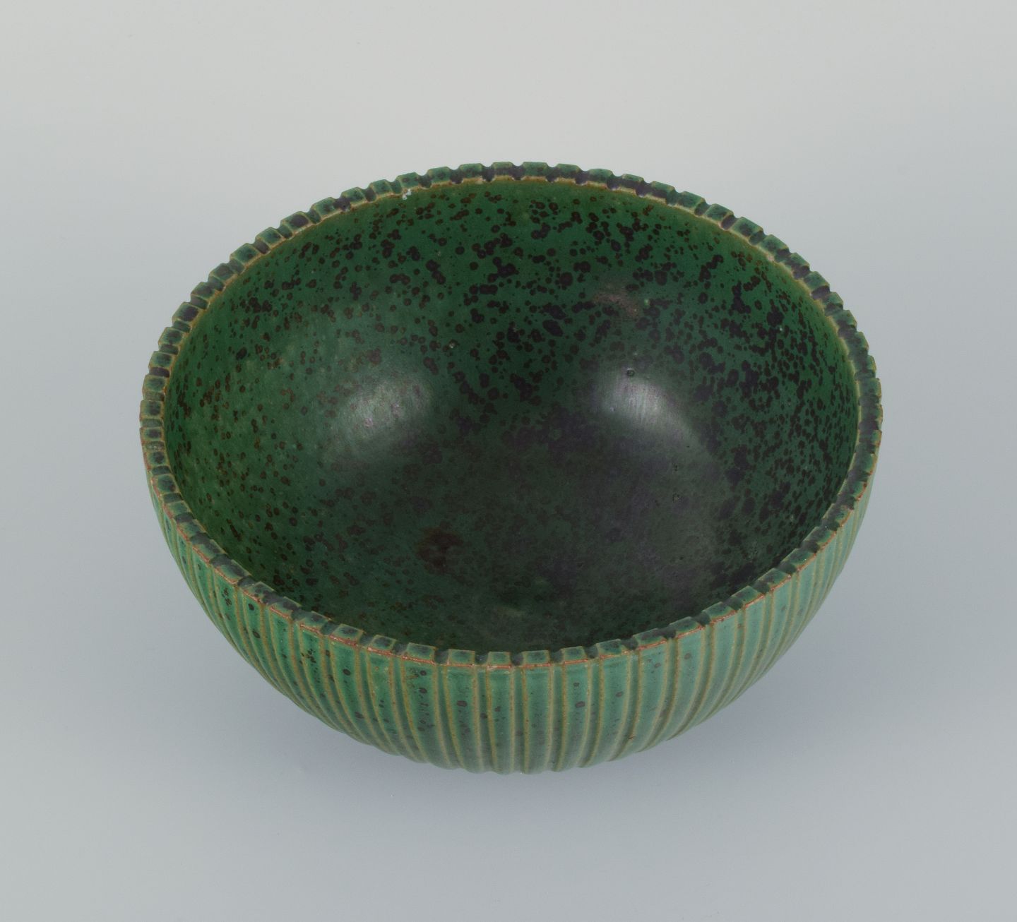Arne Bang, keramikskål i rillet design, glasur i grønne nuancer
