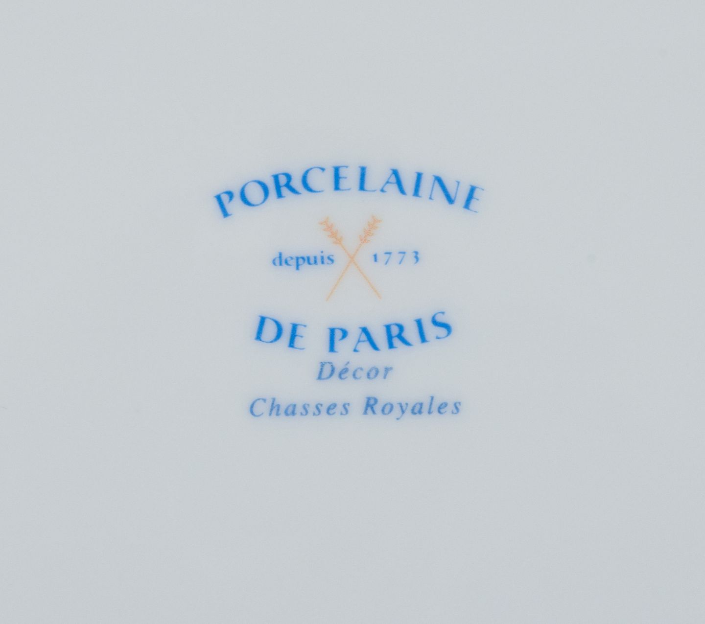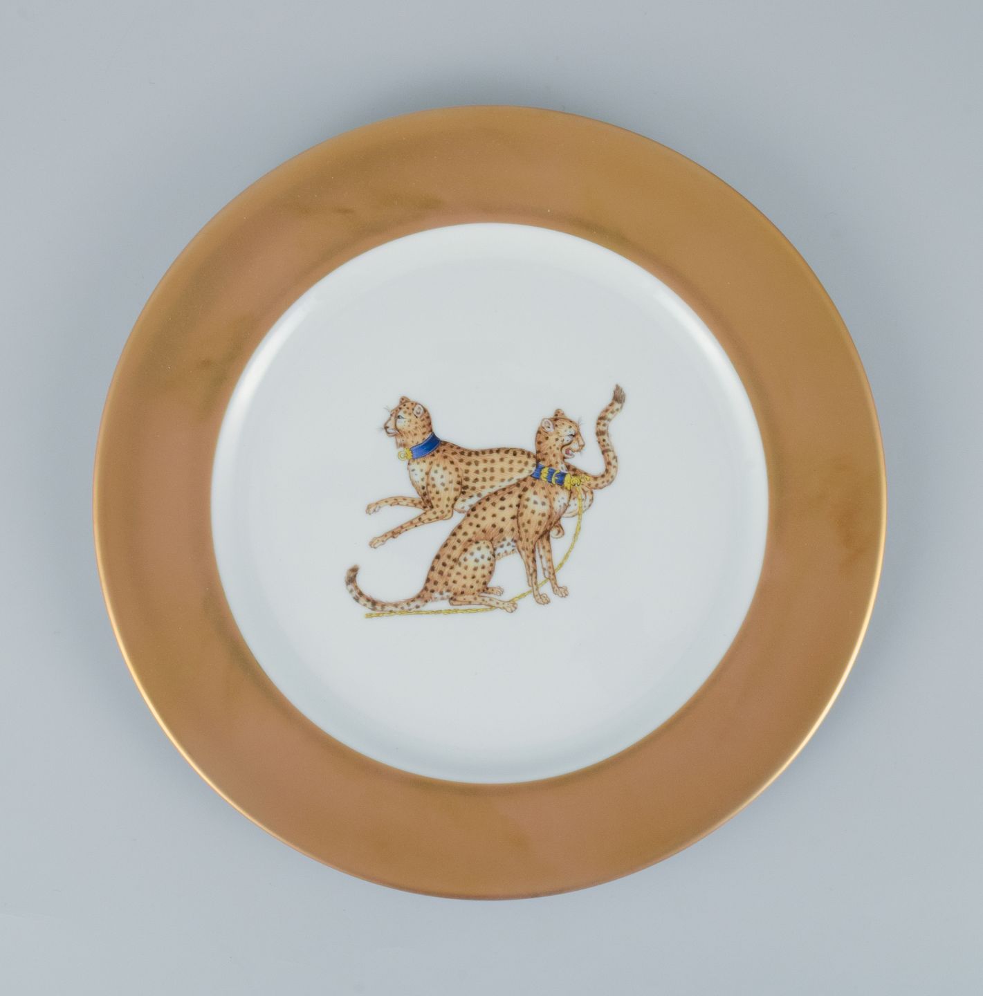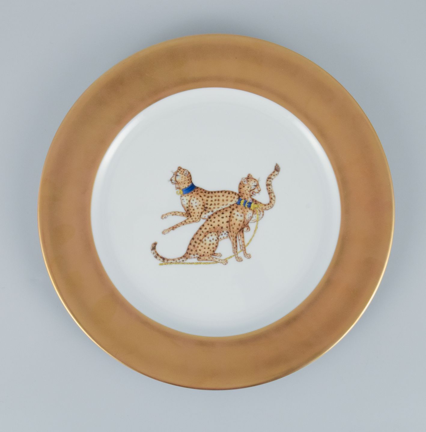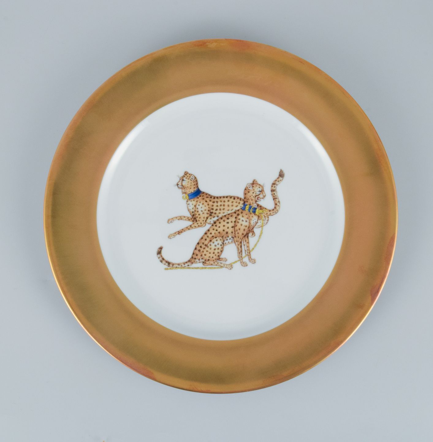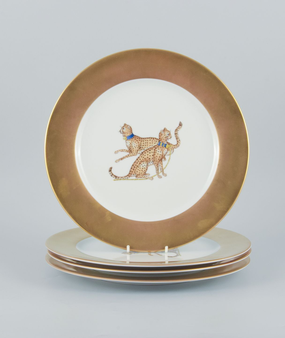 Porcelaine de Paris (Décor - Chasses Royales). Four large cover plates hand decorated with cheetahs and gold decoration. Approx. 1980s. In perfect condition. Marked. Dimensions: D 29,7 cm.