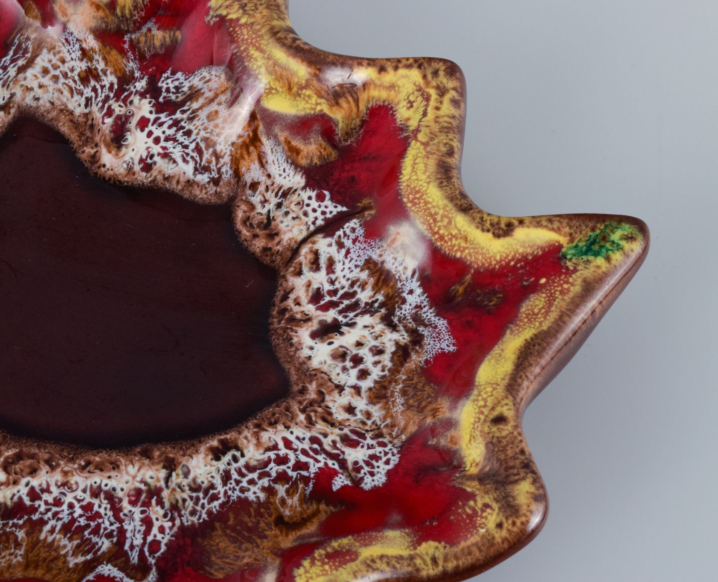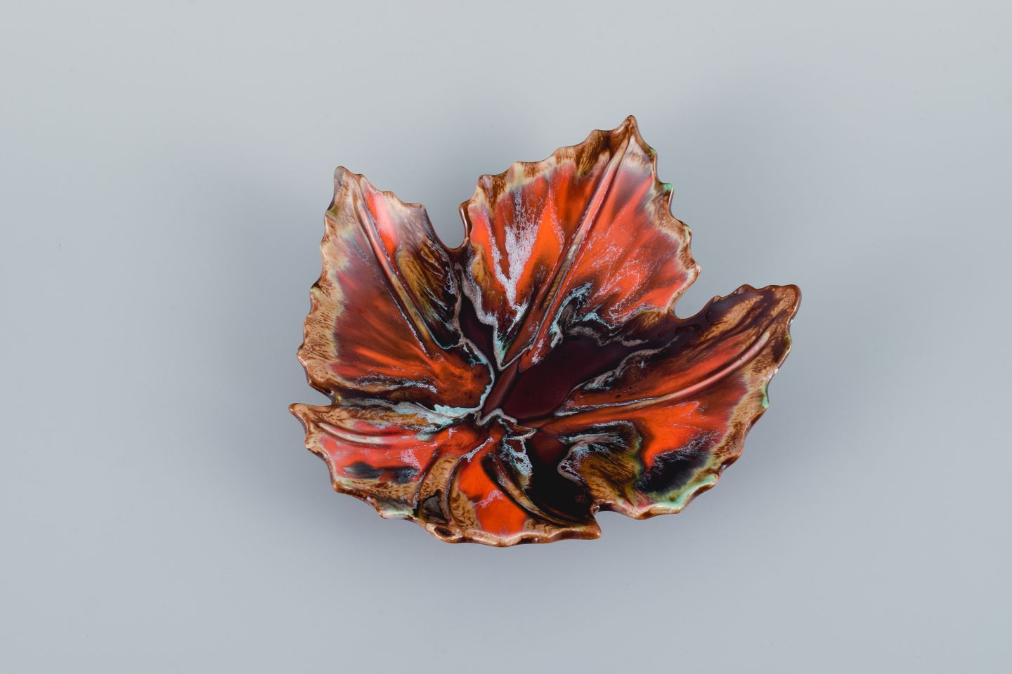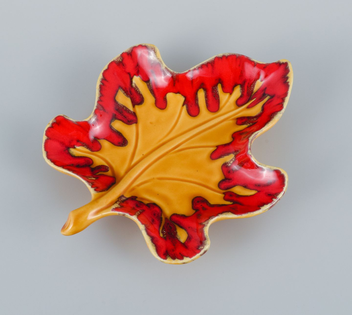 Vallauris, Frankrig, tre bladformede fade i farvestrålende glasurer.