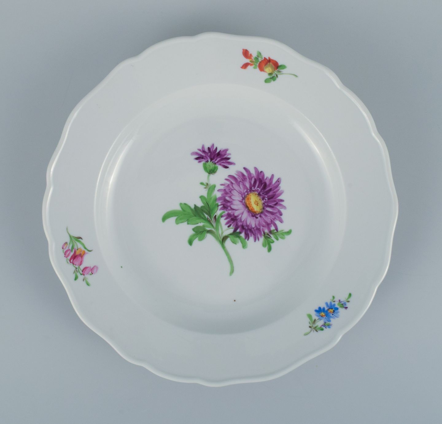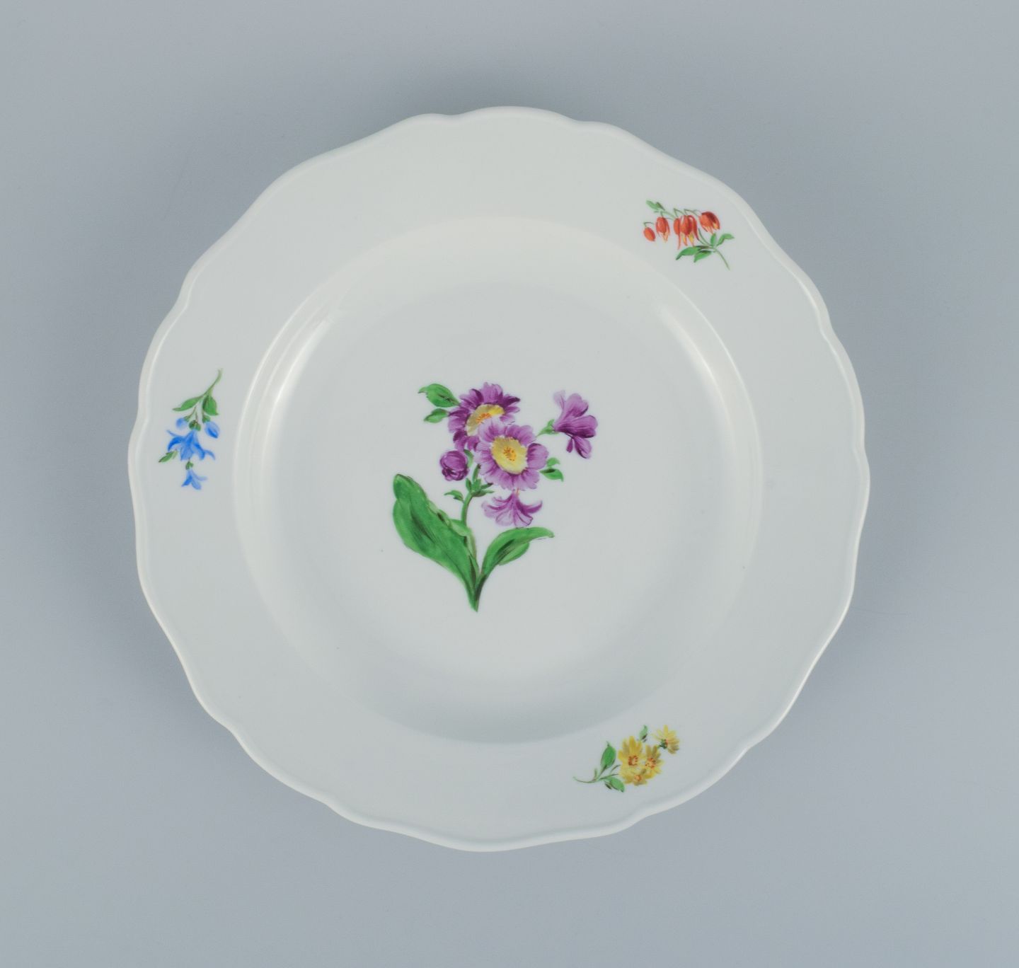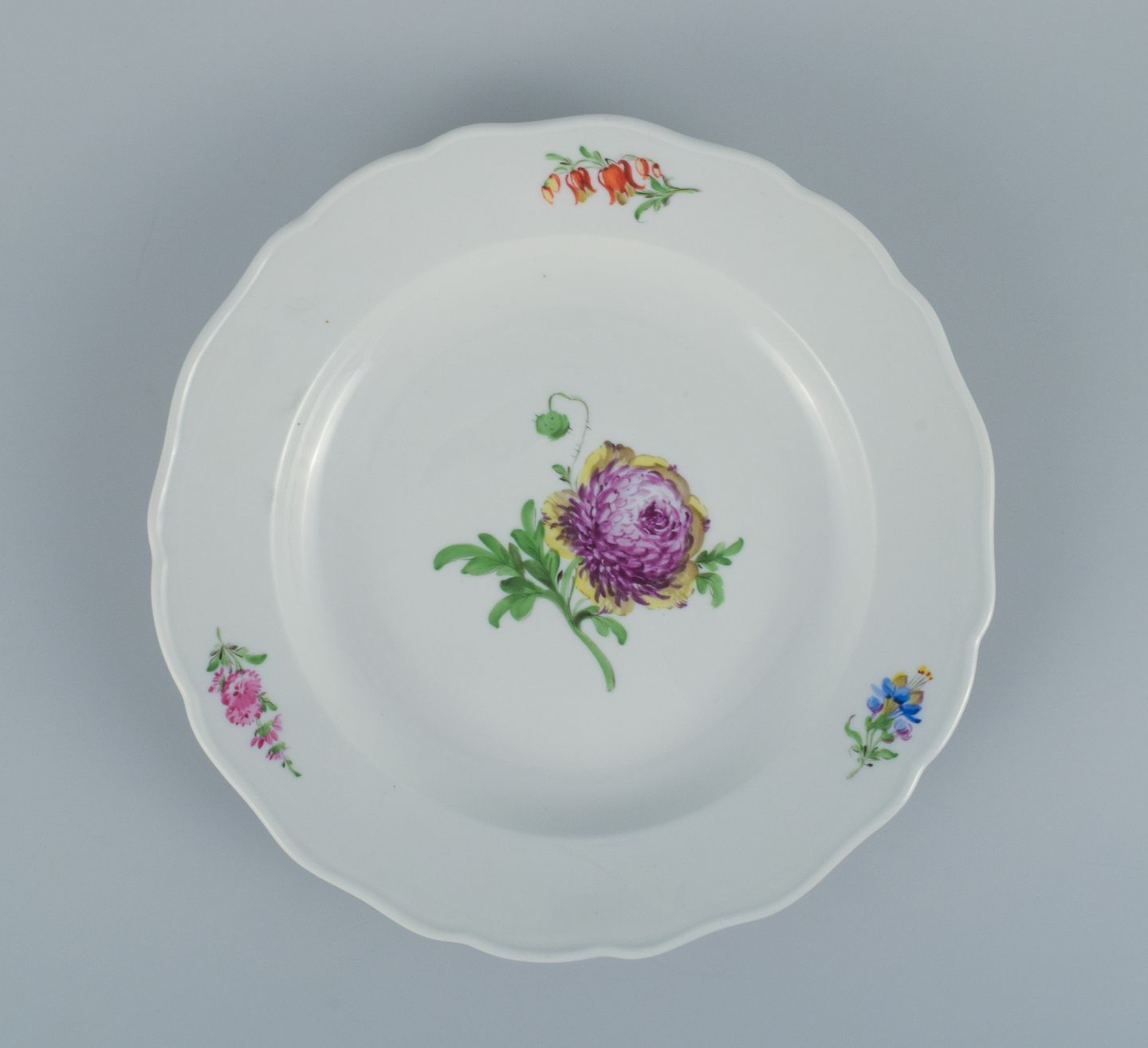 Meissen, Tyskland, seks middagstallerkner håndmalet med blomstermotiver i forskellige farver. Ca. 1900. I flot stand. Tredje sortering. Stemplet. Mål: D 25,0 x H 3,5 cm.