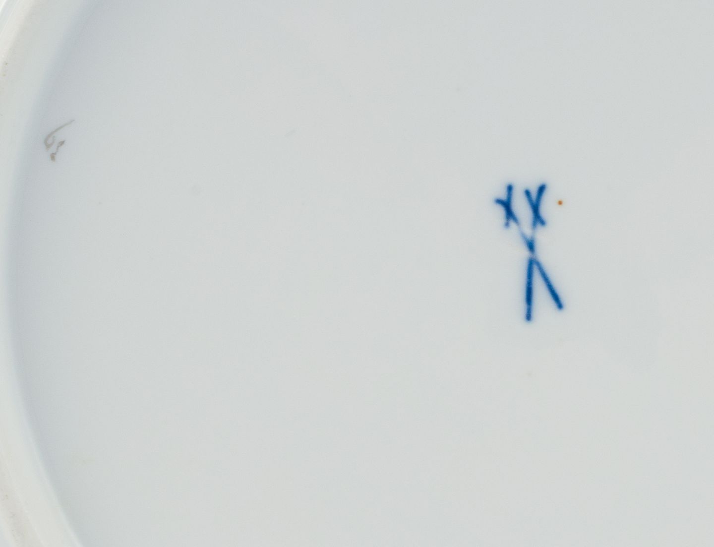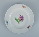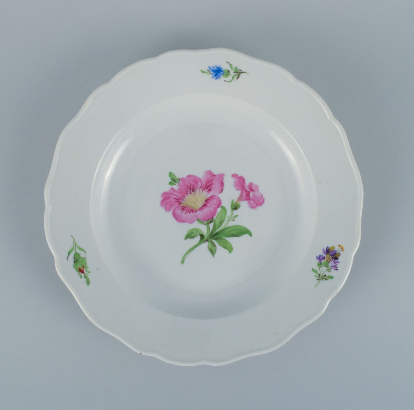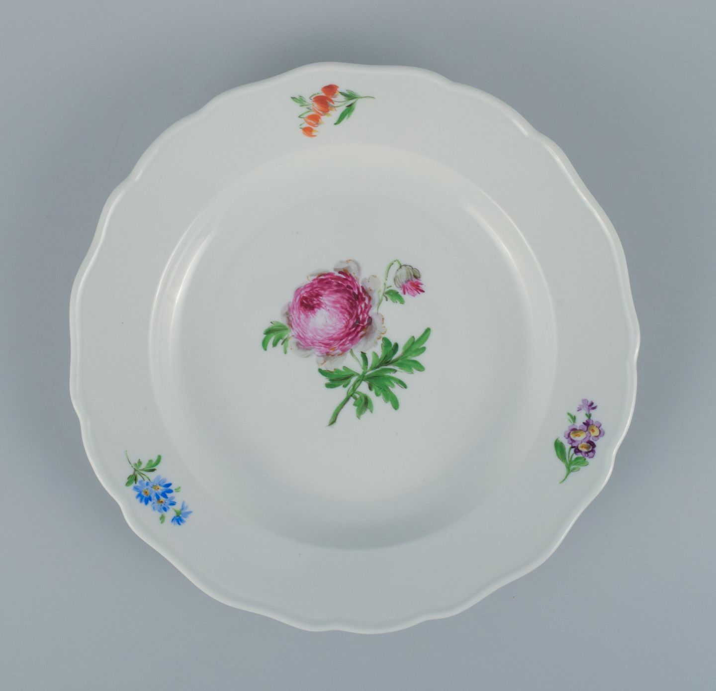 Meissen, Tyskland, seks middagstallerkner håndmalet med blomstermotiver i forskellige farver. Ca. 1900. I flot stand. Tredje sortering. Stemplet. Mål: D 25,0 x H 3,5 cm.
