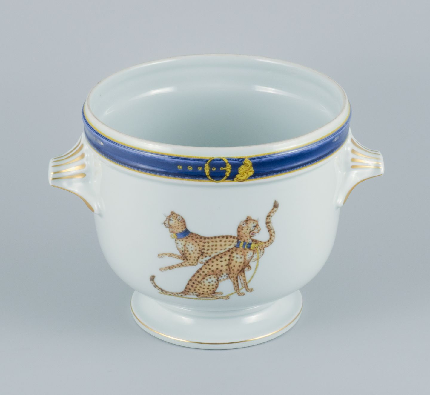 Porcelaine de Paris, Frankrig. Kolossal champagnekøler i porcelæn til magnumflaske. Hånddekoreret med geparder. Ca. 1980'erne. Stemplet. Perfekt stand. Mål: H 20,5 x D 28,0 (inklusiv hanke).