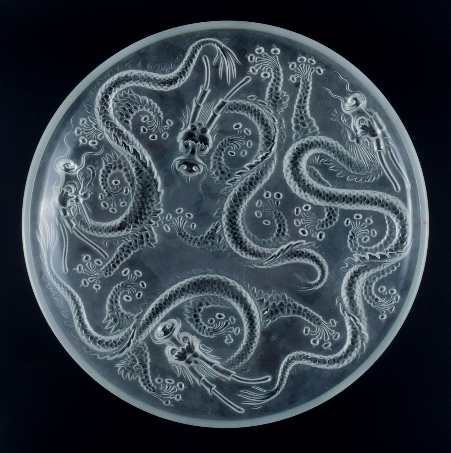 Josef Inwald, large art glass bowl in Barolac glass, designed with dragons in oriental style. Approx. 1940s. In perfect condition. Dimensions: D 35.5 x H 5.0 cm.