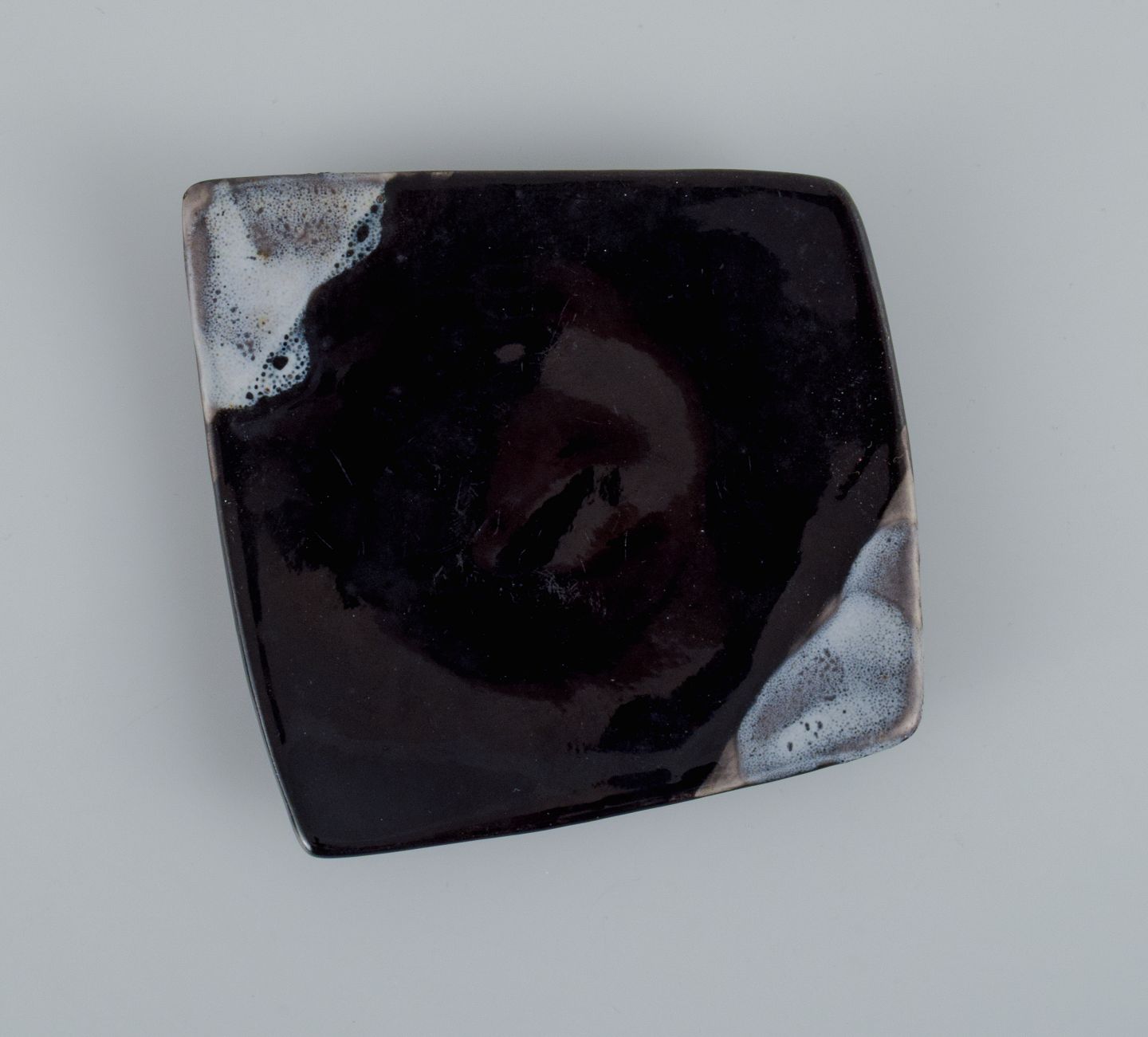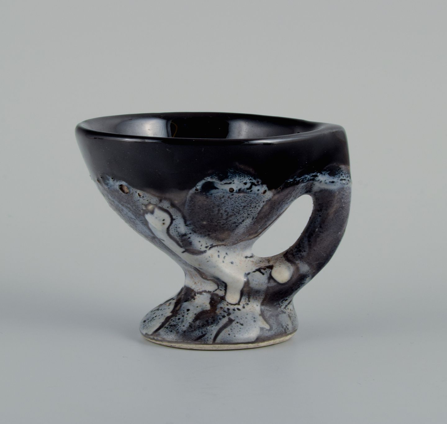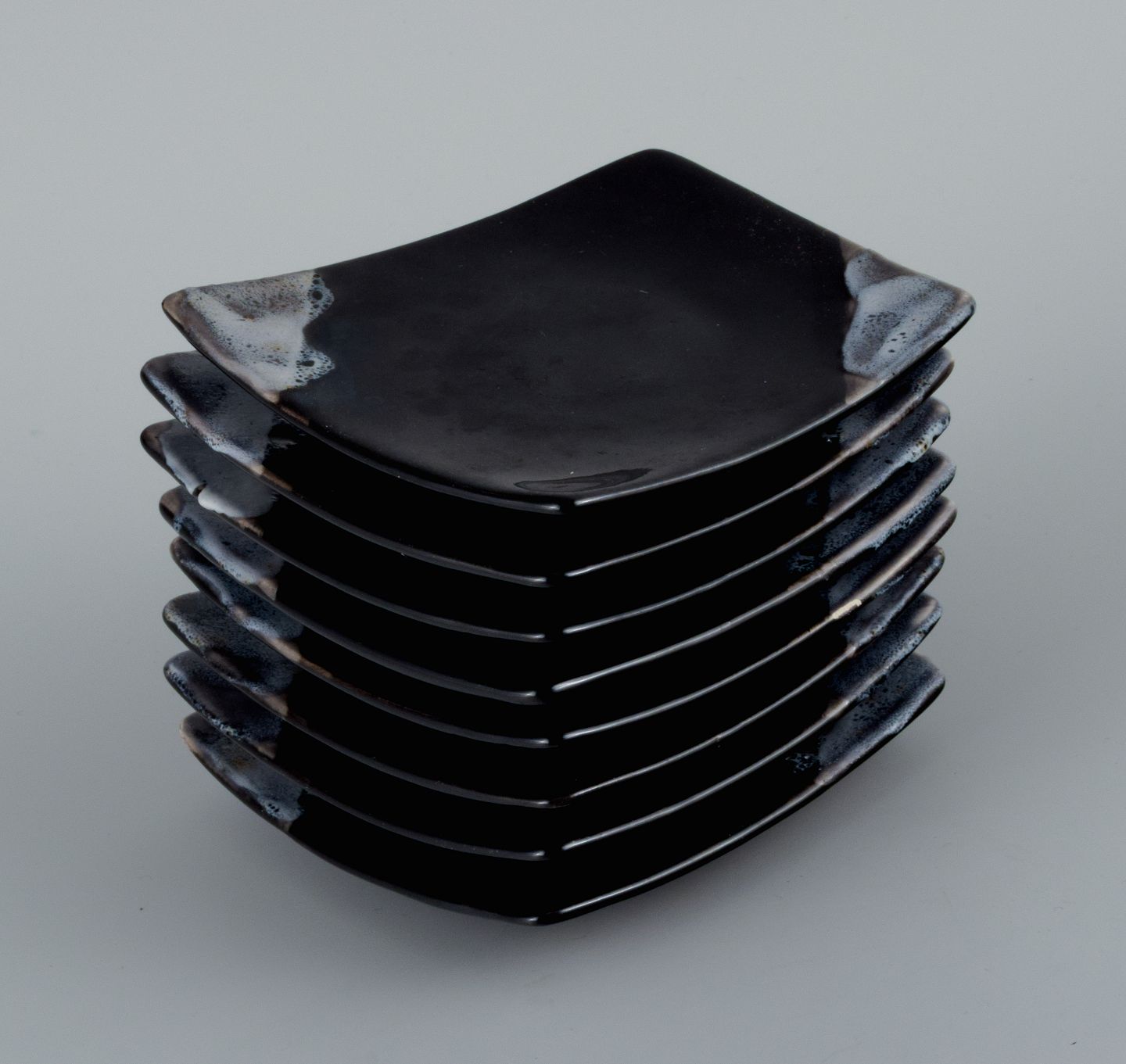 Et modernistisk fire personers kaffeservice i keramik bestående af fire kaffekopper med tilhørende underkopper, kaffekande, flødekande, sukkerskål samt tre små tallerkner.