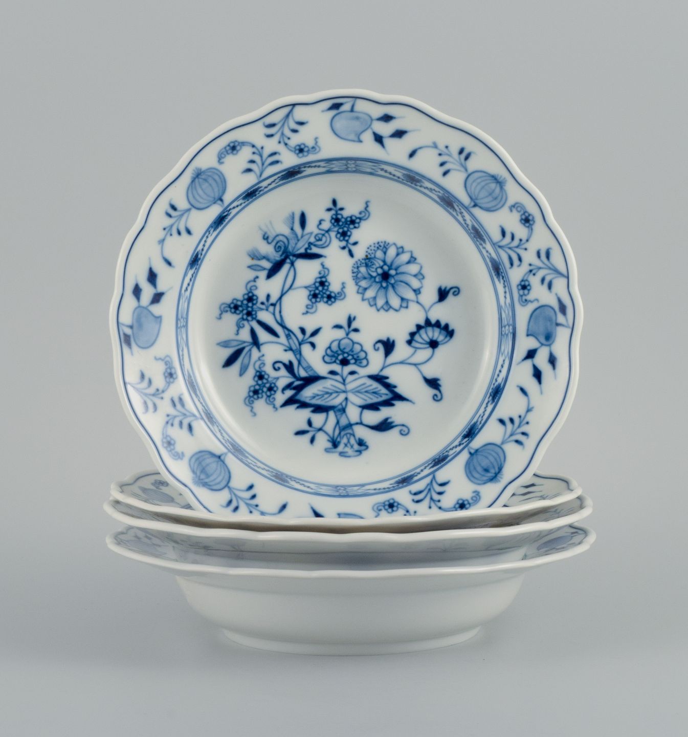 Meissen, a set of four deep plates, hand painted, Blue Onion. Late 19th century. In perfect condition. First factory quality. Marked Dimensions: D 23.4 x H 5.0 cm.