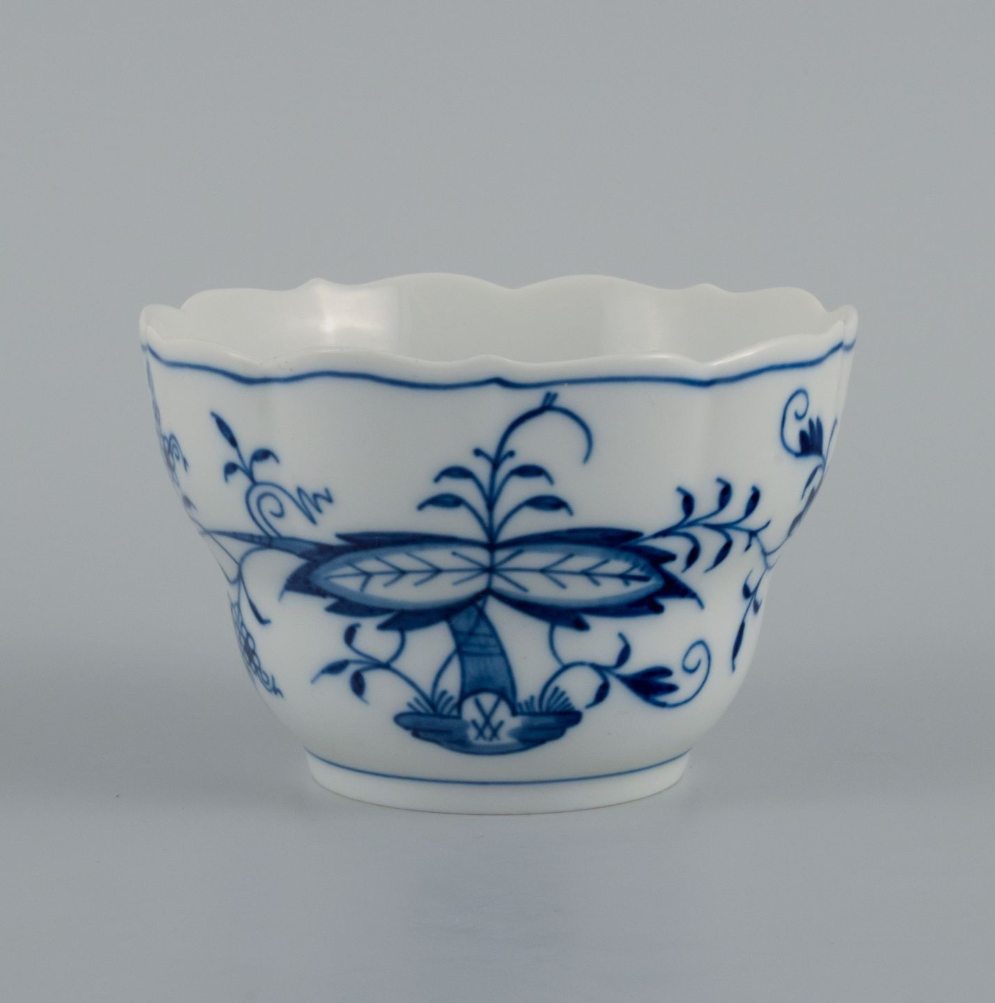 Meissen, three pieces Blue Onion - cup without handle, low cup and small plate.