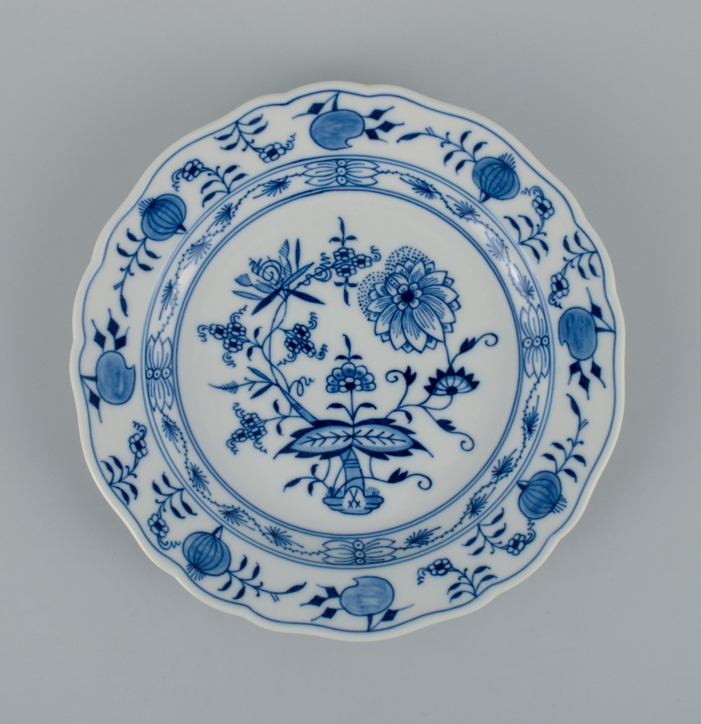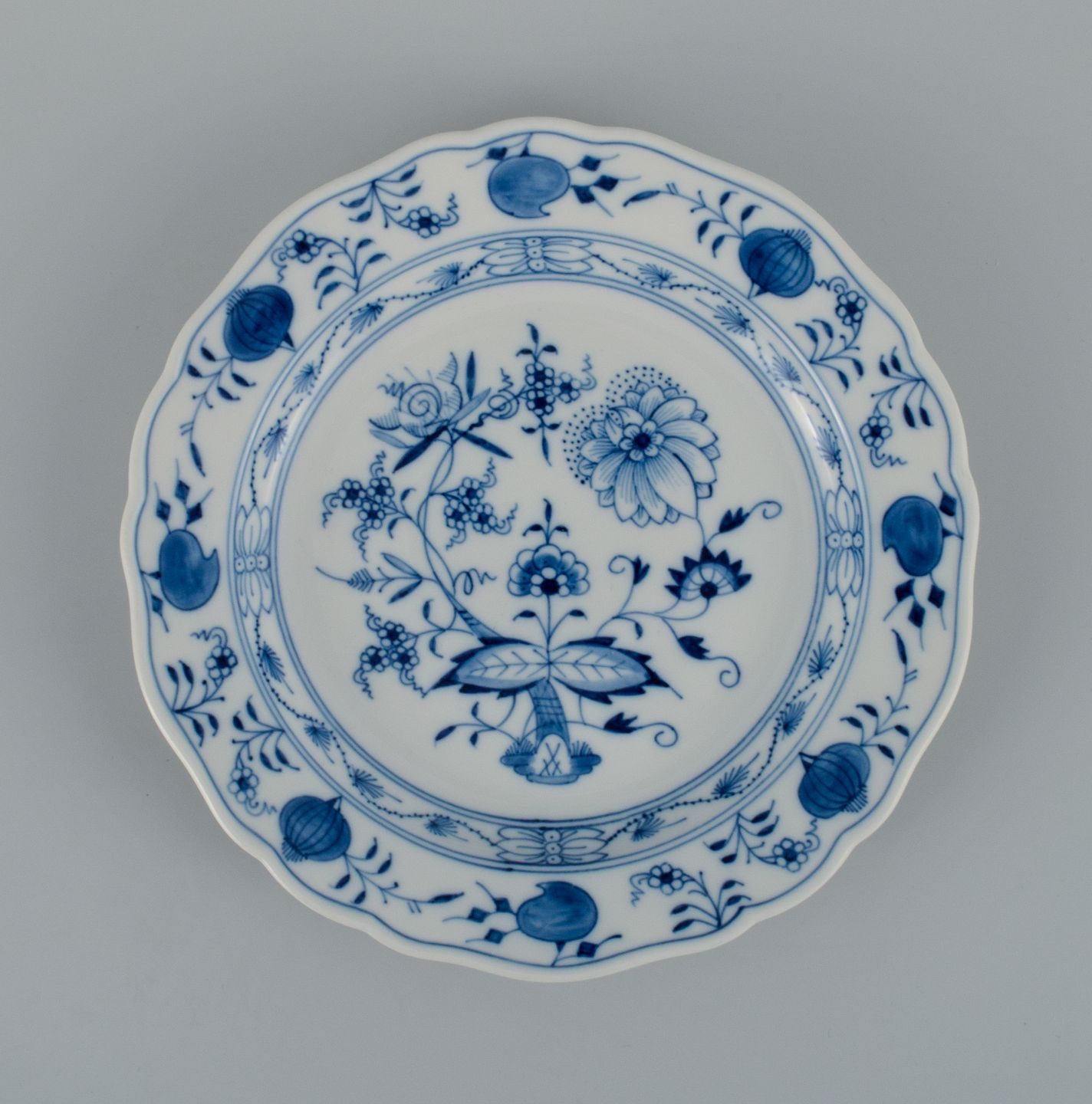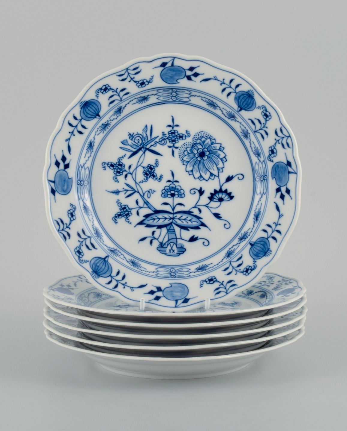 Meissen, et sæt på seks løgmønstret frokosttallerkner. Ca. 1900. Fjerde sortering. I perfekt stand. Stemplet. Mål: D 22,0 cm.