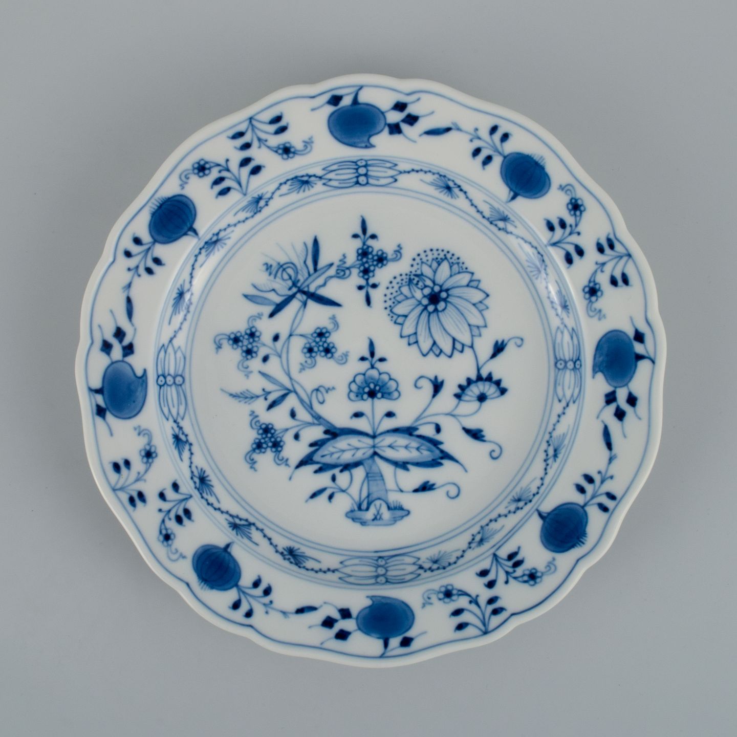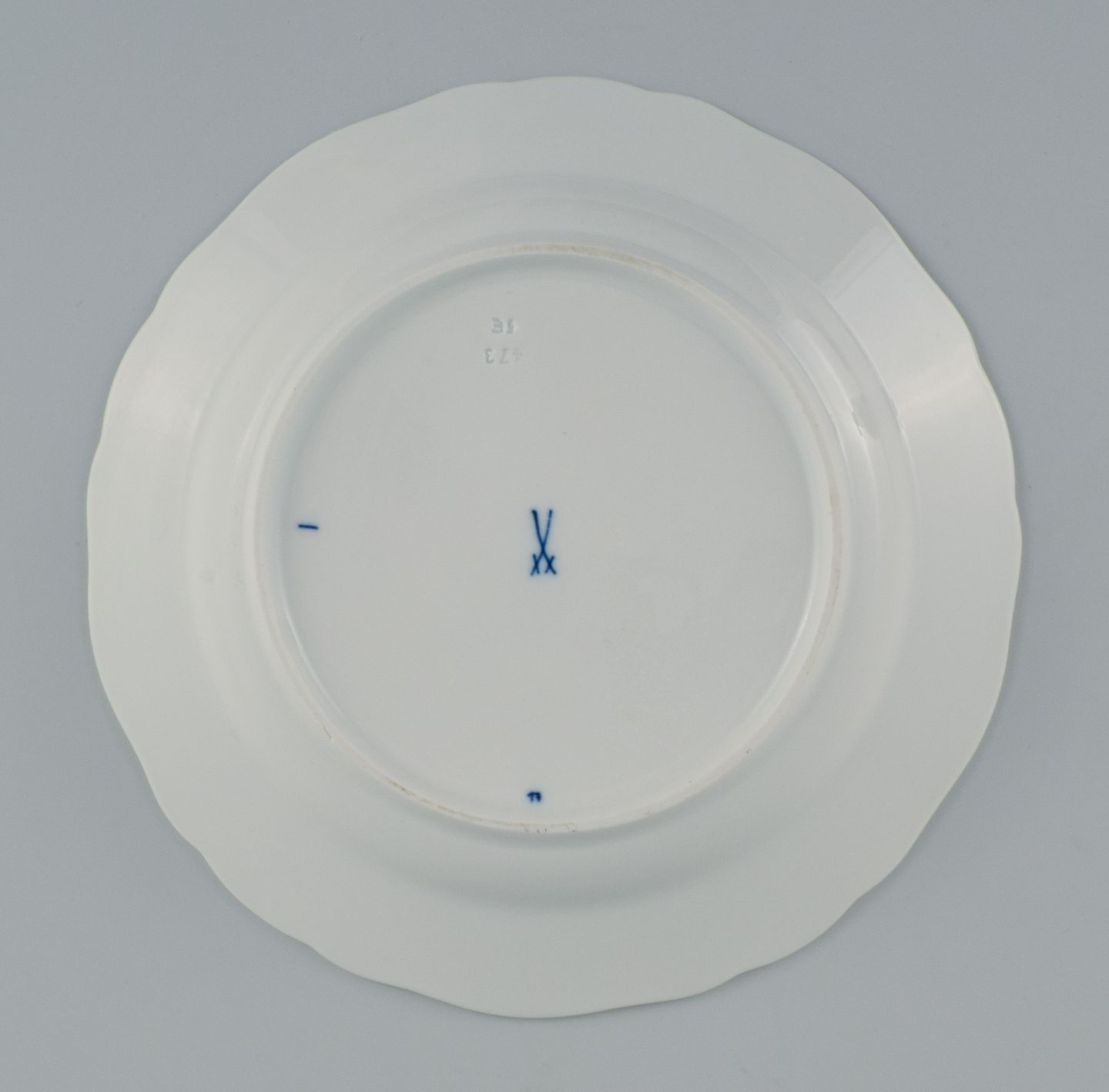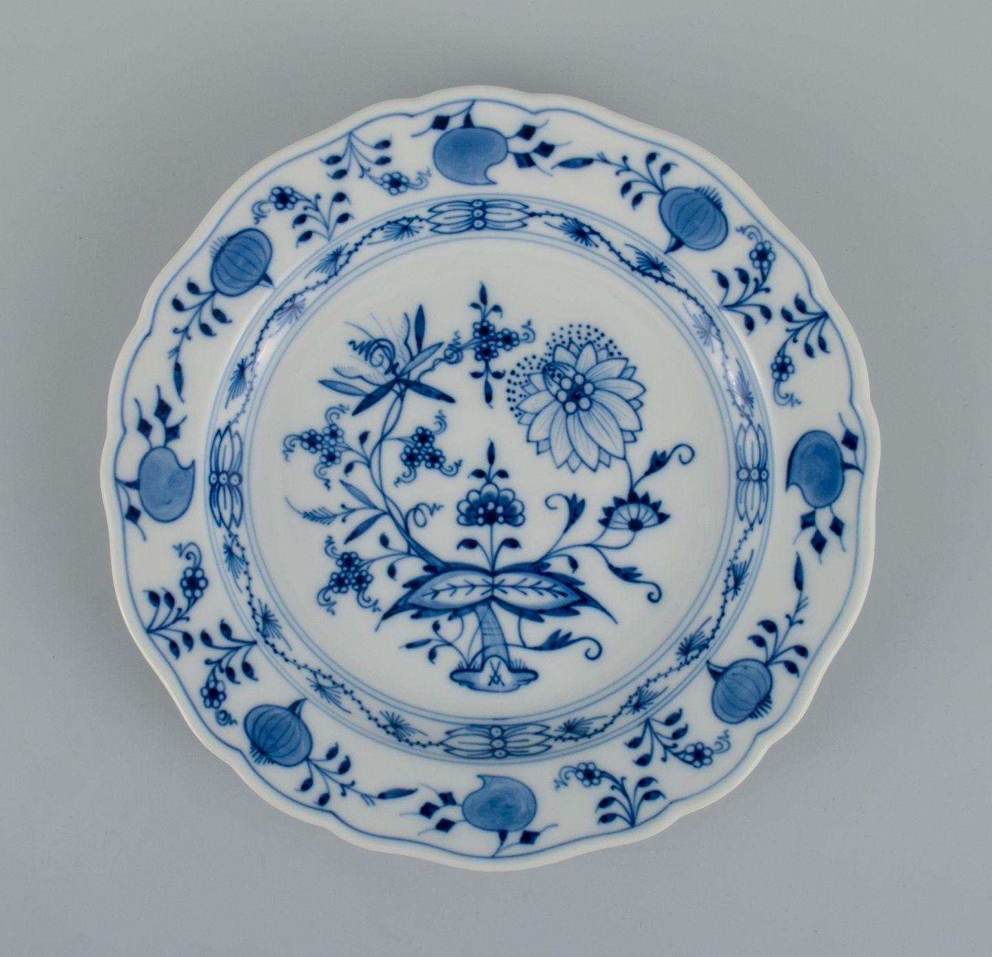 Meissen, et sæt på seks løgmønstret frokosttallerkner. Ca. 1900. Fjerde sortering. I perfekt stand. Stemplet. Mål: D 22,0 cm.