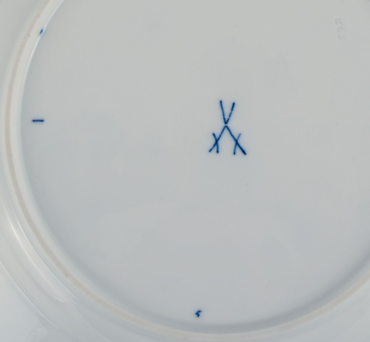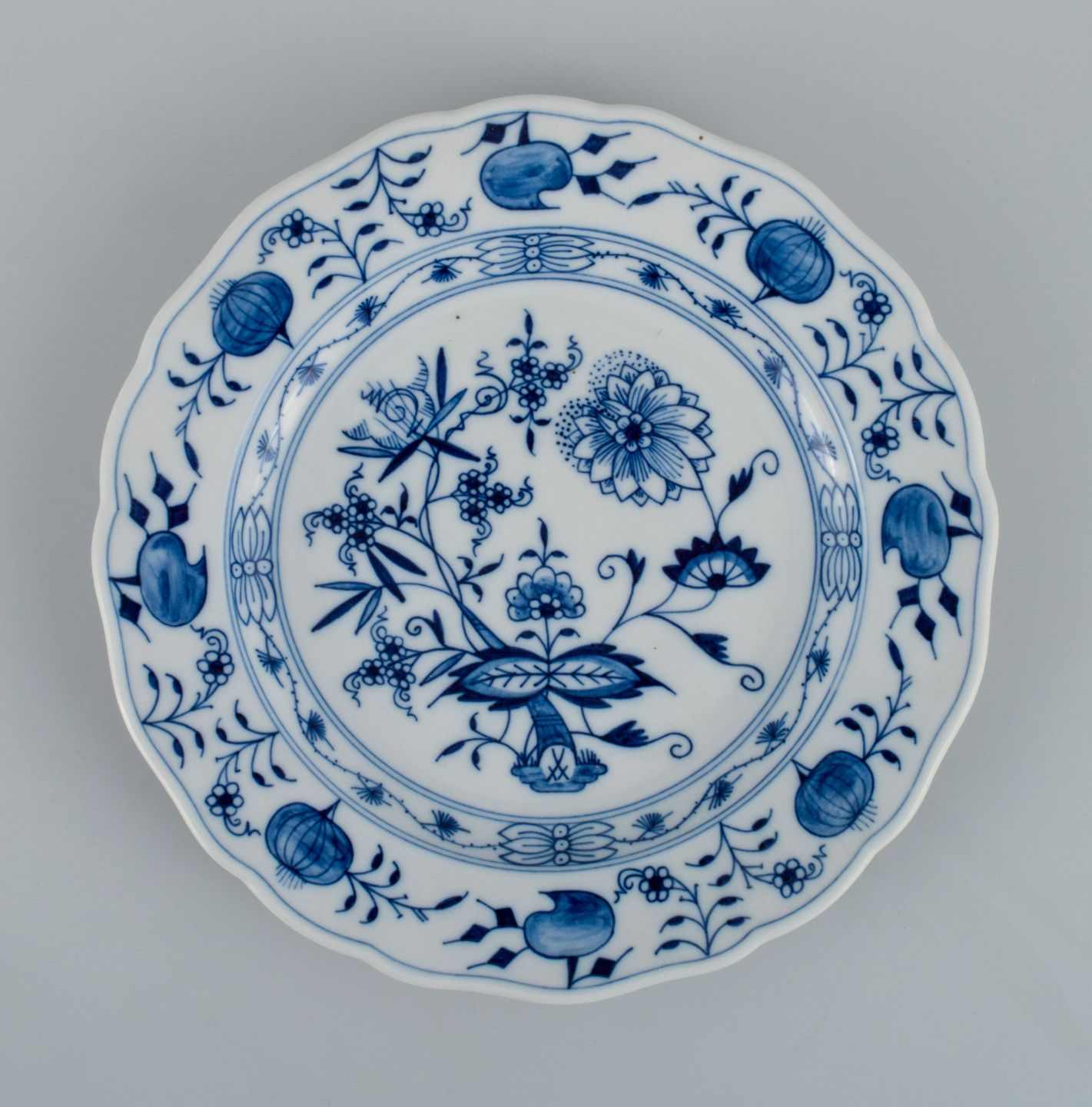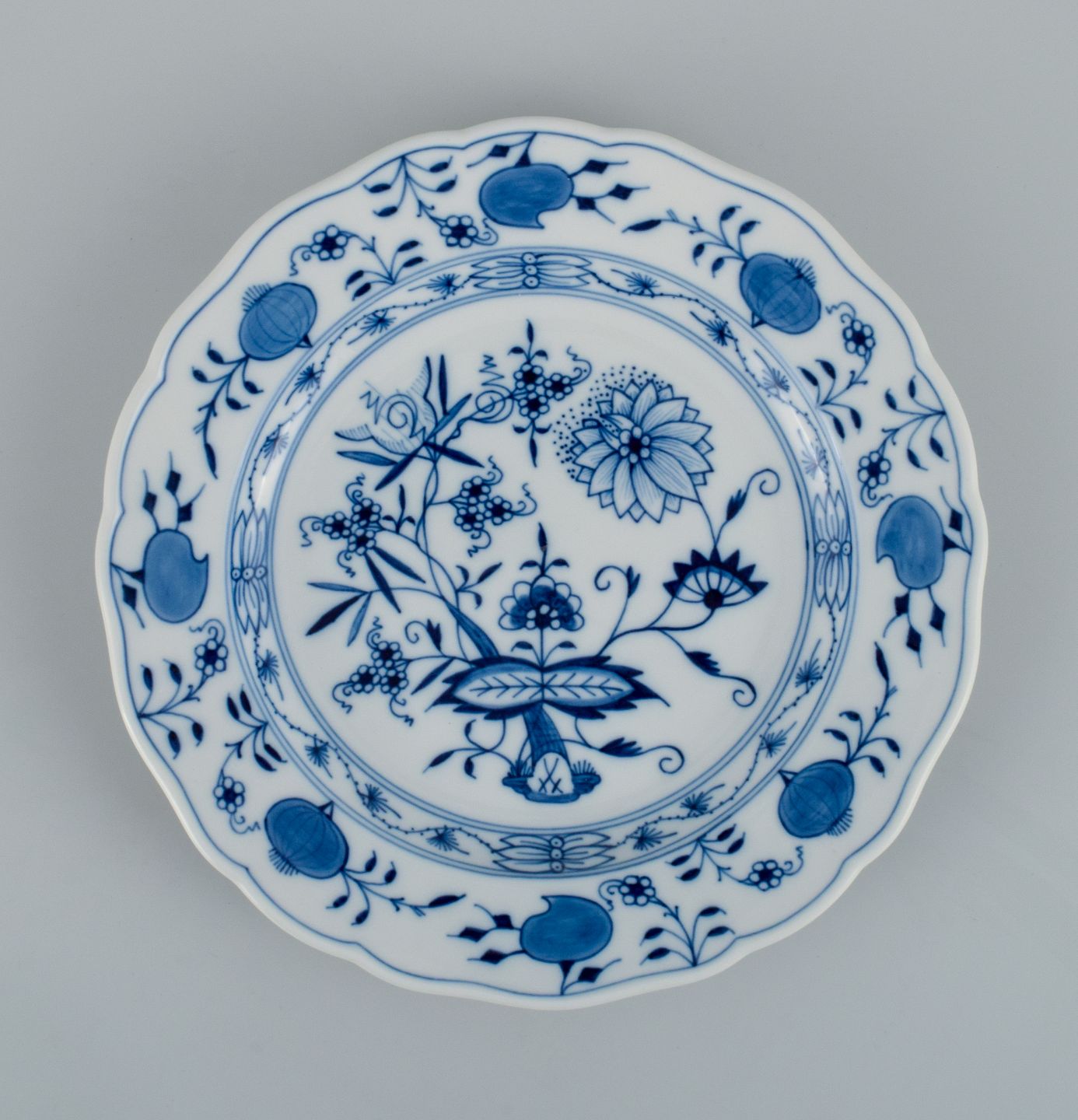 Meissen, et sæt på seks løgmønstret middagstallerkner. Ca. 1900. Fjerde sortering. I perfekt stand. Stemplet. Mål: D 25 x H 3,0 - 3,5 cm.