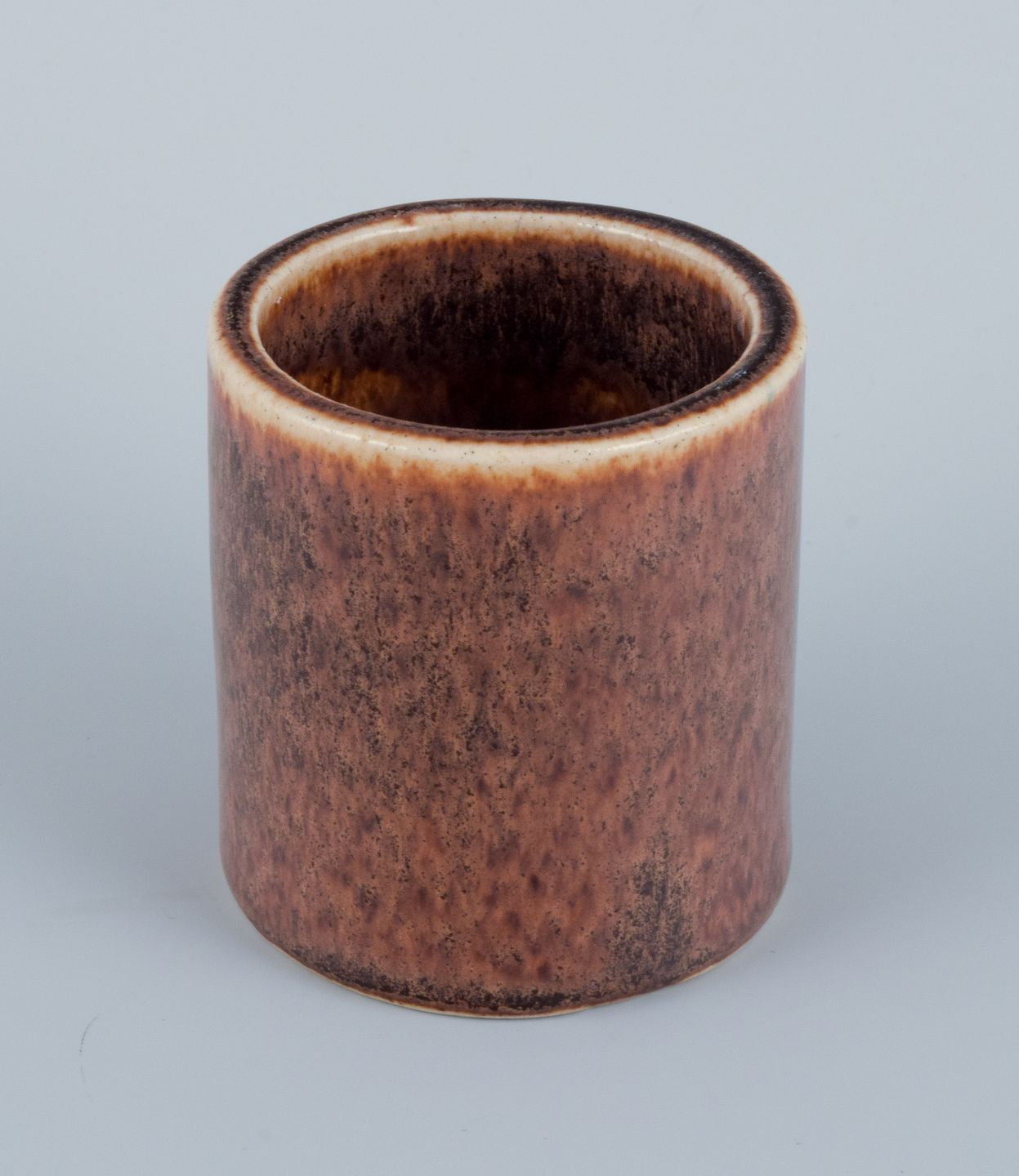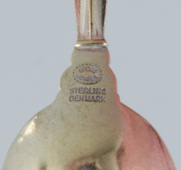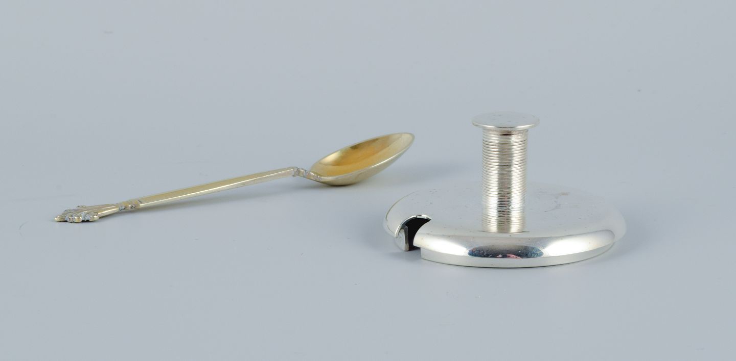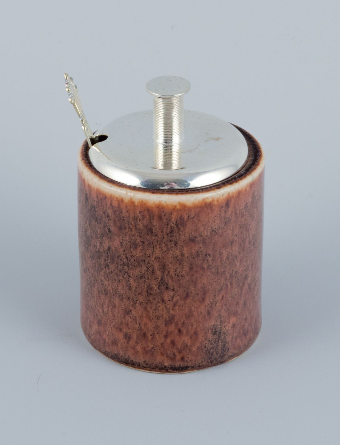 Saxbo ceramic mustard jar with Sterling silver lid by Frantz Hingelberg and Sterling silver Georg Jensen Acanthus spoon. Mid 20th century. Marked. In perfect condition. Dimensions: H 10.0 x D 6.0 cm.