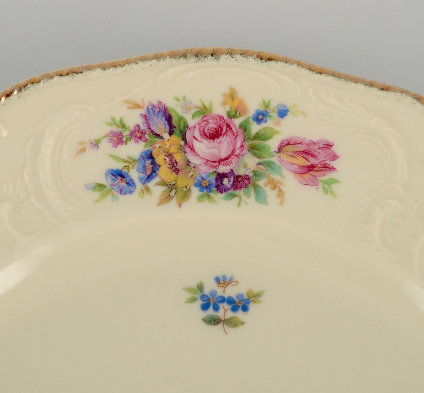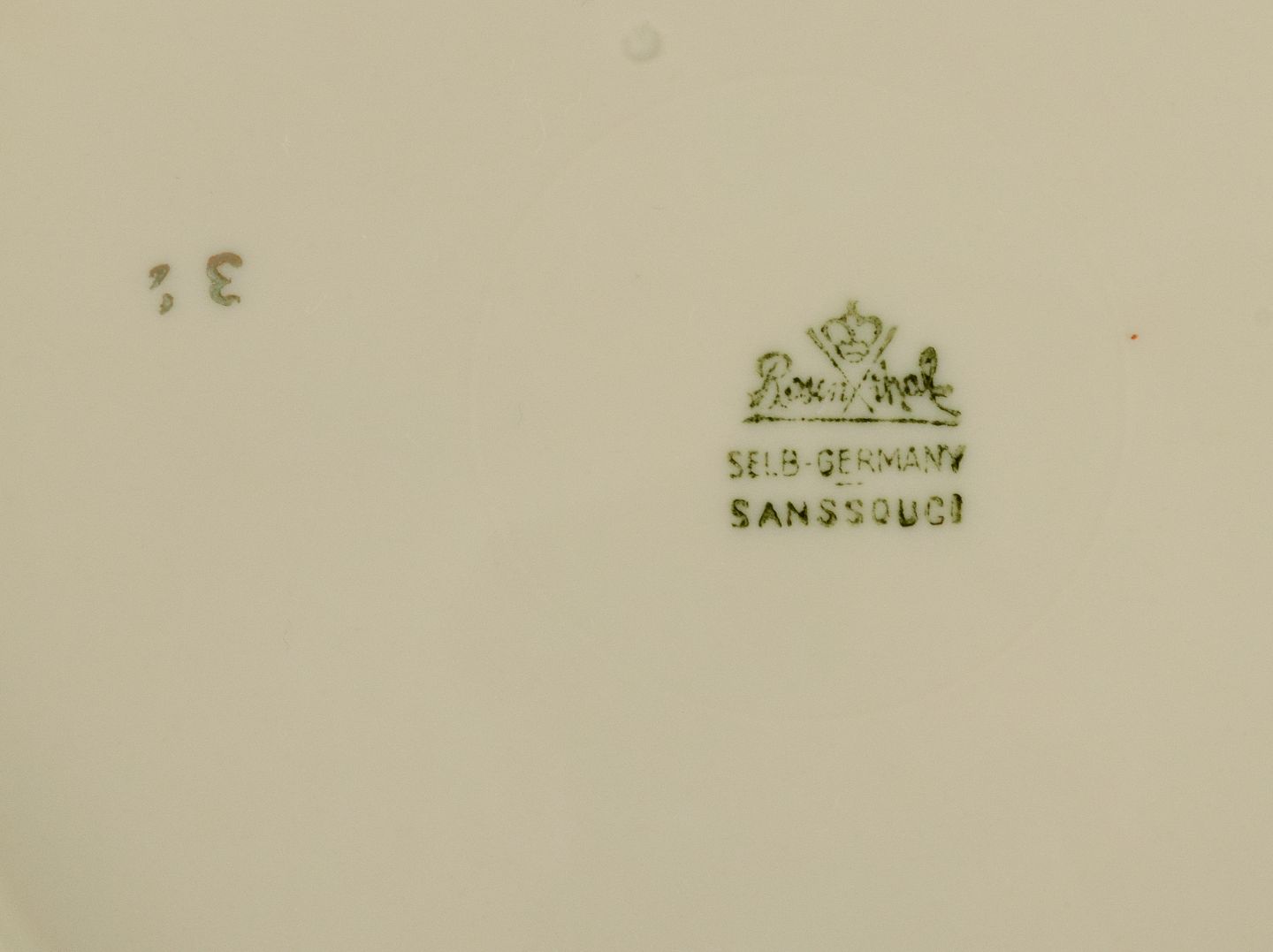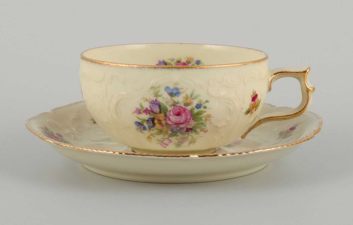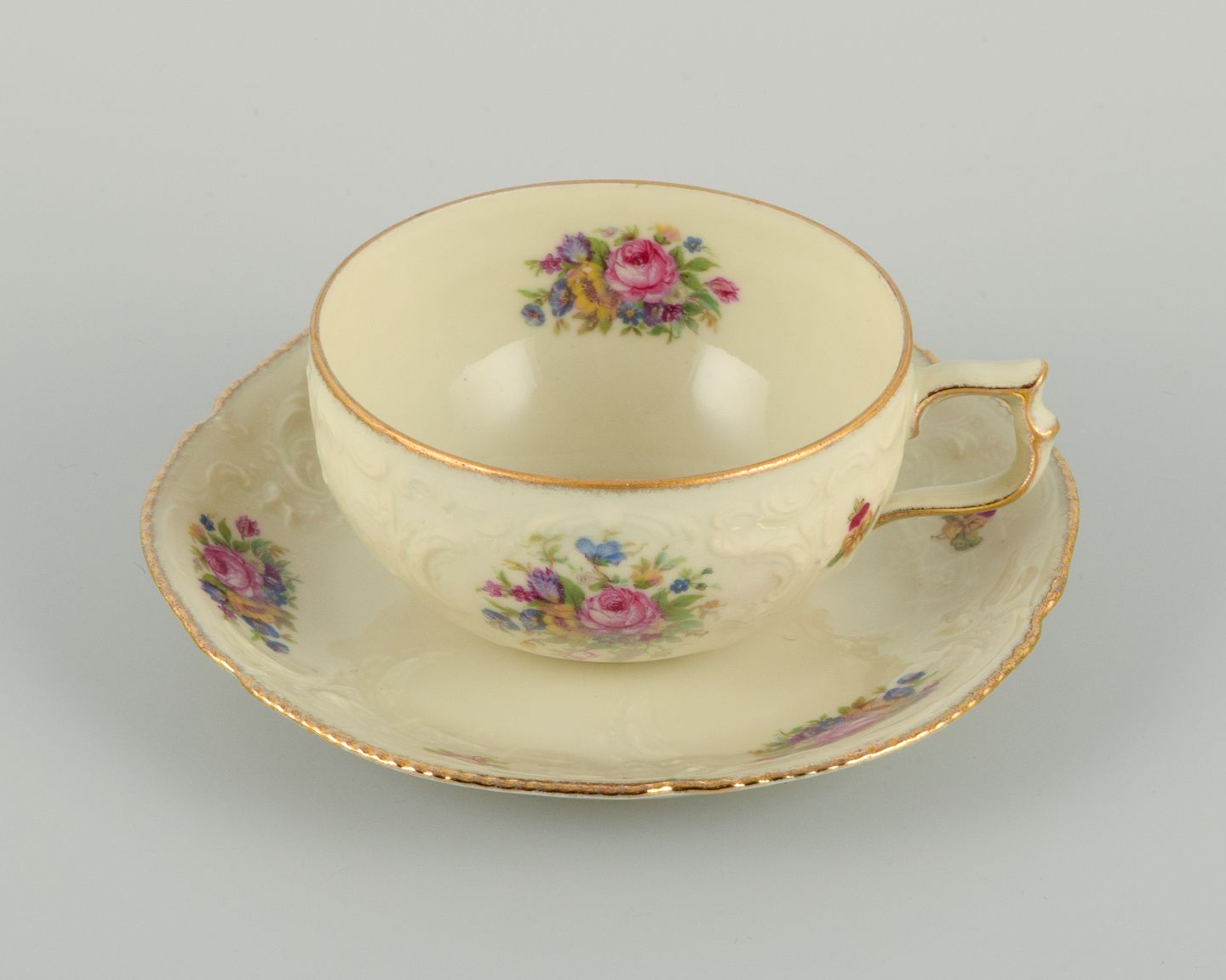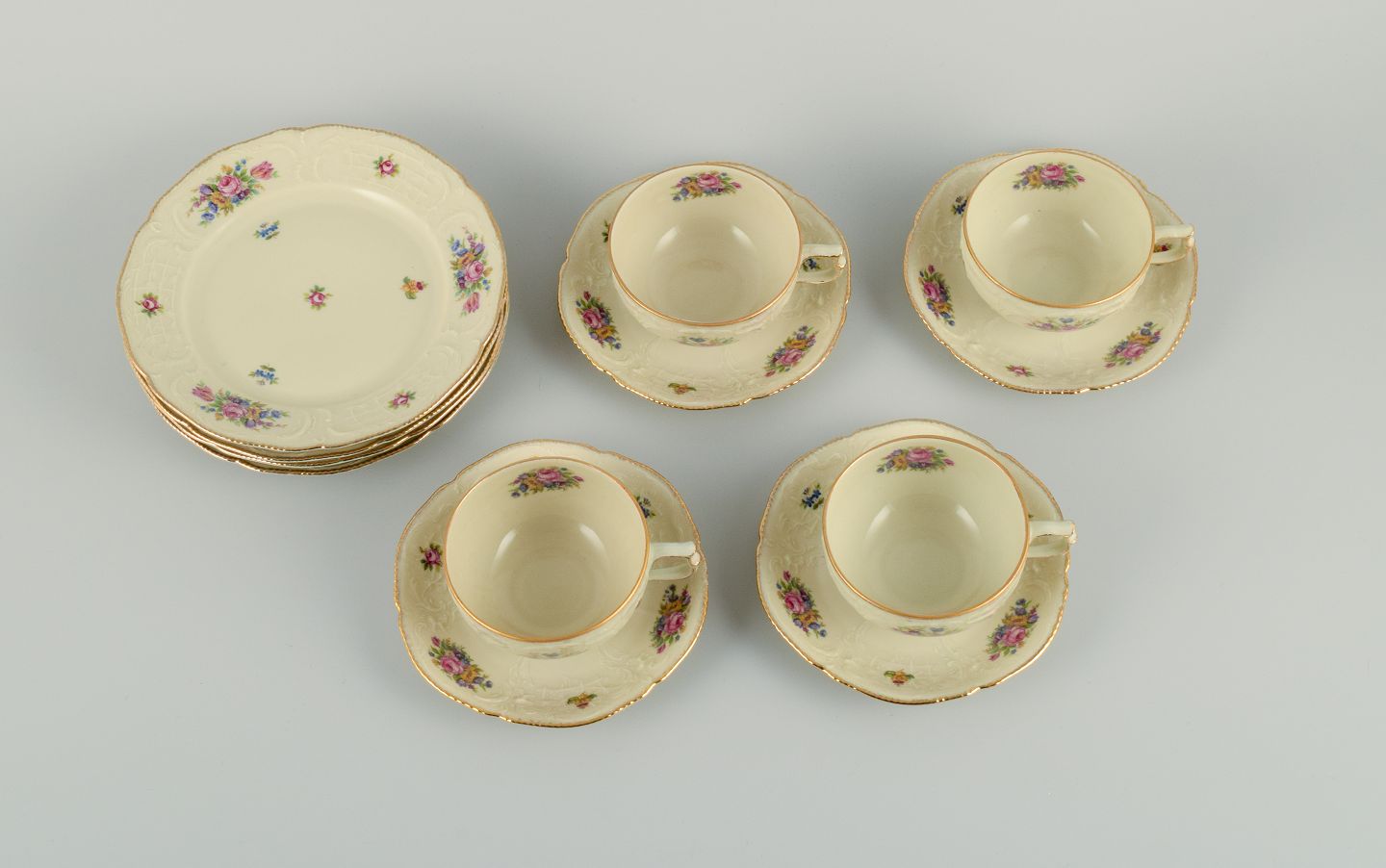 Rosenthal, Tyskland. "Sanssouci". Fire kaffekopper med tilhørende underkopper samt kagetallerkner dekoreret med blomster og guld.