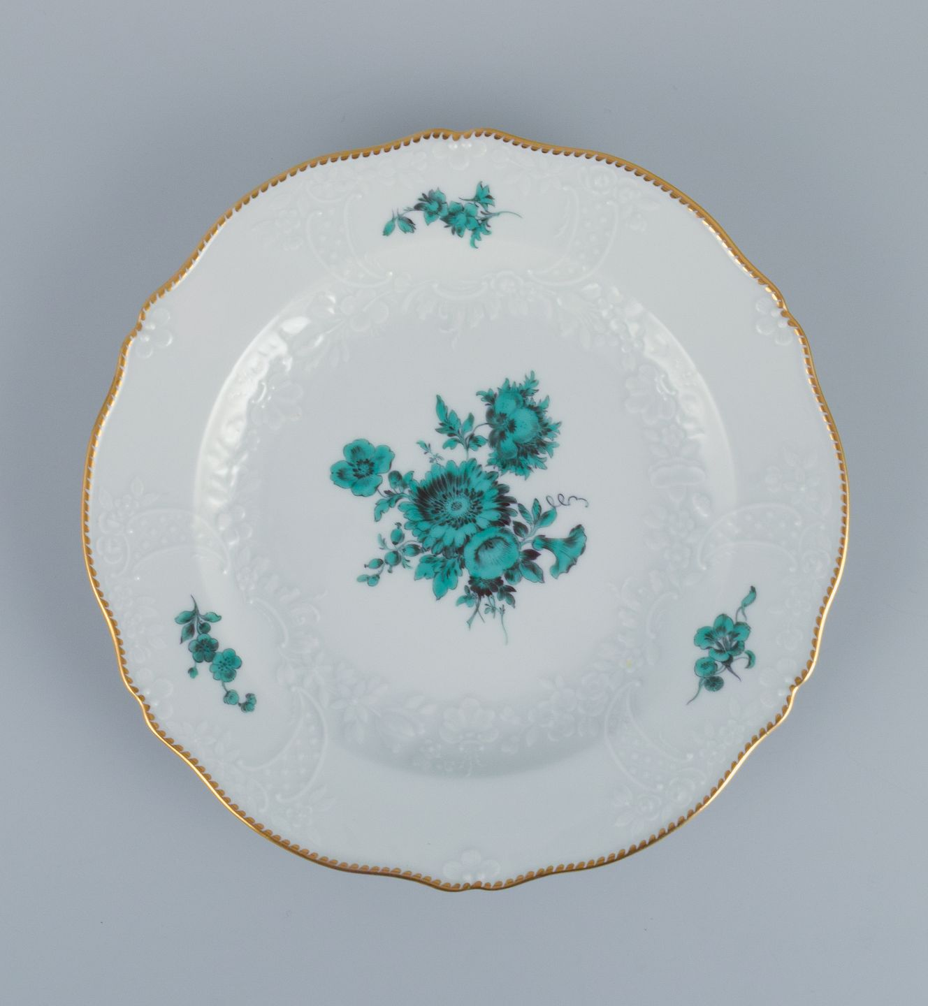 Meissen, Tyskland, et sæt på seks "Neu Marseille" middagstallerkner håndmalet med grønne blomster og guldkant.