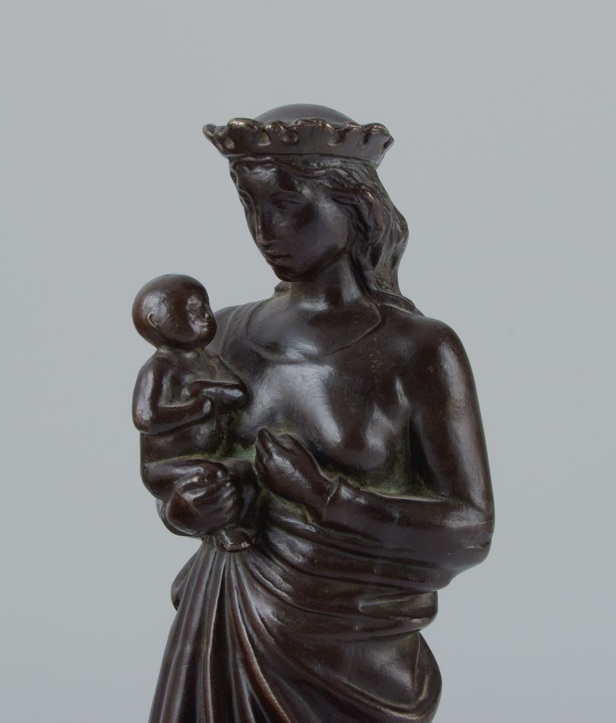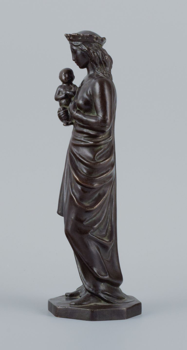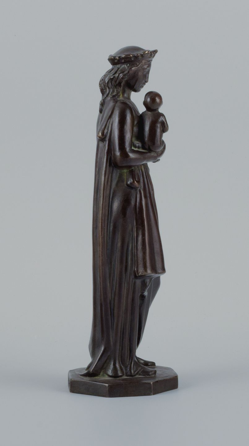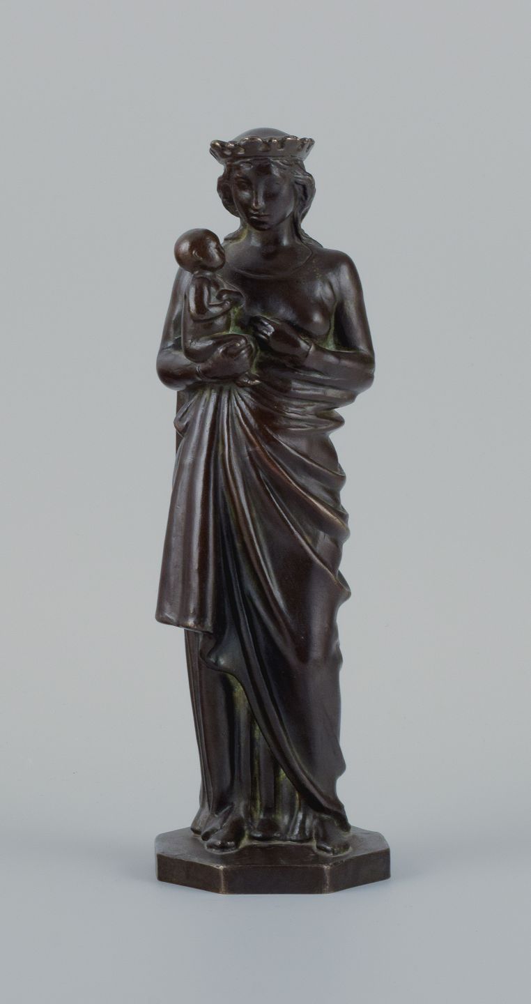 Johan G. C. Galster (1910-1997) dansk skulptør, bronzefigur af Jomfru Marie og barn. Sidste halvdel af 1900-tallet. I flot stand med god patina. Mål: H 26,0 x D 8,0 cm.