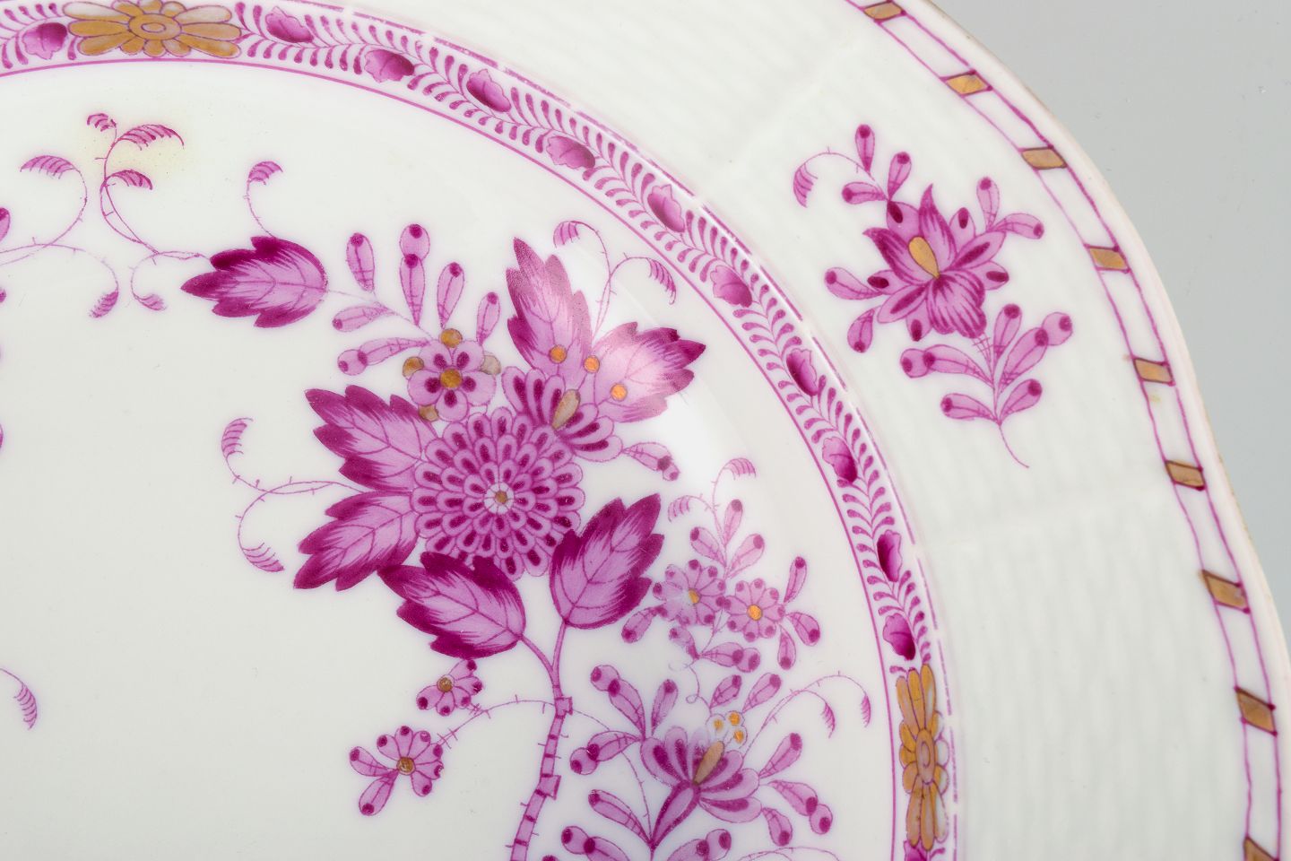 Herend, Indian Basket Raspberry, Ungarn, et sæt på seks store dybe tallerkner. Håndmalet i purpur med guldekoration. 1920/30’erne. I flot stand med minimalt slid i guldet. Stemplet. Mål: D 23,0 x H 4,7 cm.