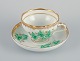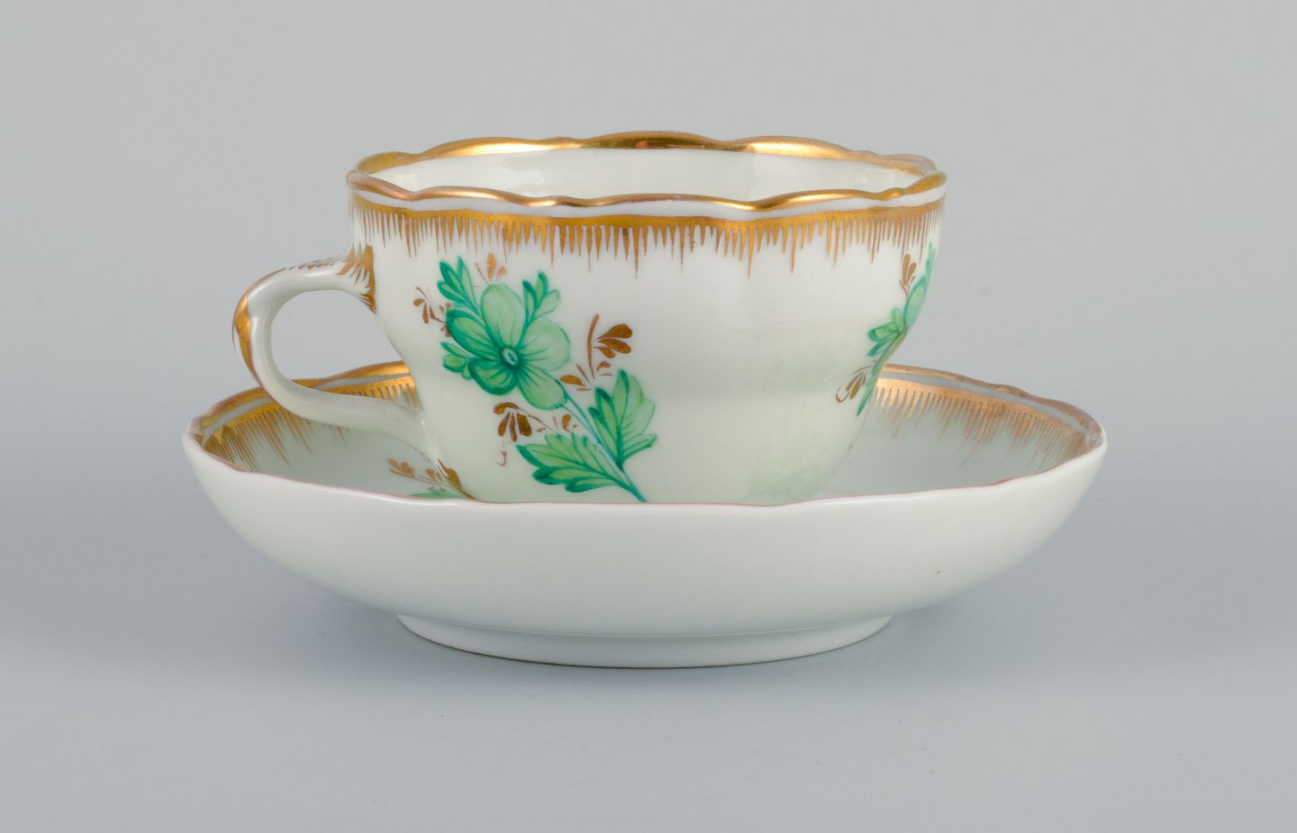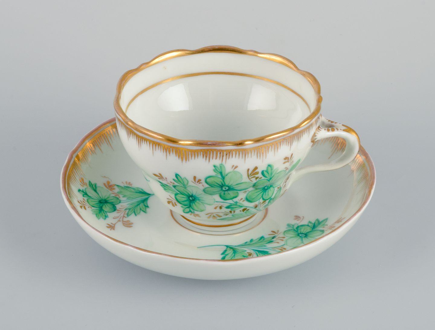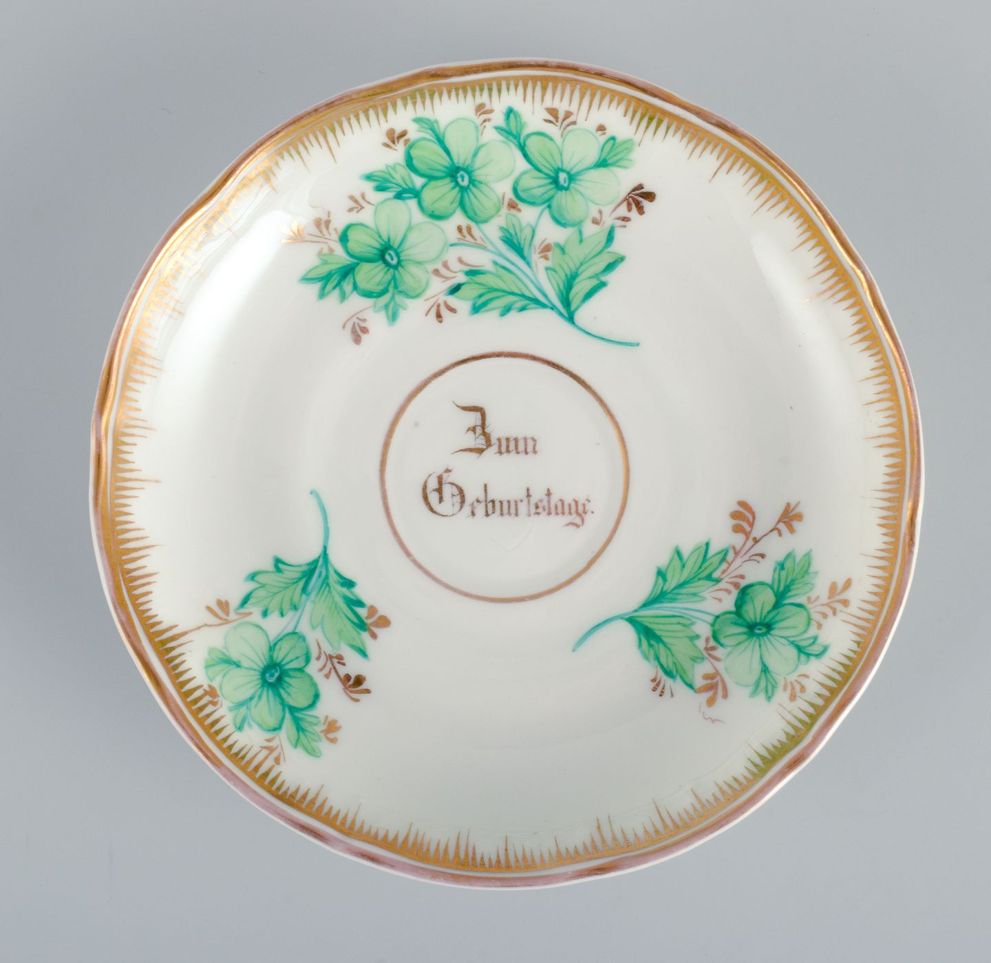 KPM, Berlin. Chokoladekop håndmalet med grønne blomster og gulddekoration. Stemplet. Midt 1800-tallet. Første sortering I flot stand med minimalt slid. Med fødselsdags-inskription. Kop: H 6,5 x D 9,3 cm.
