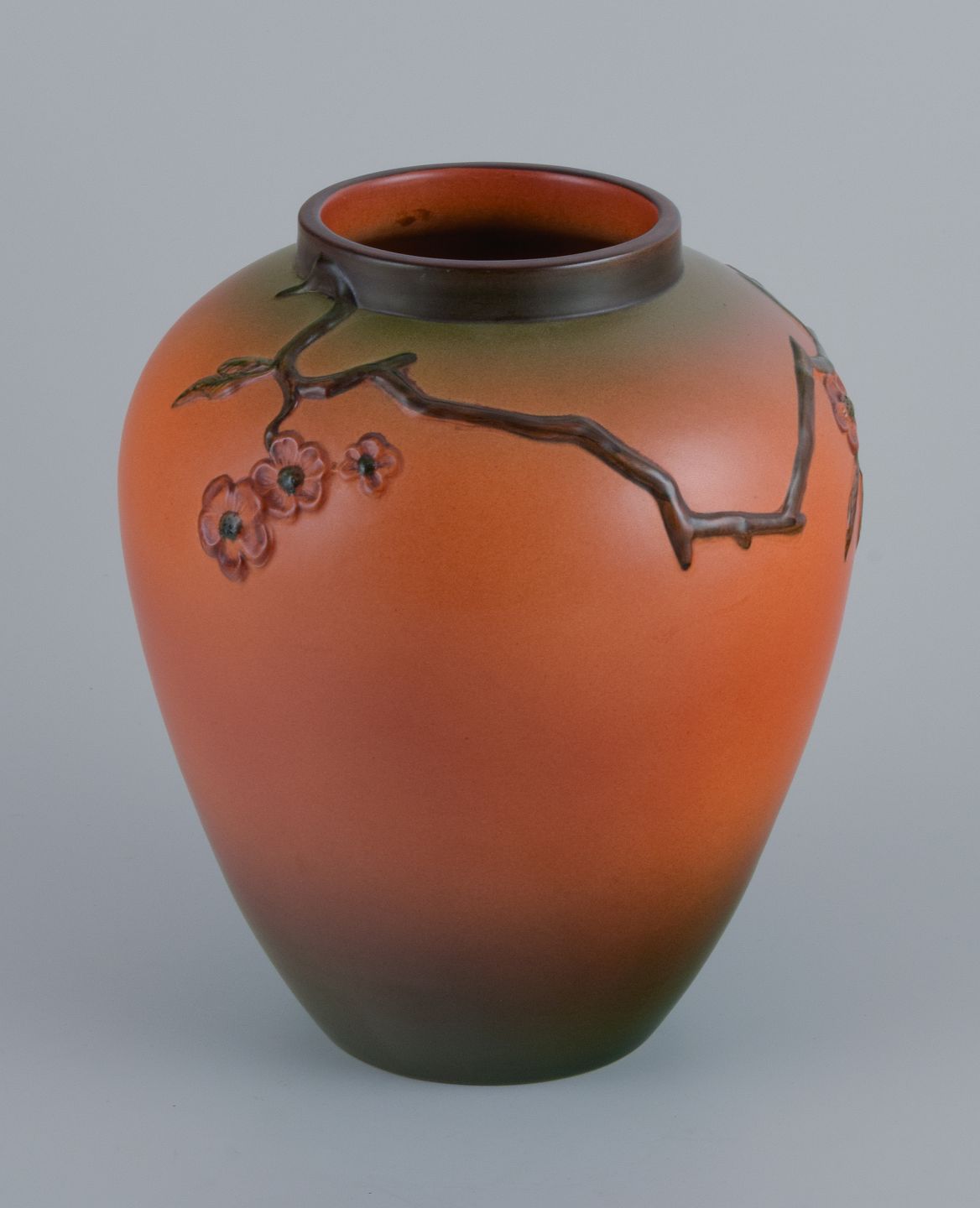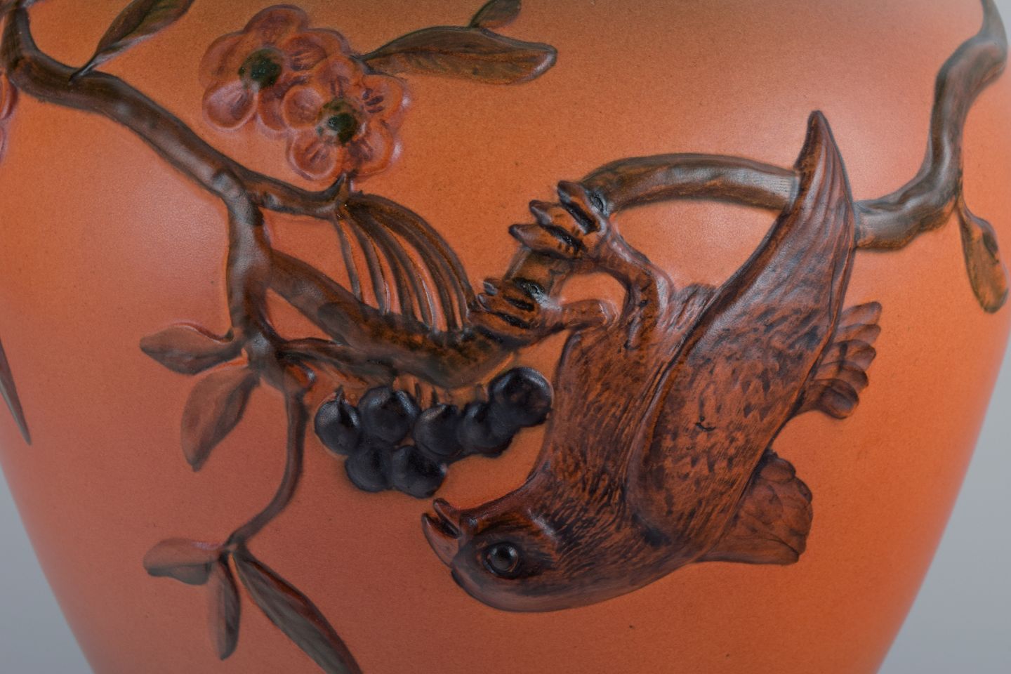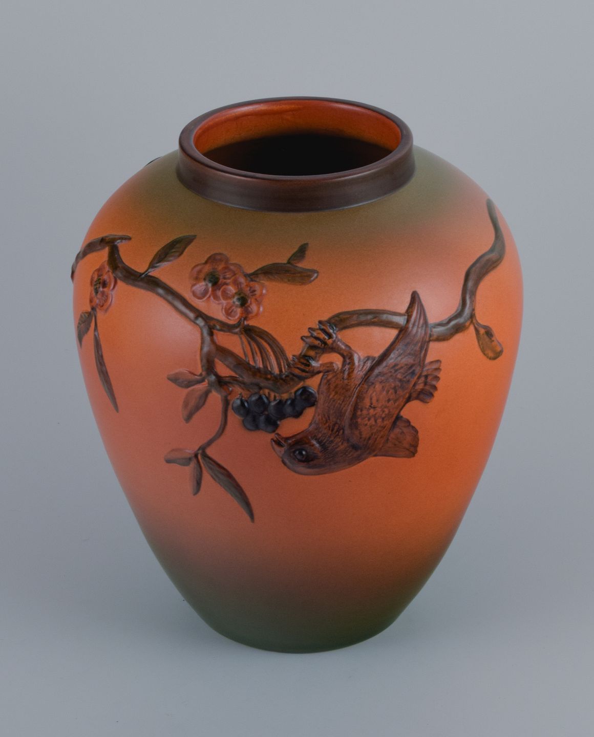 Ipsens Enke, sjælden vase med motiv af spisende fugl. Glasur i orange og grønne toner. 1920/30'erne. Modelnummer 430. Stemplet. I perfekt stand. Mål: D 20,0 x H 24,5 cm.
