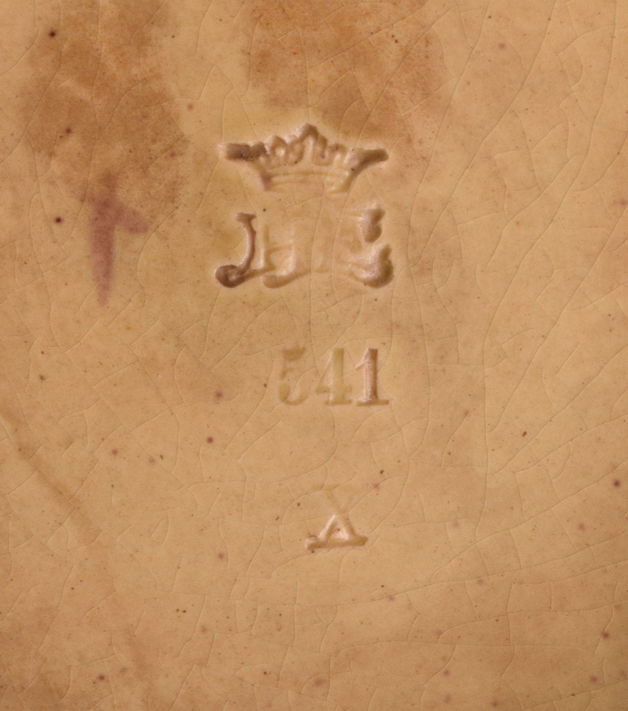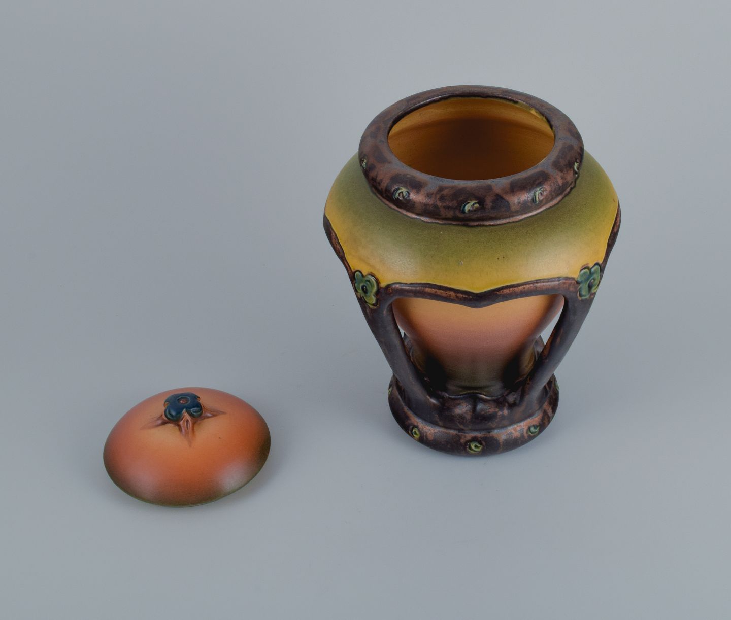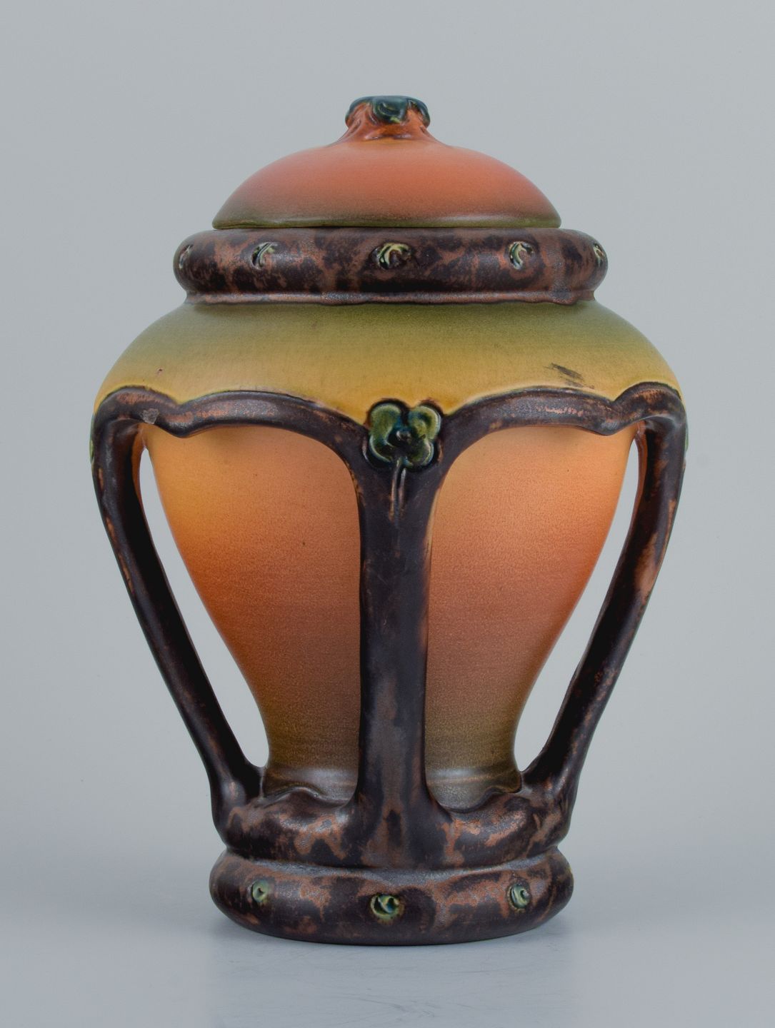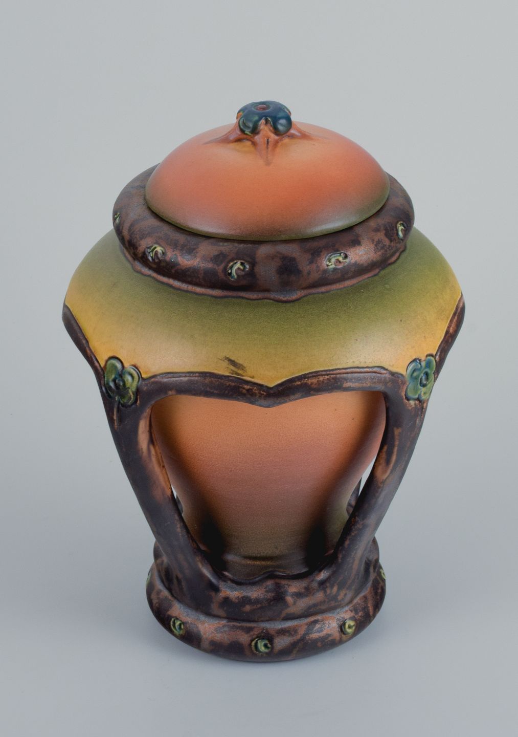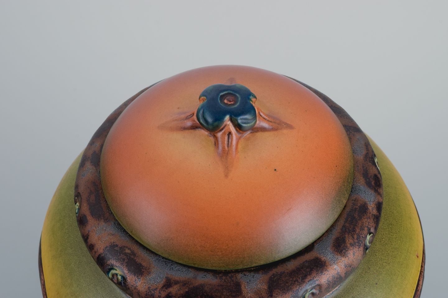 Ipsens Enke, skønvirke lågvase med glasur i orange og grønne toner.