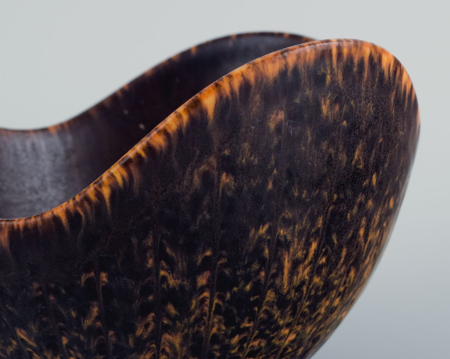 Gunnar Nylund (1904–1997) for Rörstrand. Skål i keramik, organisk form med mørkebrun og orange glasur. Midt 1900-tallet. I perfekt stand. Stemplet. Mål: D 14,0 x H 9,0 cm.