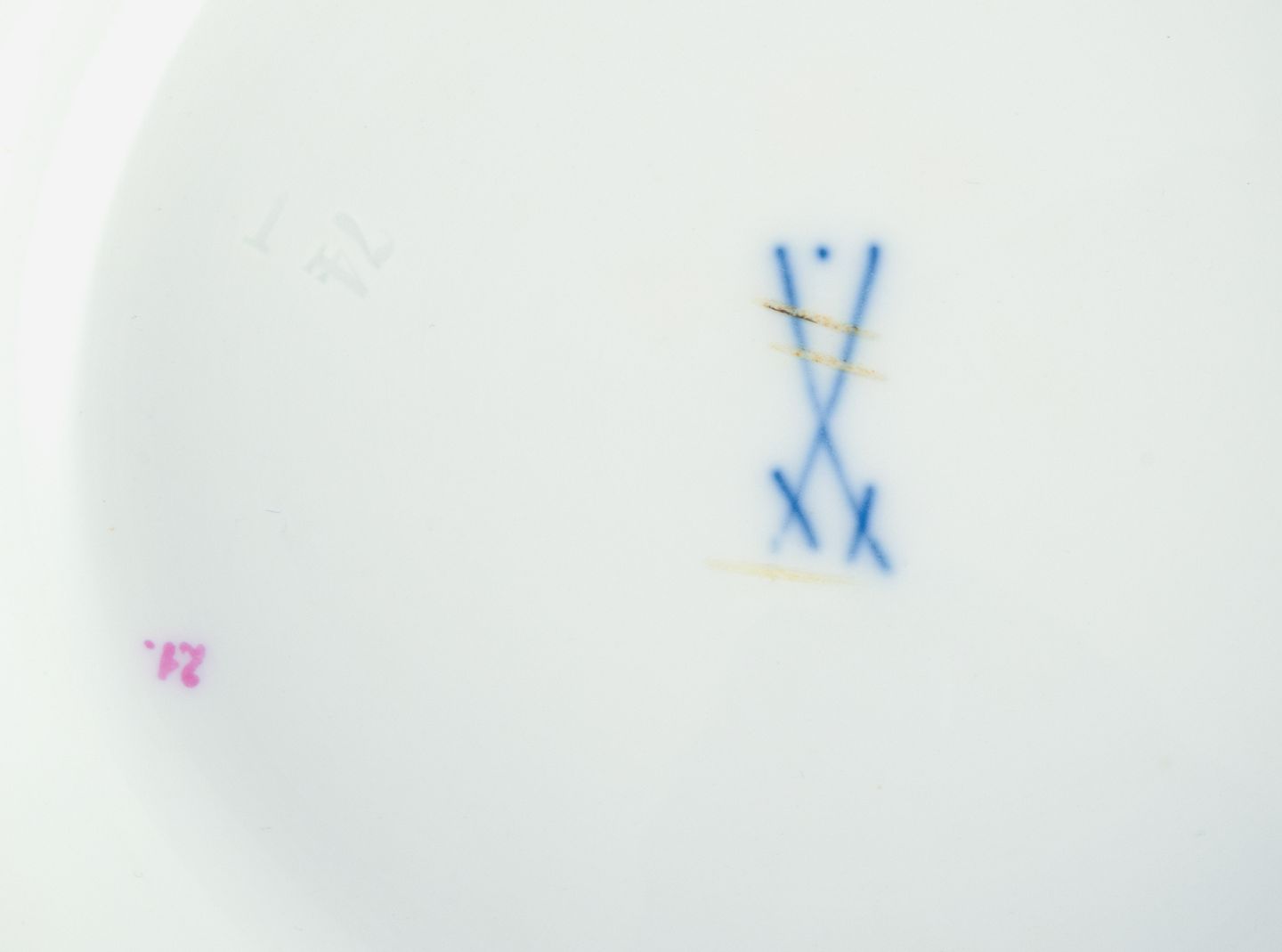 Meissen, Tyskland, Pink Indian, rund lågterrin. 1800-tallet. Stemplet. Fjerde sortering. I god stand med skår og ca. 5 cm lang hårrevne. Mål: D 34,5 x H 19,0 cm.