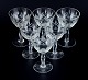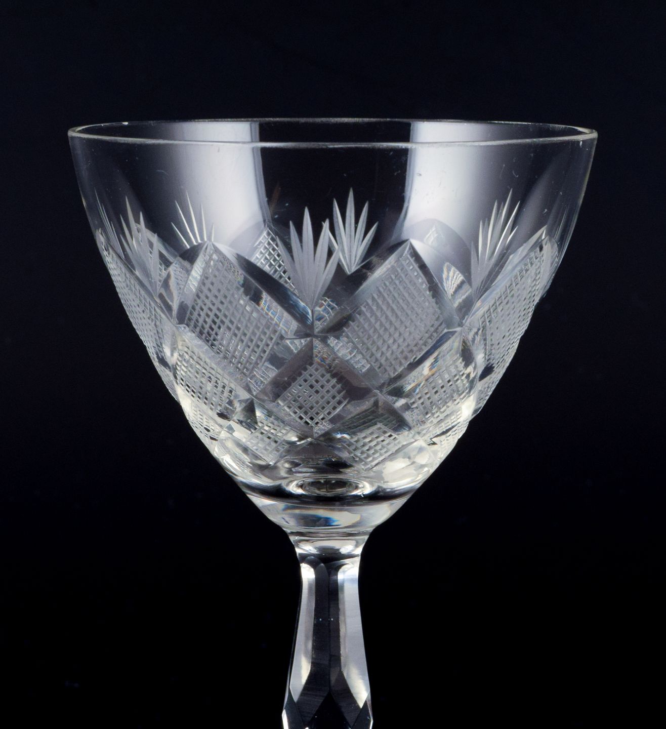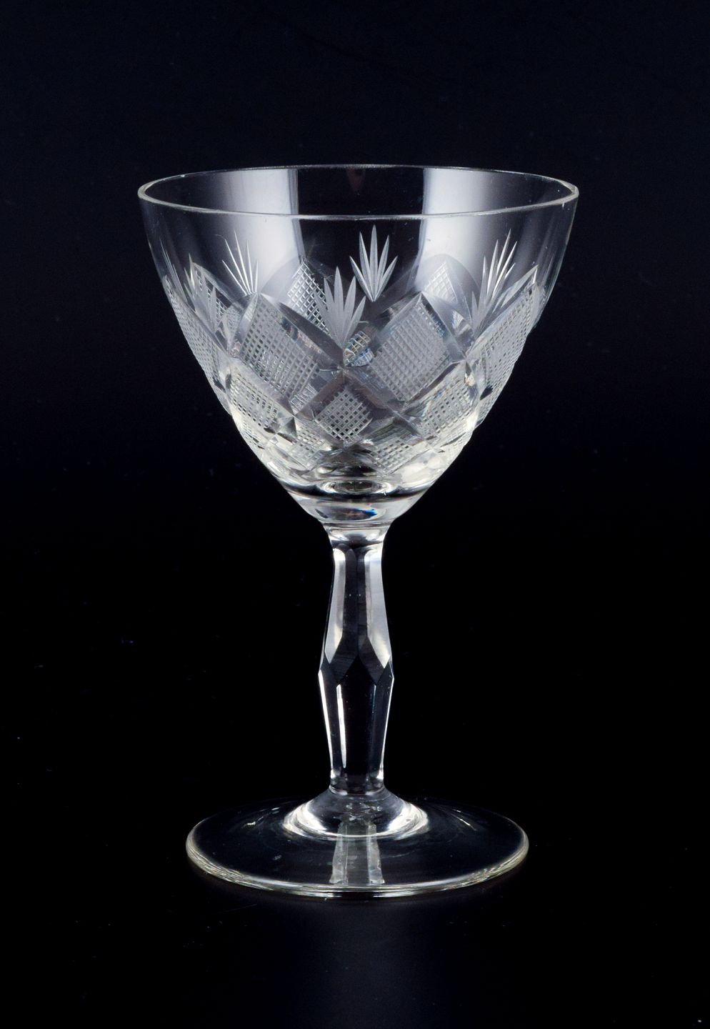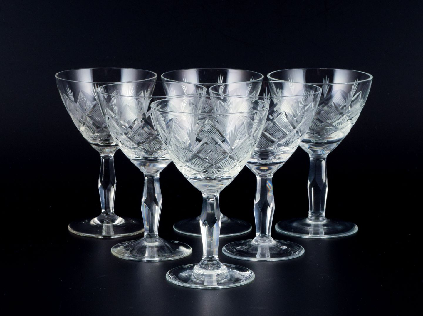 Wien Antik, Lyngby Glas, seks sherryglas i klart glas. Facetslebet stilk og krydsslebet kumme. 1930/40’erne. I perfekt stand. Mål: H 10,0 x D 6,5 cm.