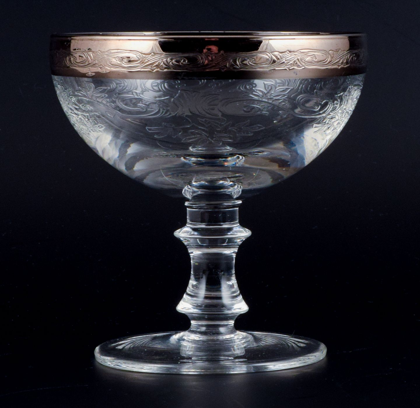 Murano, Italy, six mouth-blown engraved champagne glasses with silver rim. Mid 20th century. In perfect condition. Dimensions: H 12.2 x 10.0 cm.