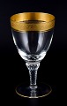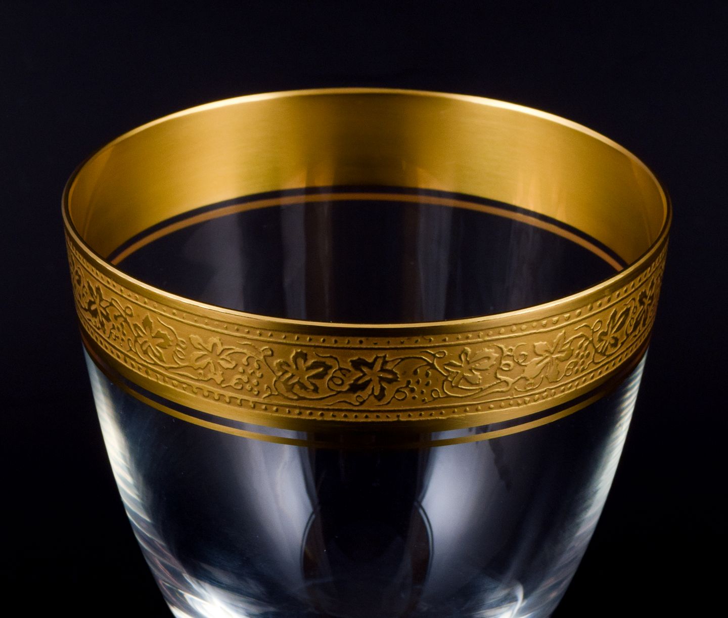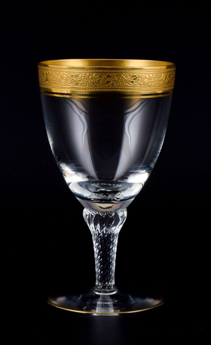 Rimpler Kristall, Zwiesel, Tyskland, fem mundblæst krystal rødvinsglas med guldkant dekoreret med vindruer og vinblade.