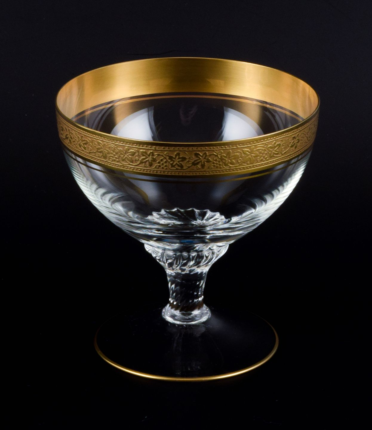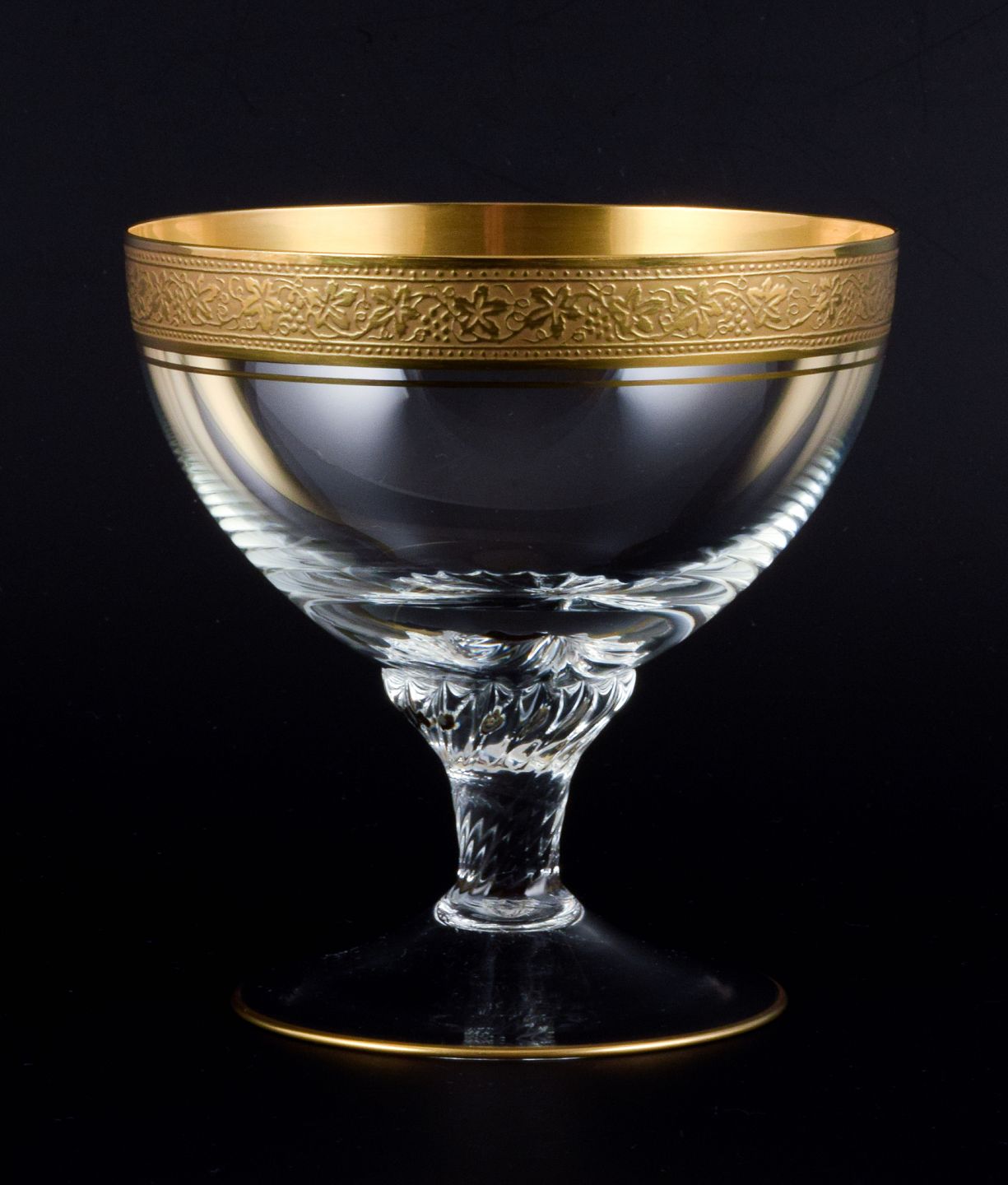 Rimpler Kristall, Zwiesel, Tyskland, fire mundblæst krystal champagneskåle med guldkant dekoreret med vindruer og vinblade. 1960'erne. I perfekt stand. Mål: H 10,5 x 10,0 cm.