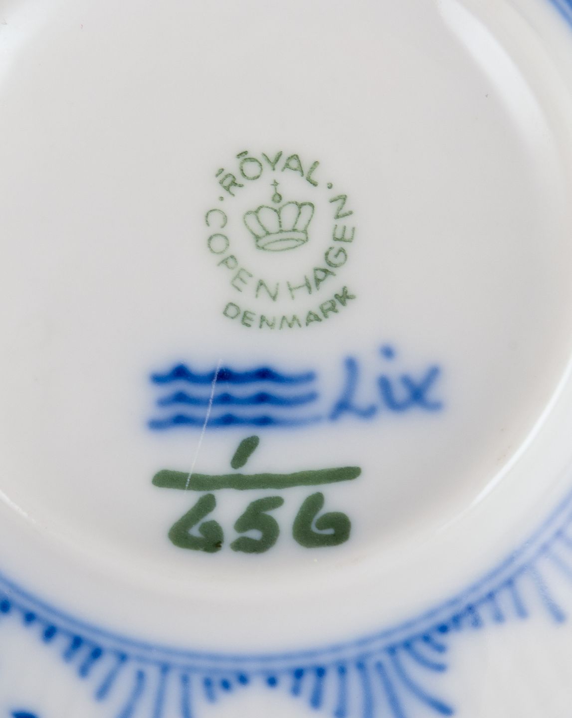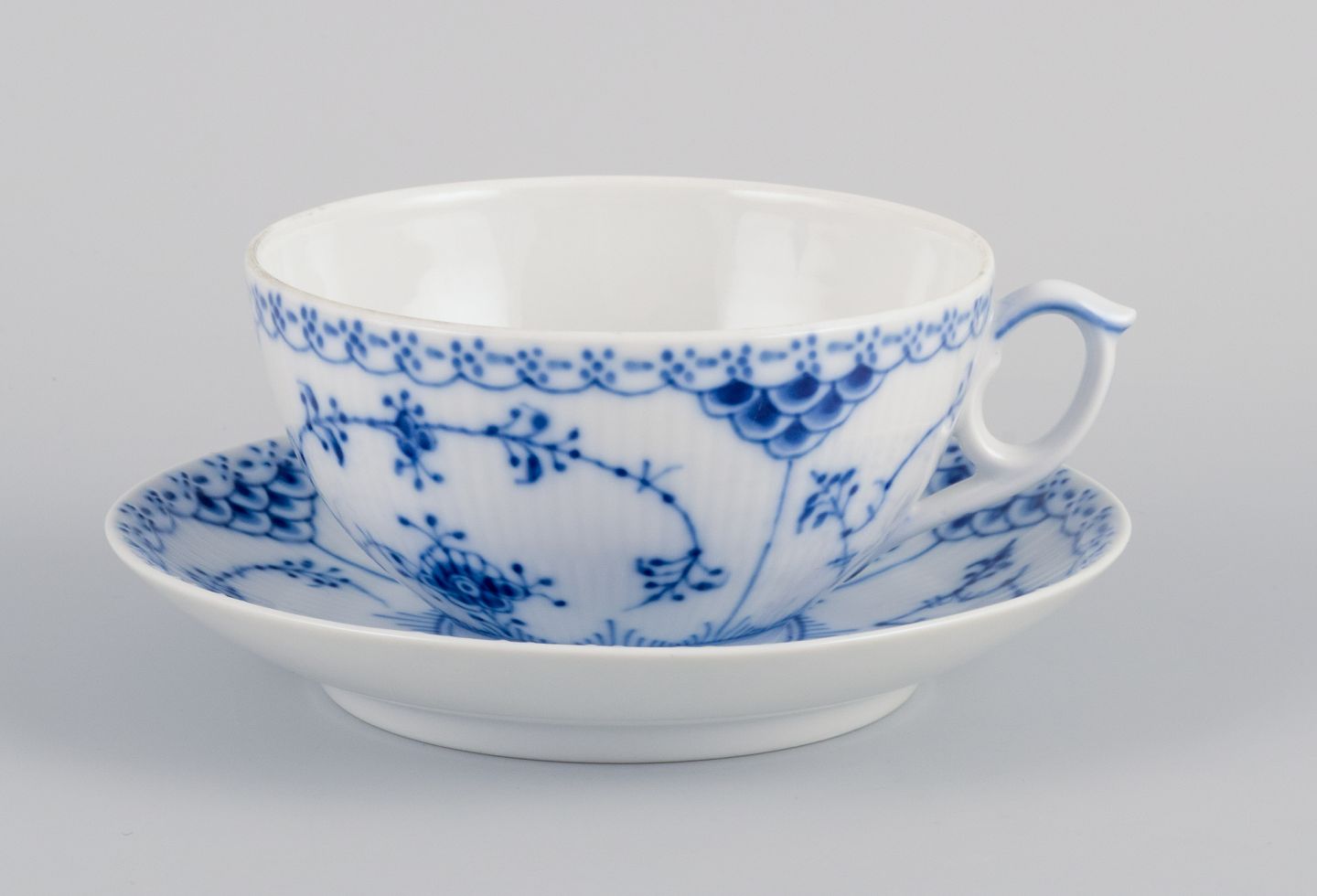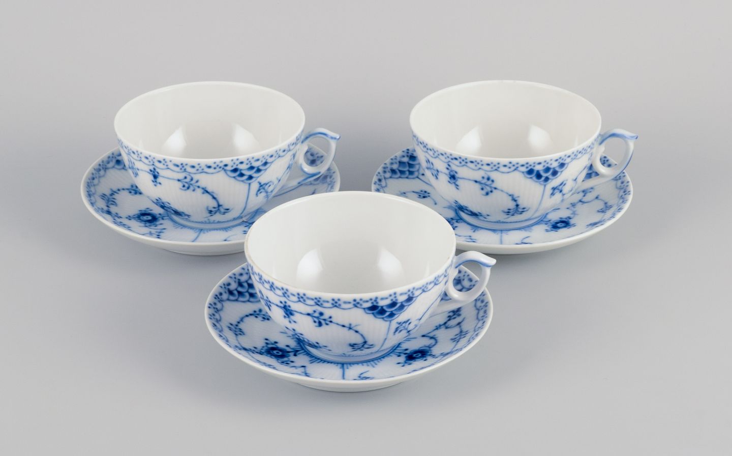 Royal Copenhagen, Musselmalet Halvblonde. Et sæt på tre par store tekopper. Model 1/656. Anden sortering. Stemplet. I perfekt stand. Kop måler: D 10,5 (uden hank) x H 5,8 cm. Underkop: D 14,5 cm.