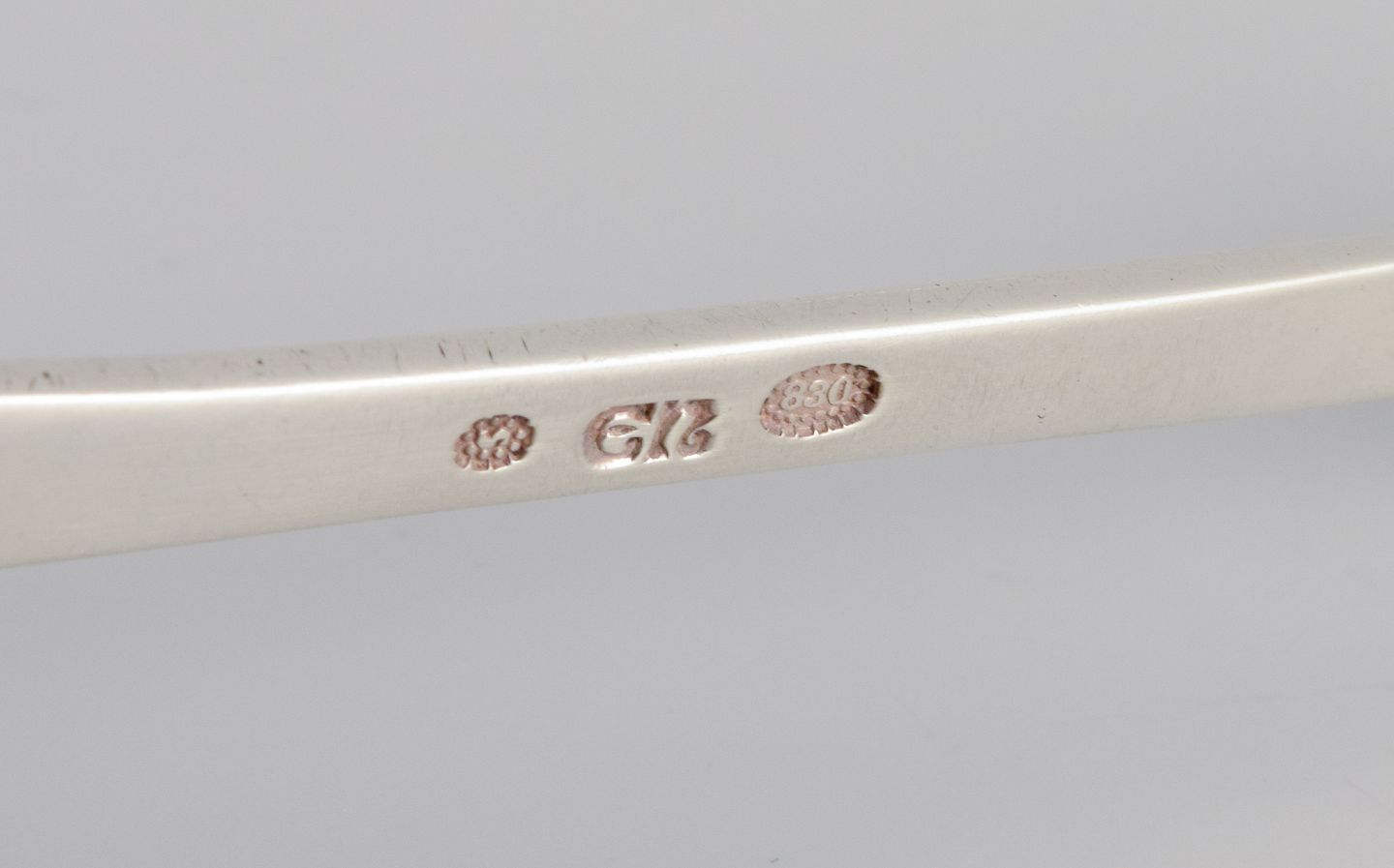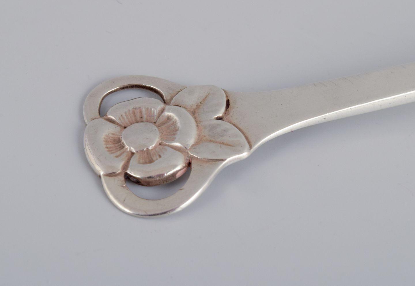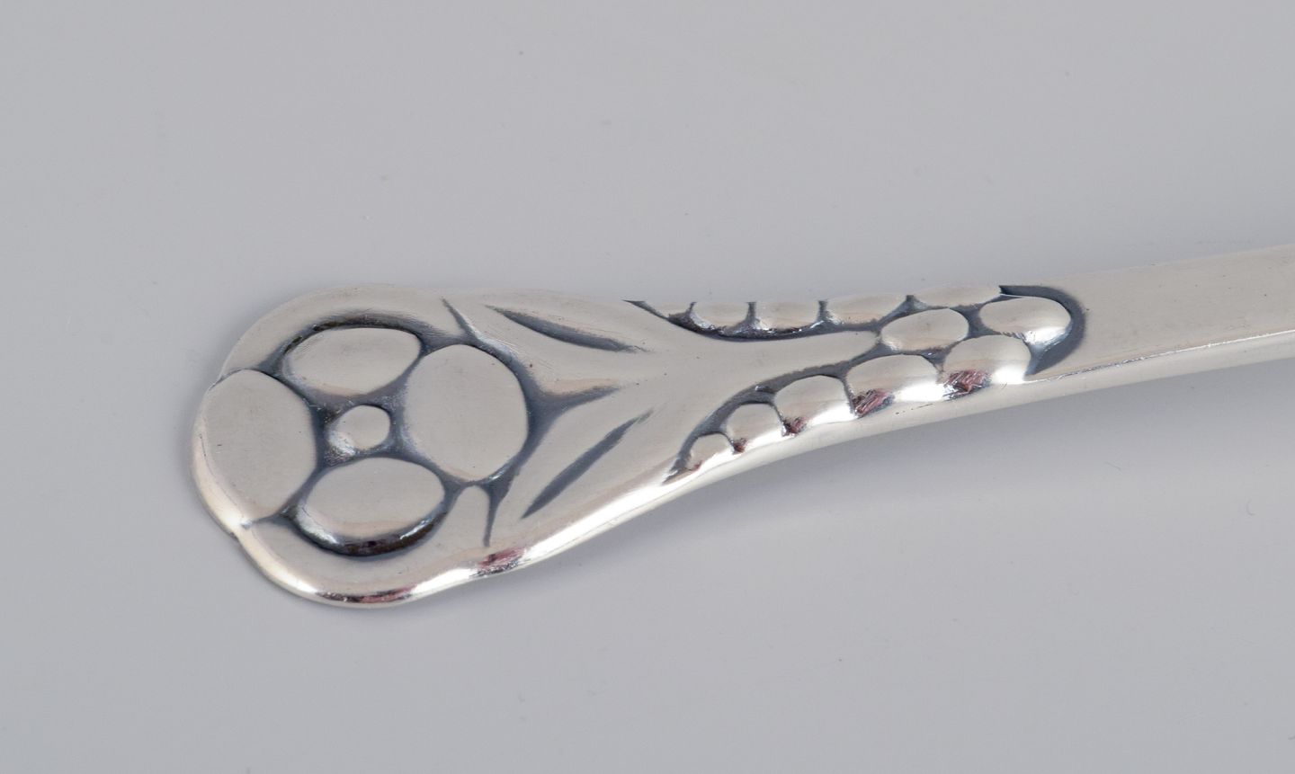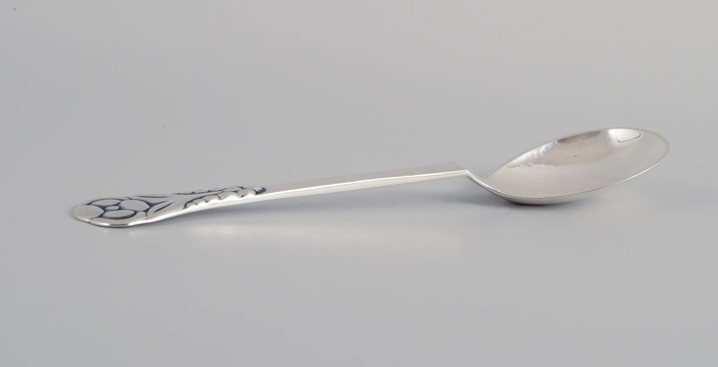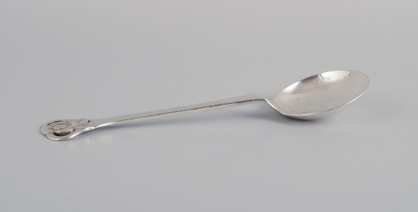 Evald Nielsen, dansk sølvsmed, to store skønvirke hammerslået sukkerskeer i tretårnet sølv (830). Den ene dateret 1913. Stemplet. I flot stand. Længste ske: L 16,2 cm.
