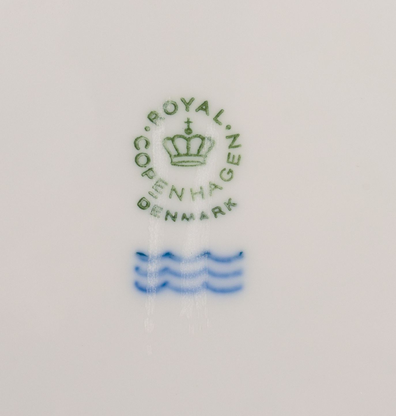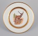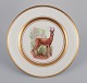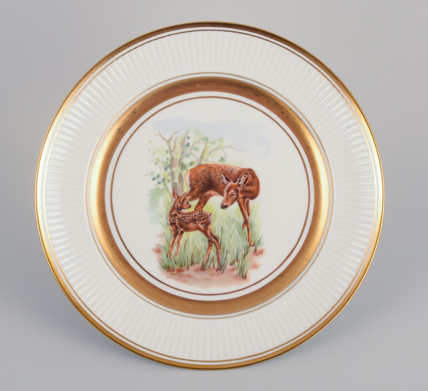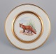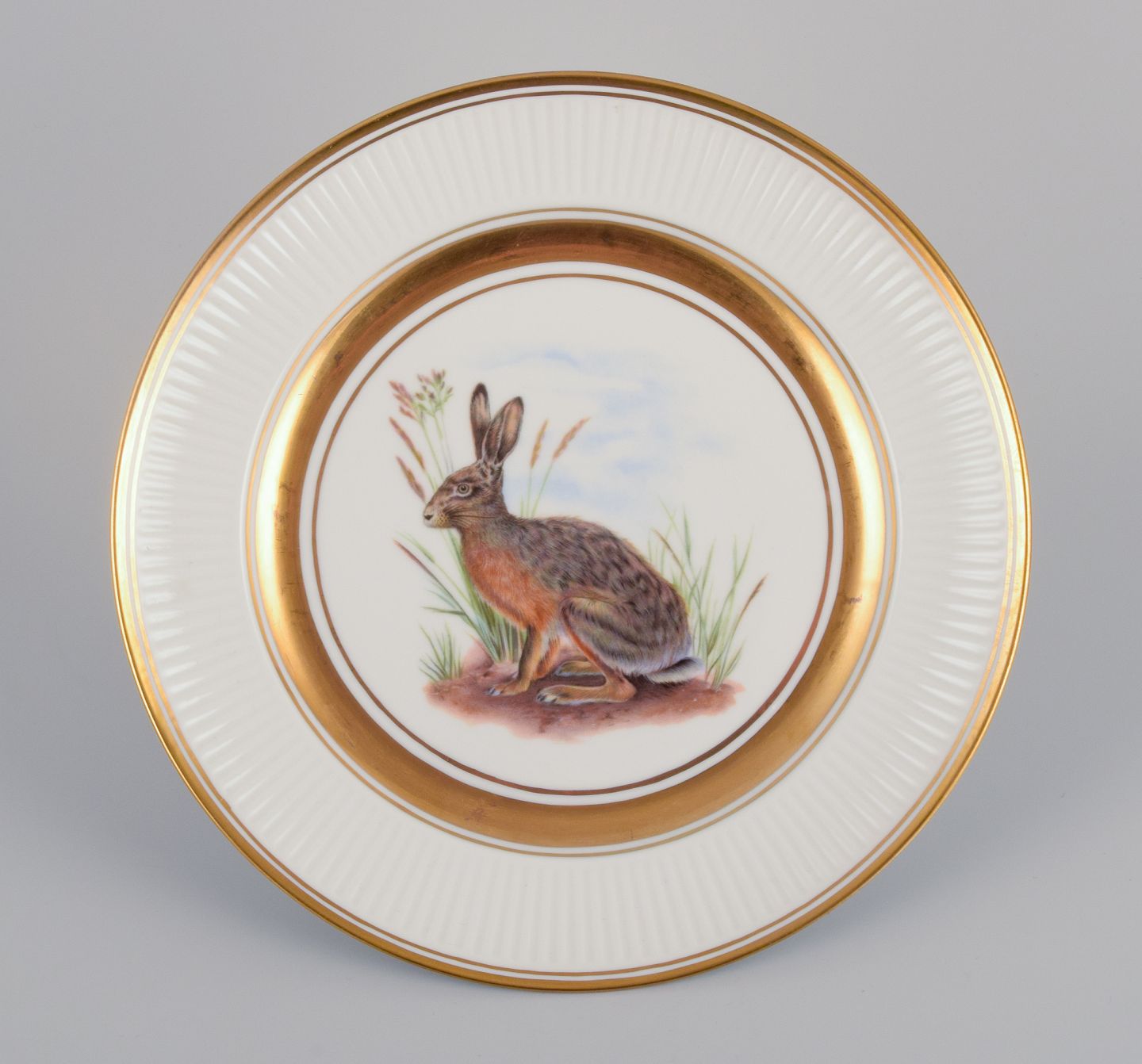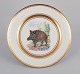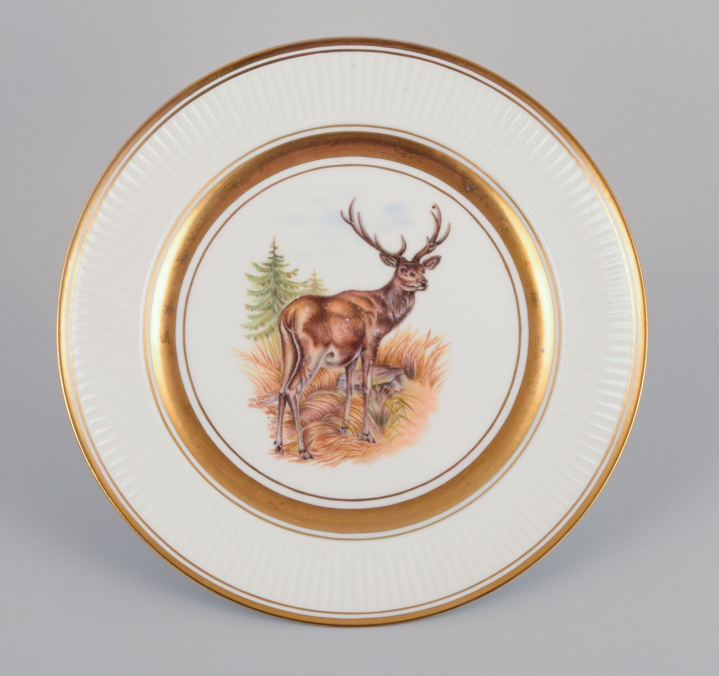 Royal Copenhagen, seks fauna danica stil middagstallerkner håndmalet med dyremotiver. Dekoreret med guldkant. 1960’erne. I god stand med brugsspor. Tredje sortering. Stemplet. Mål: D 25,0 cm.