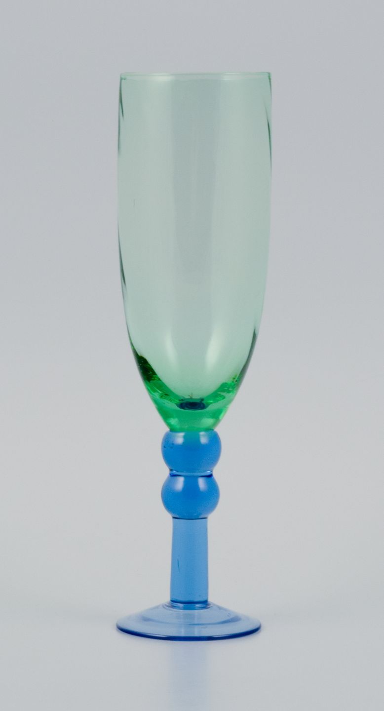 Skandinavisk glaskunstner, et sæt på seks mundblæste champagneglas i grønt og blåt glas.