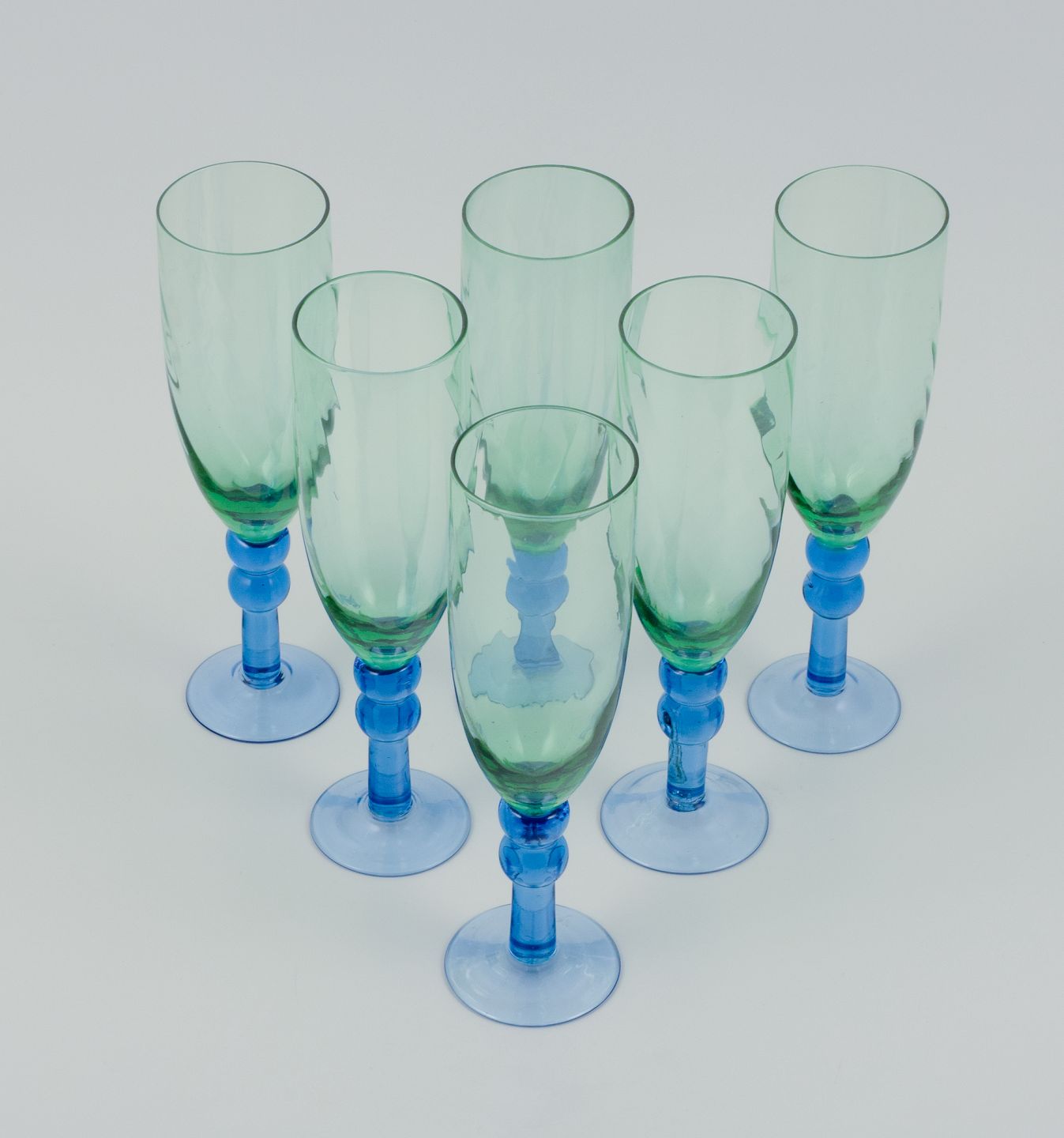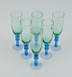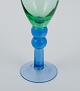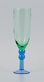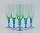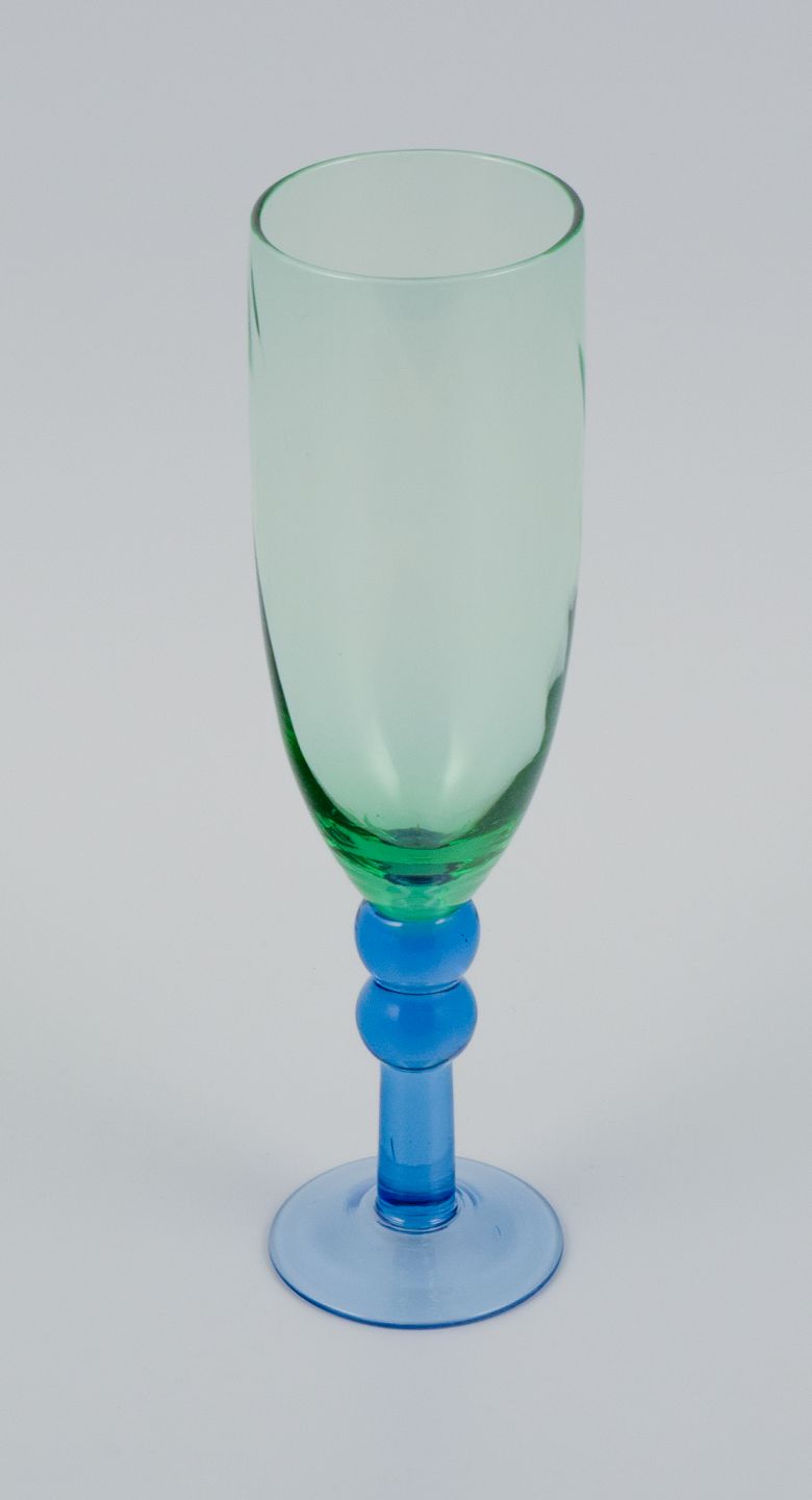 Skandinavisk glaskunstner, et sæt på seks mundblæste champagneglas i grønt og blåt glas. Sent 1900-tallet. I perfekt stand. Mål: H 22,0 x D 6,0 cm.